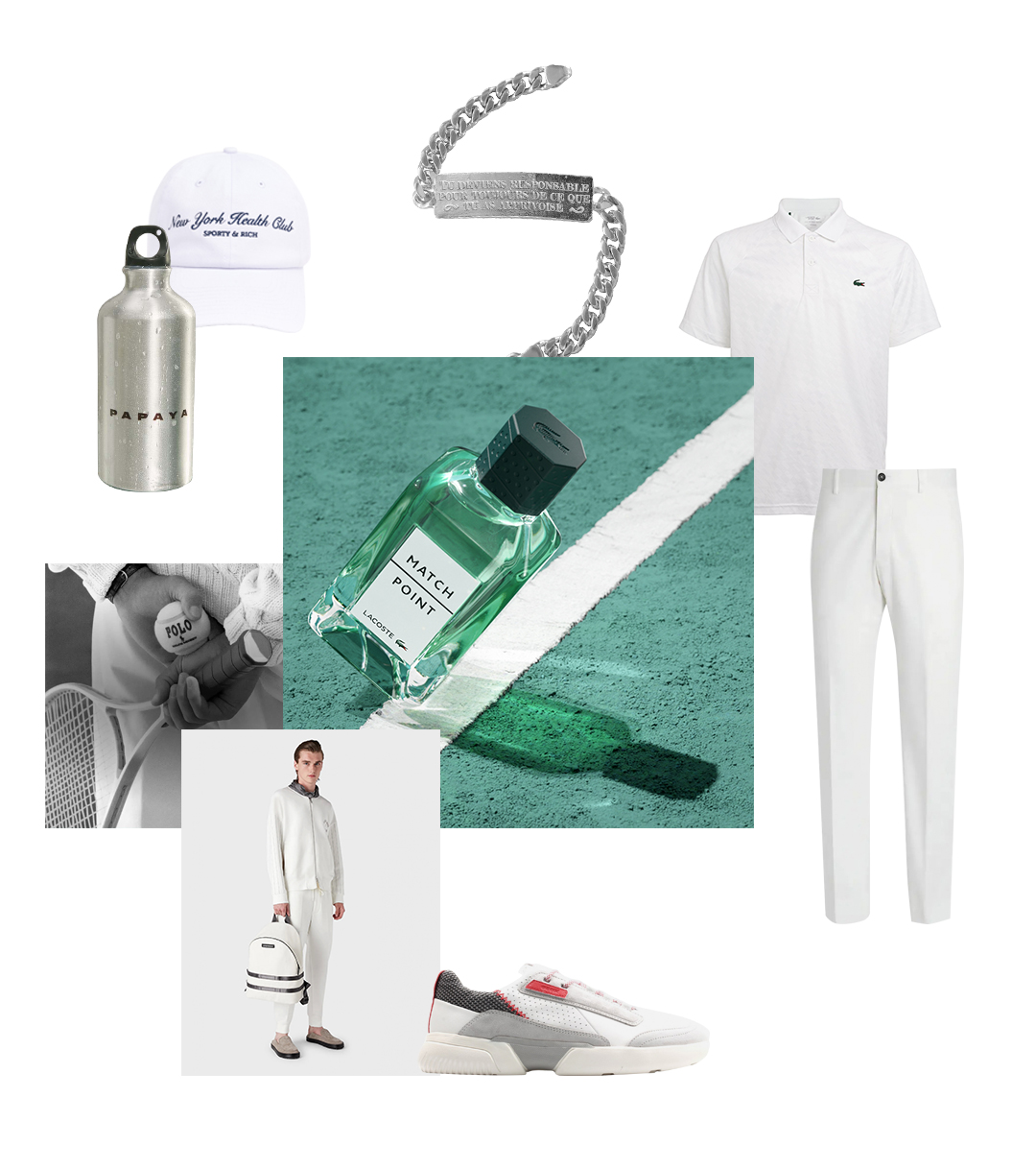 Polo Ralph Lauren, Emporio Armani. Футболка, Lacoste Х Novak Djok. Брюки, Zegna. Кросівки, Geox. Бейсболка, Sporty and Rich. Туалетна вода для чоловіків Lacoste Match Point, Lacoste. Пляшка для води для заняття спортом, Papaya. Срібний браслет "Екзюпері", Ювелірний Дім ZARINA.