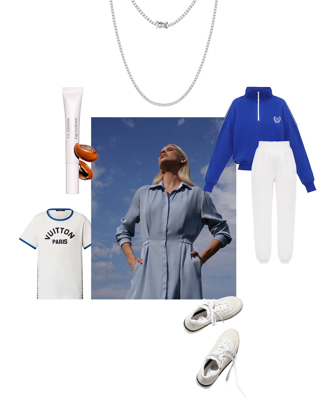 Кросівки, Chanel. Тенісний чокер, срібло, колекція Silver base, Ювелірний Дім ZARINA. Блиск для губ та щік Clarins Lip Perfector, Clarins.