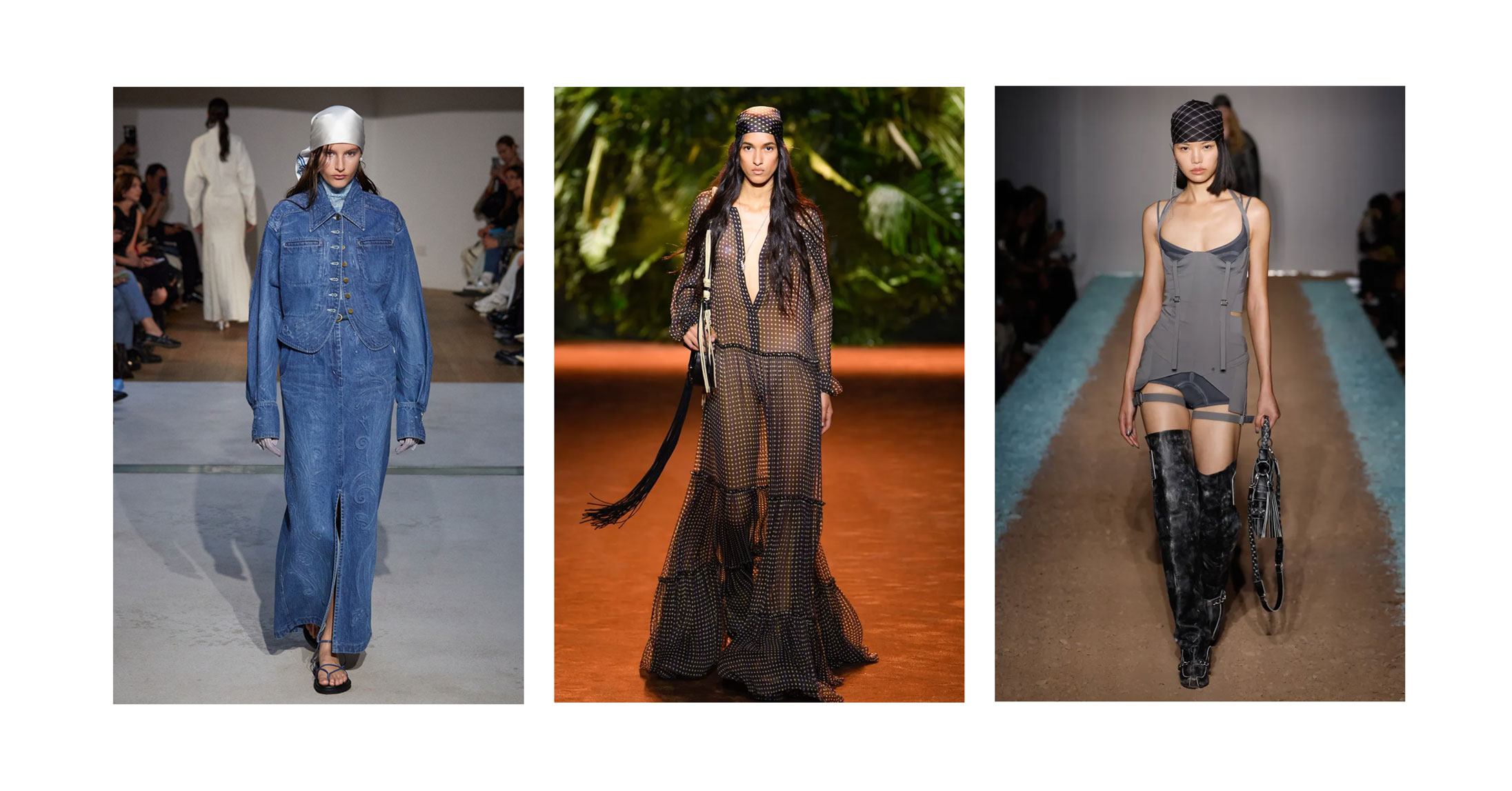 Для «гарячіших» днів натхненням стане образ в стилі бохо від Roberto Cavalli, що складається з легкої струмливої максісукні в горошок й сумки з торочками. Водночас у разі прохолодної погоди біла бандана буде гармонічним доповненням в повністю денімовому образі, як у Mame Kurogouchi.