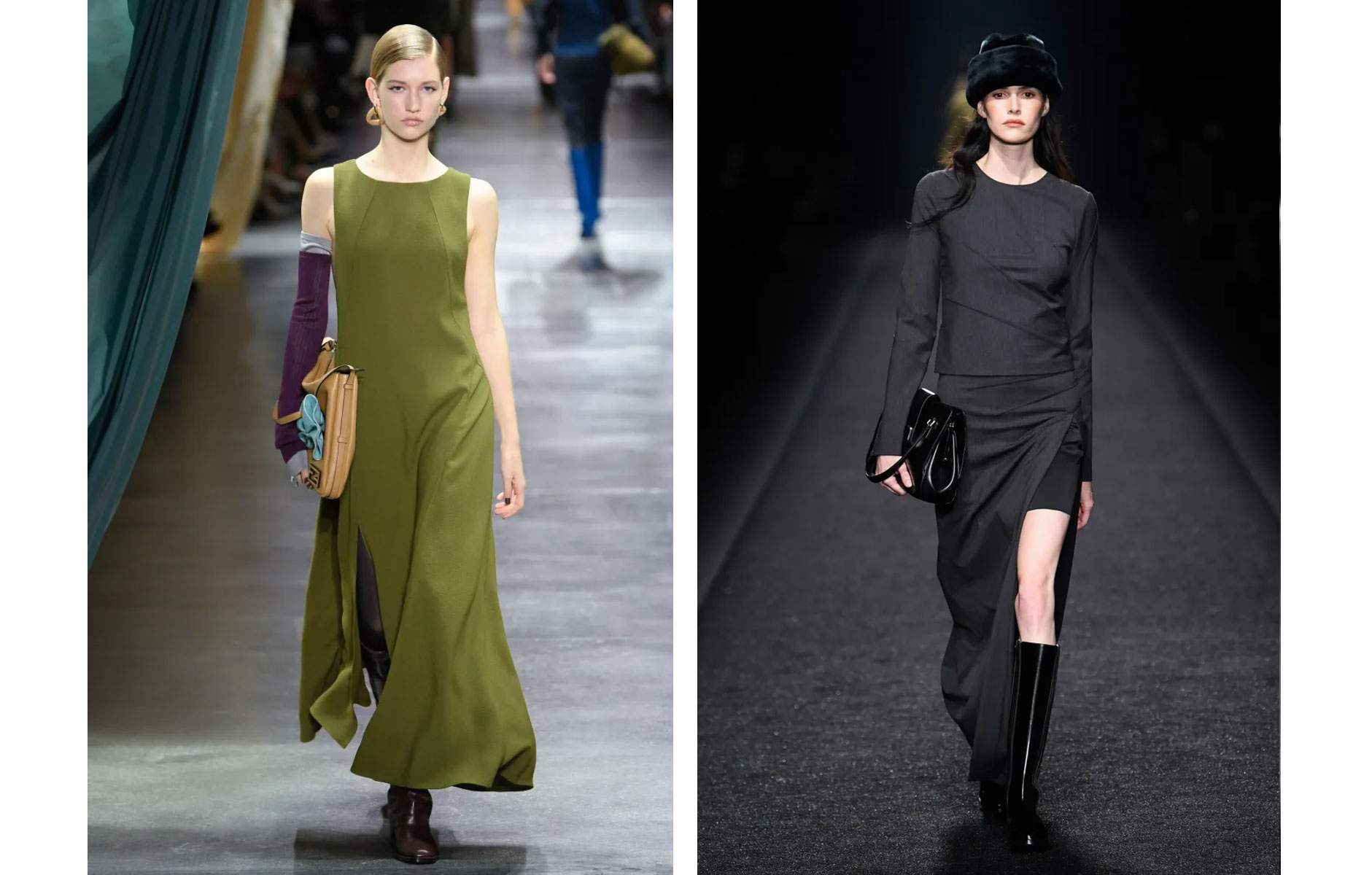 Щоб додати ноту спокусливості в ансамбль із високими чоботами, варто звернути увагу на спідниці й сукні з розрізом. На подіумі Alberta Ferretti таке взуття елегантно римується з сірими драпірованими спідницею й верхом. Fendi ж роблять ставку на максісукню в трендовому оливковому кольорі, рукавицю на одну руку та тренд на дві сумки.