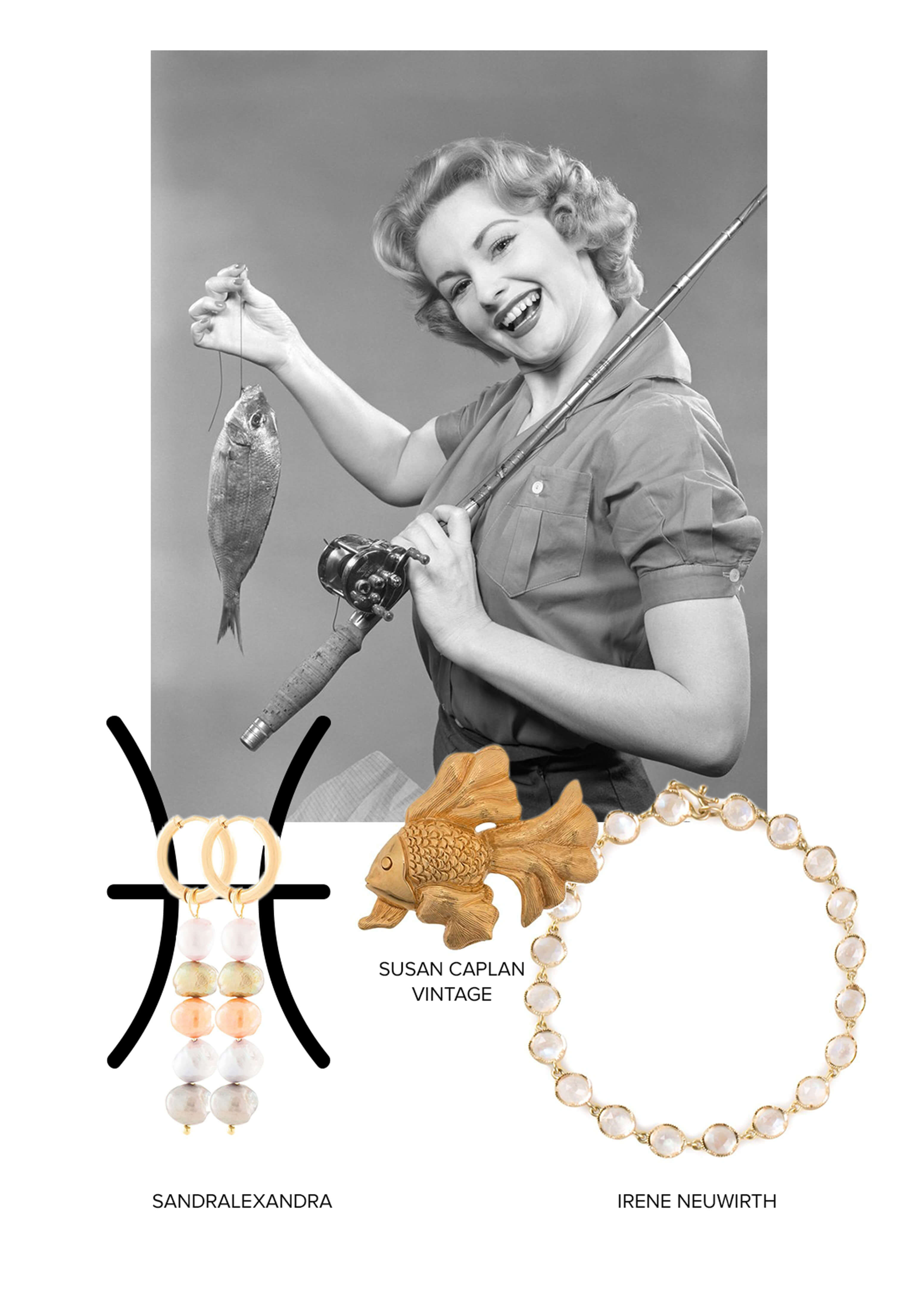 Для мечтателей, идеалистов и ценителей природных сил, которыми являются Рыбы, лучшими оберегами станут лунный камень, который так изящно вписан в золотой браслет Irene Neuwirth, и жемчуг. Лунный камень помогает сохранять хладнокровие в стрессовых ситуациях и принимать взвешенные решения. Винтажная брошь в виде золотой рыбки вполне может исполнить заветные желания.
