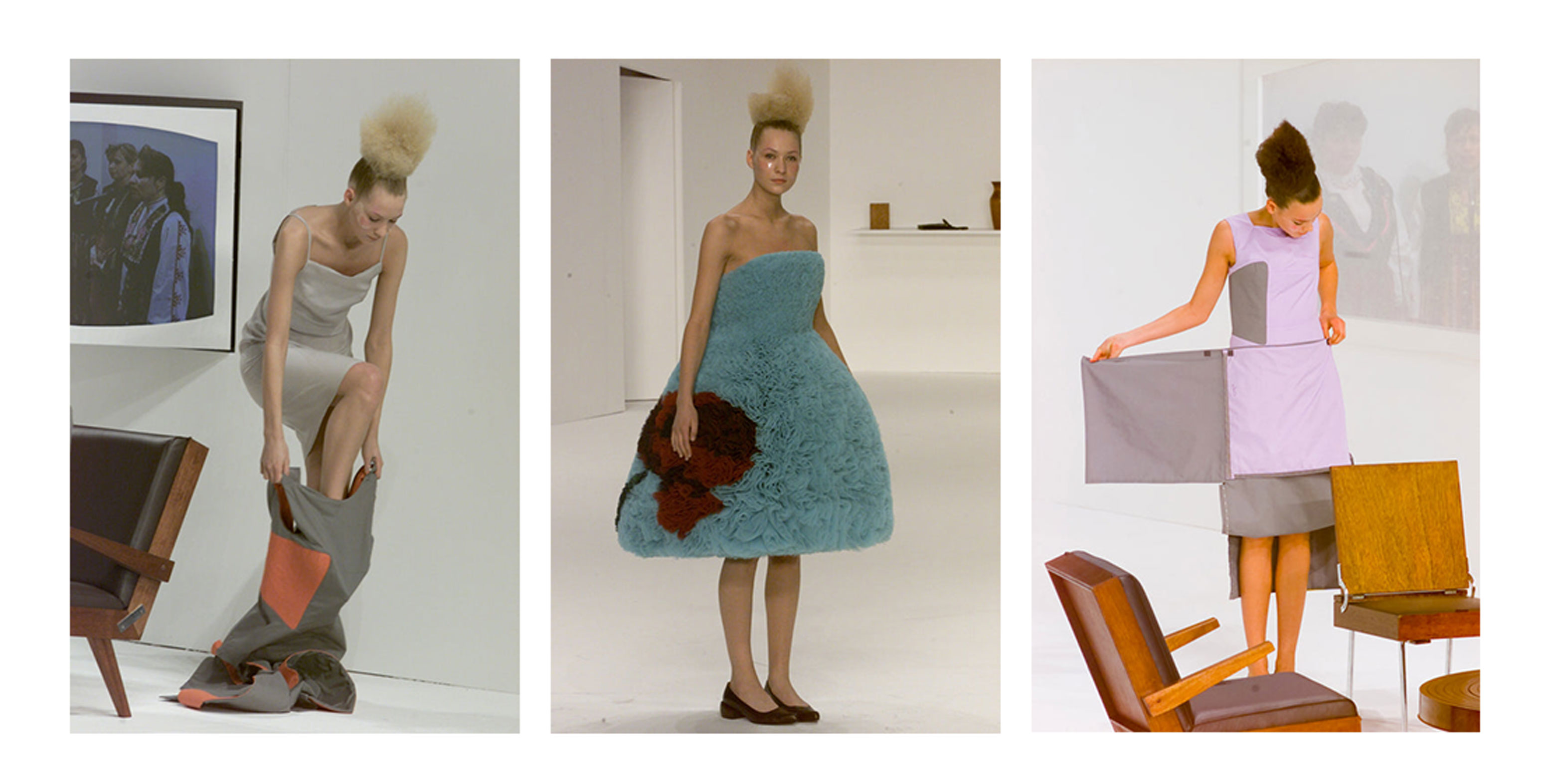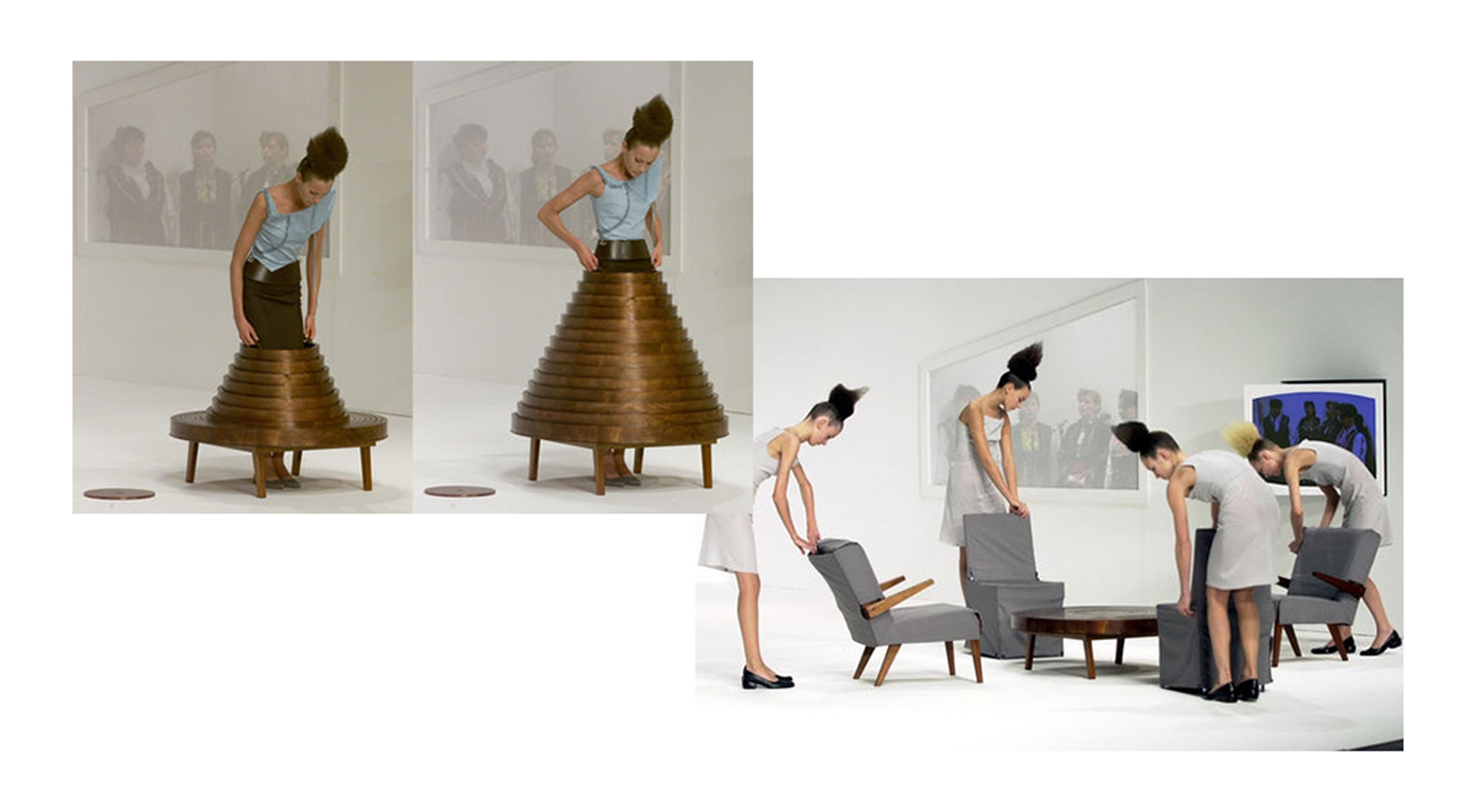 Згодом моделі починали забирати речі з полиці: в їхні продумано сконструйовано образи вони поміщалися з легкістю. Чотири манекенниці в сірих сукнях без декору підійшли до крісел, знімаючи з них чохли та вдягаючи їх. Трансформовані ними меблі невдовзі зазнали ще одного перетворення: їх склали у формі валізи.