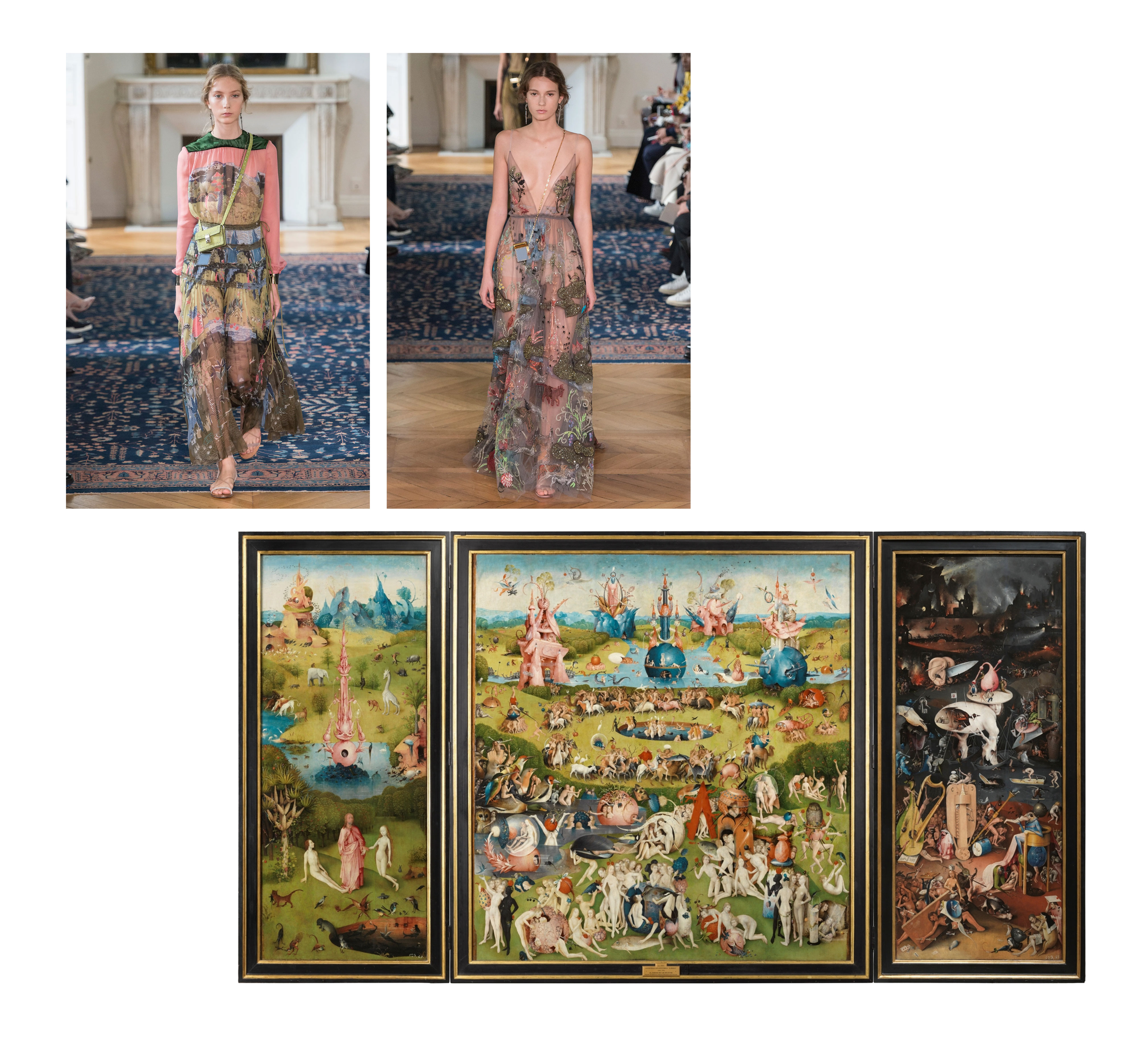 Фантастична, химерна й загадкова, та заразом найвідоміша робота художника Ієроніма Босха «Сад земних насолод» стала одним із джерел натхнення для колекції Valentino весна-літо 2017. Створений на початку XVI століття, цей триптих представника Північного Відродження знайшов своє відображення в принтах на напівпрозорих фентезійних сукнях. Зокрема, казкові тварини й рослини з картин прикрасили дизайни колекції, створеної тодішнім креативним директором П'єрпаоло Піччолі, знаним поціновувачем і дослідником доби Ренесансу.
