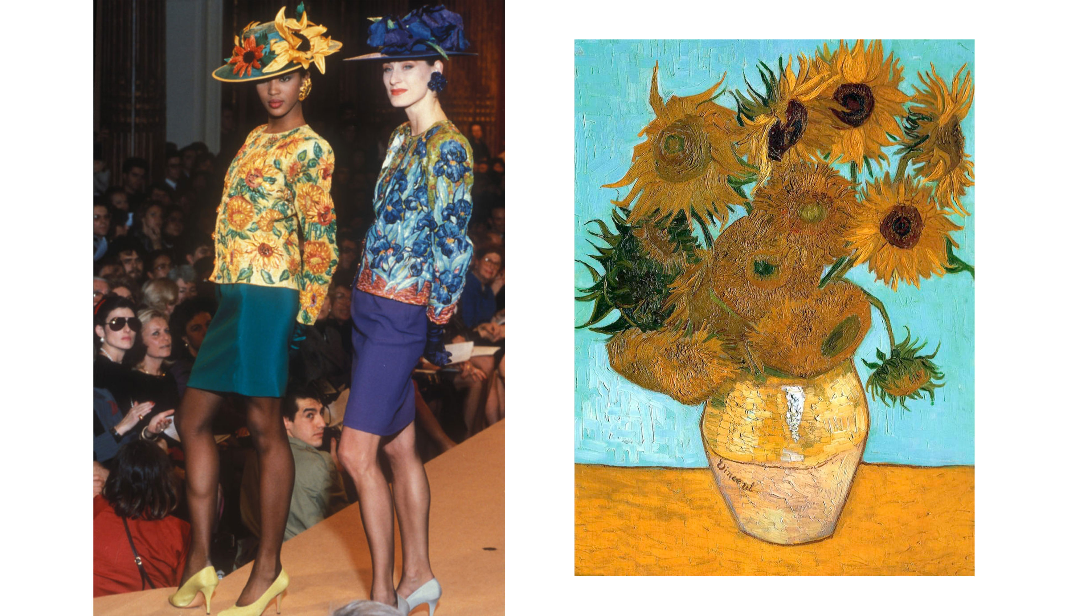 «Я завжди захоплювався живописом», — казав культовий дизайнер Ів Сен-Лоран. «Цілком природно, що він надихав мене на створення моїх творінь». У колекції весна-літо 1988 він представив триб’ют Анрі Матіссу, Жоржу Браку, Пабло Пікассо та Вінсенту Ван Гогу. Одним із видатних елементів колекції став жакет, який представила Наомі Кемпбелл, натхненний картиною «Соняхи» Вінсента Ван Гога. Його деталі були настільки нюансованими у квітах із бісеру, леліток, стрічок й перлів, що вимагали понад шістсот годин ручної роботи. Майстерність виконання жакета зумовила його цінність  — у 2019 його продали на аукціоні Christie's за 382,000 євро.