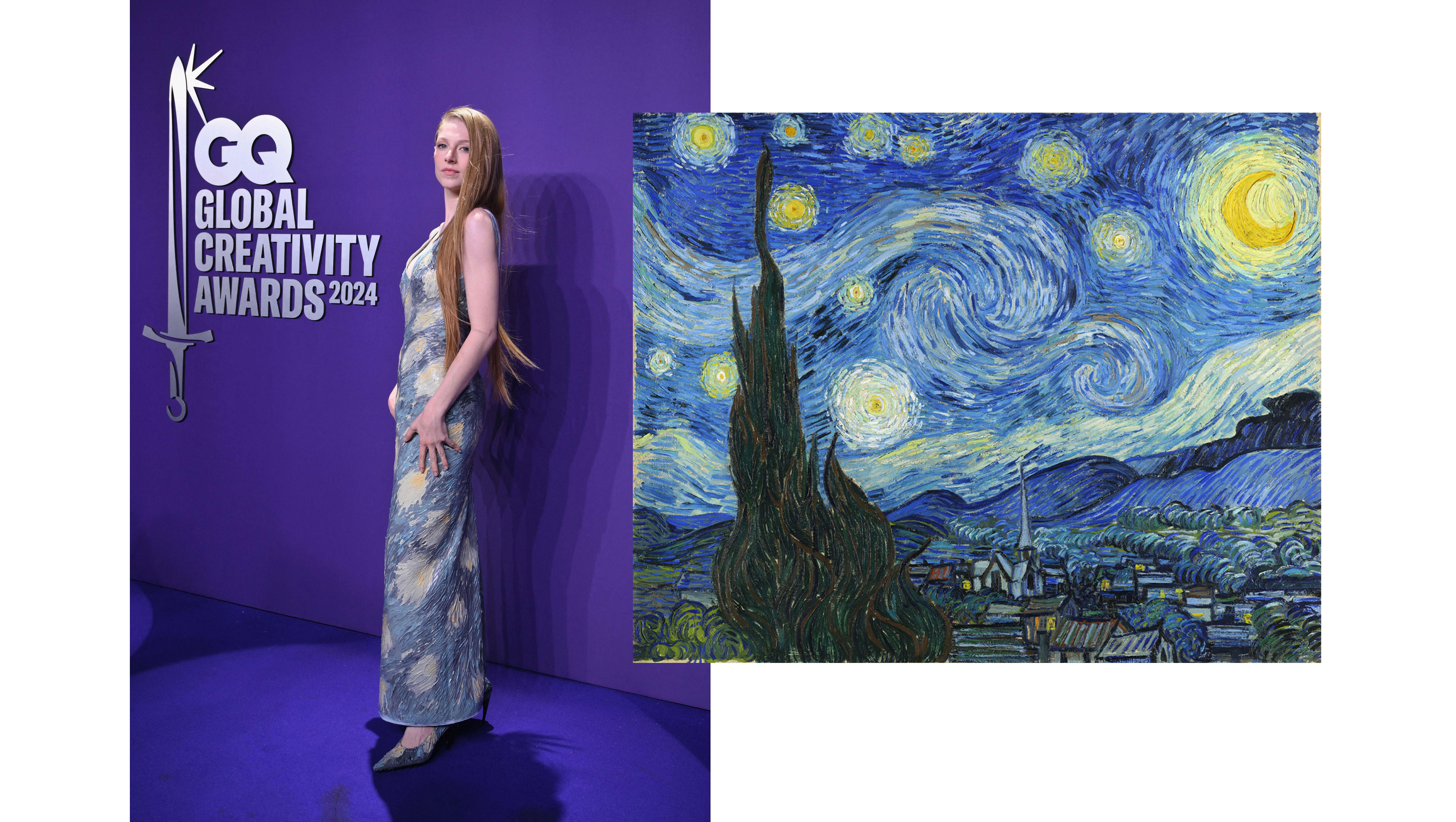 Стосунки моди й мистецтва вимірюються десятиліттями, тож, зрештою, і сьогодні дизайнери надихаються роботами видатних митців. Цього квітня акторка Гантер Шафер, зірка «Ейфорії» й приквелу «Голодних ігор», з’явилася на GQ Creativity Awards в сукні, натхненною однією з найвідоміших робіт художника Вінсента Ван Гога — «Зоряною ніччю» 1889 року. Створене італійським домом Marni, вбрання також виступило окремою артроботою: на звичайну світло-блакитну сукню було нанесено товсті мазки фарби, що дозволило створити тривимірний ефект.