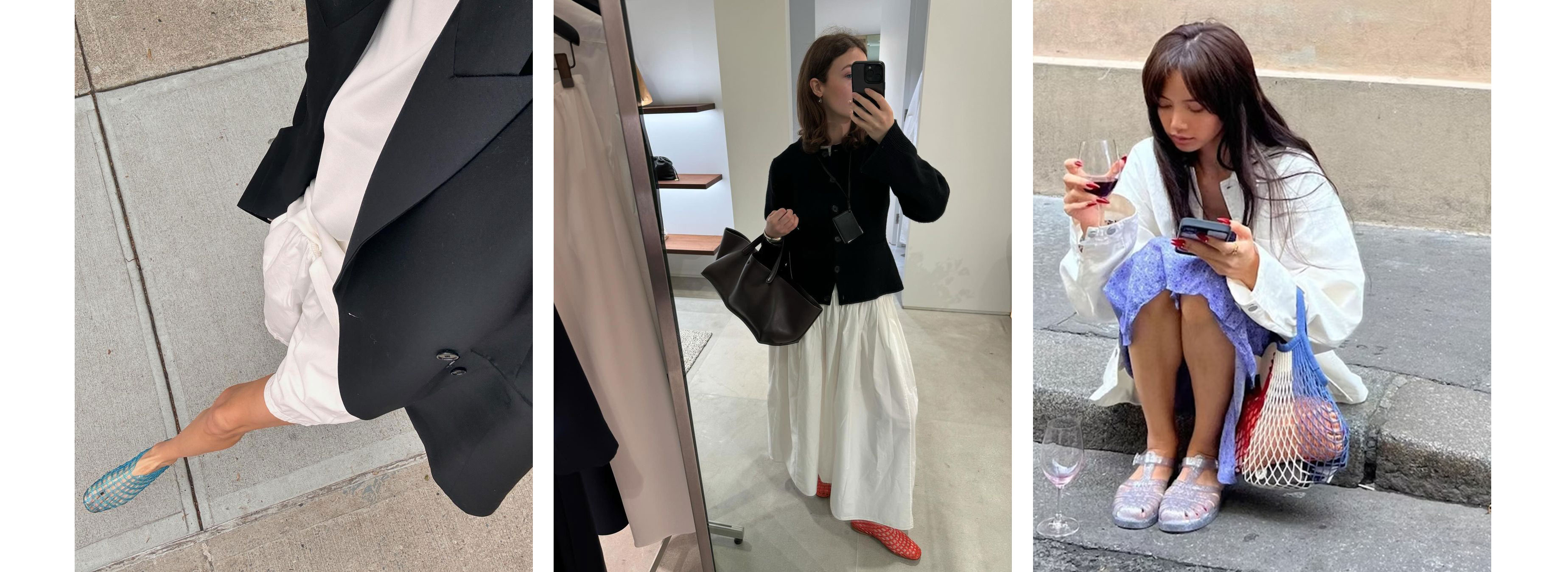 Поза подіумом інфлюенсерки також продемонстрували актуальні стилізації вірального взуття. Так, «желейні» сандалі стануть ідеальним супутником в ансамблі з чорним оверсайз блейзером і білими бермудами, а колір моделі, зокрема блакитний чи червоний, додасть в образ такої необхідної літньої грайливості. Ця модна композиція матиме не менш трендовий ритм, якщо також надати перевагу просторій максіспідниці світлих відтінків. Якщо ж ви плануєте романтичну вилазку, вільна за силуетом сукня в поєднанні з легким жакетом і «желейними» сандалями — це ще одна модна формула, на яку варто звернути увагу.