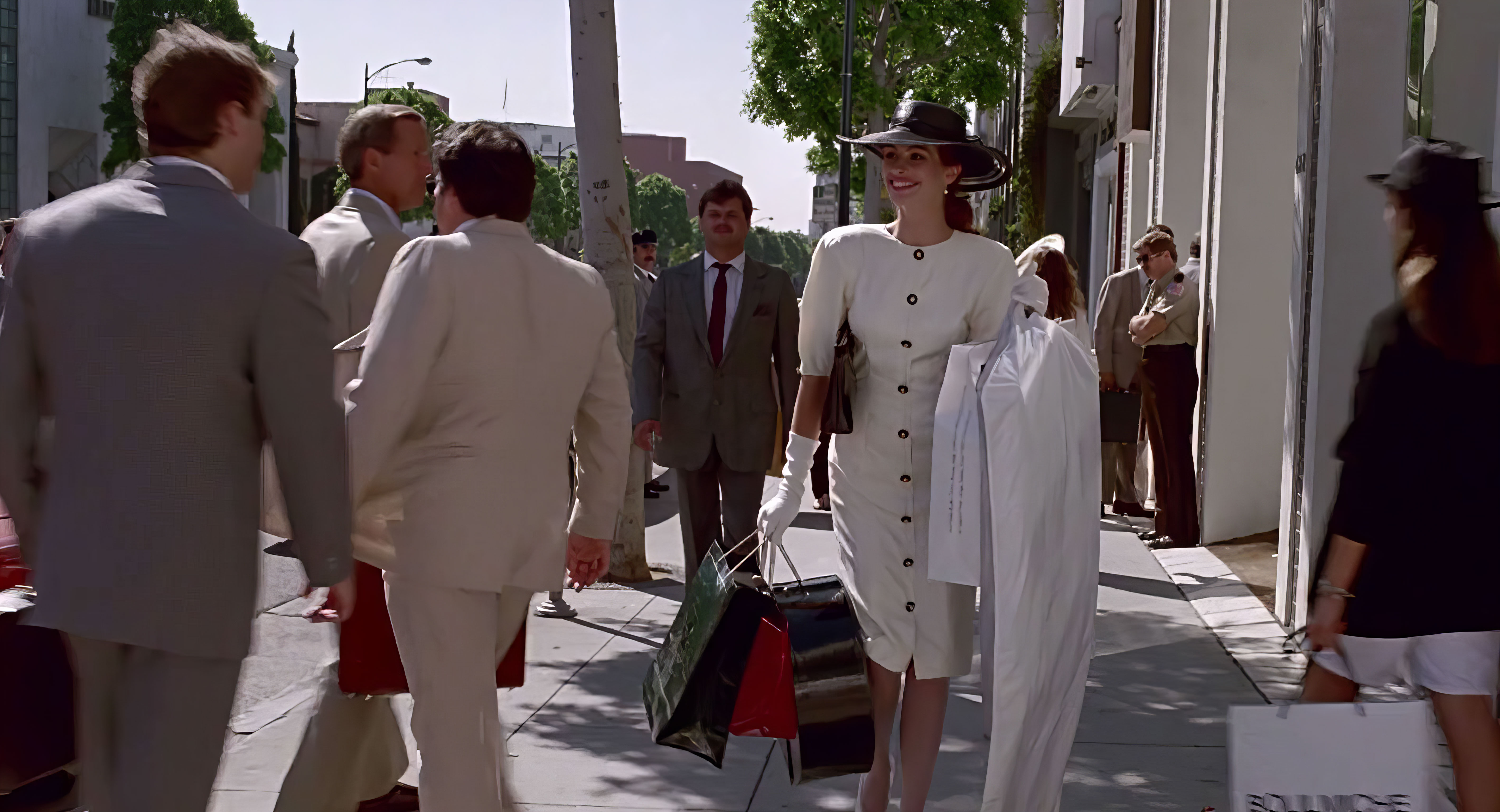 У фільмі для того, щоб героїня змогла увійти у світ свого нового знайомого бізнесмена, вона розпочинає модну трансформацію. Персонажка заходить у вишуканий бутик, де їй відмовляють в обслуговуванні. Проте згодом продавчині ще «пошкодують» про своє рішення. Коли Вівіан іконічно повертається туди в елегантній сукні з наплічниками, білими рукавичками й чорному капелюсі з широкими полями, то говорить, що ті припустилися «великої помилки».