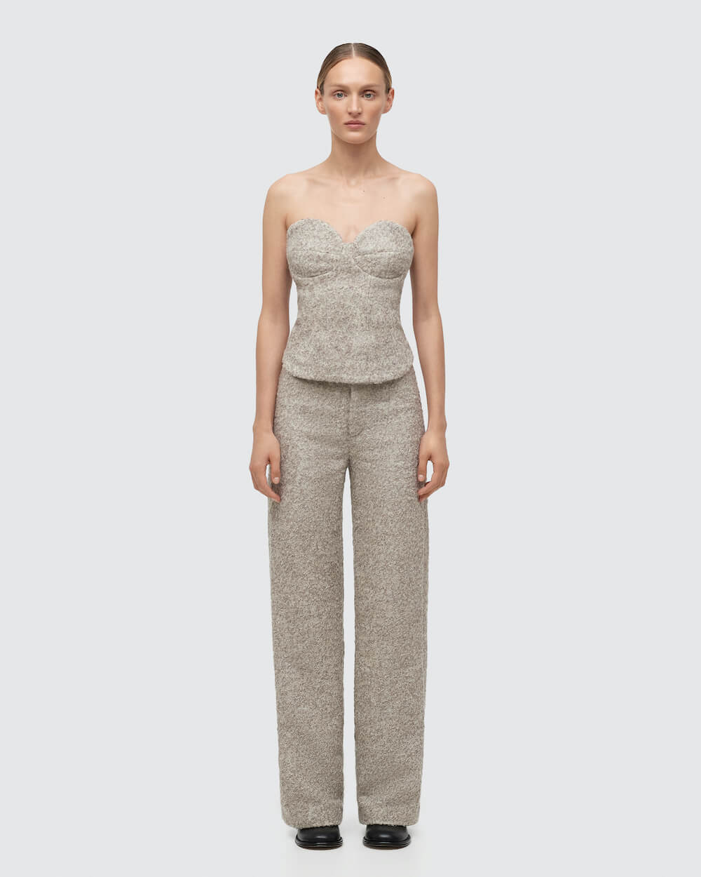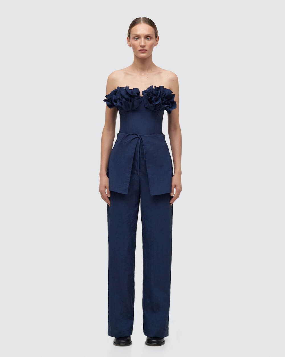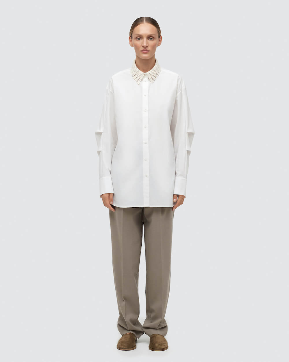 Команда бренду продовжує варіювати знакові для Katimo моделі й техніки та представляє пряму сукню-сорочку довжини міді, спідницю та брюки з декоративною баскою, брючні костюми з жакетами на запах, а також сукню та сорочки зі зв’язаними гачком вставками. Арт-корсет, який став бестселером літньої капсули, знову з’являється в лінійці одягу не тільки в якості окремої одиниці, а й як декоративний елемент сукні-бюст’є.