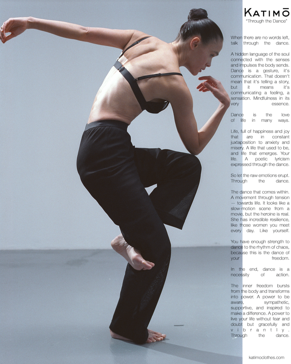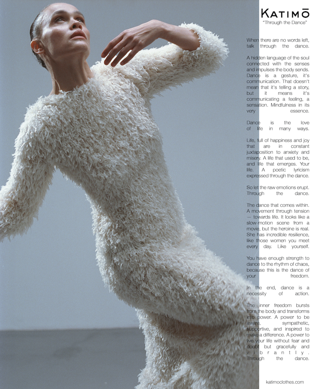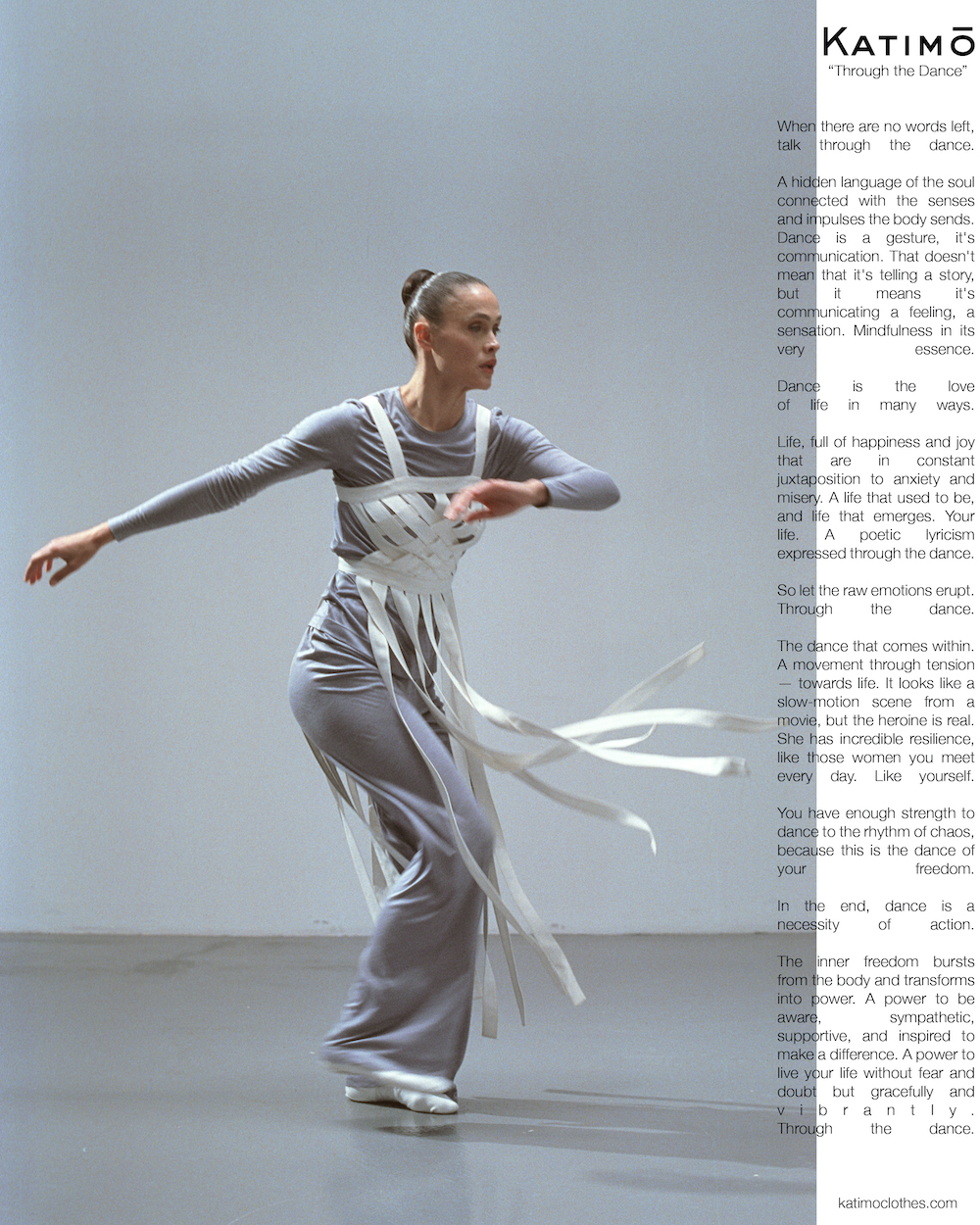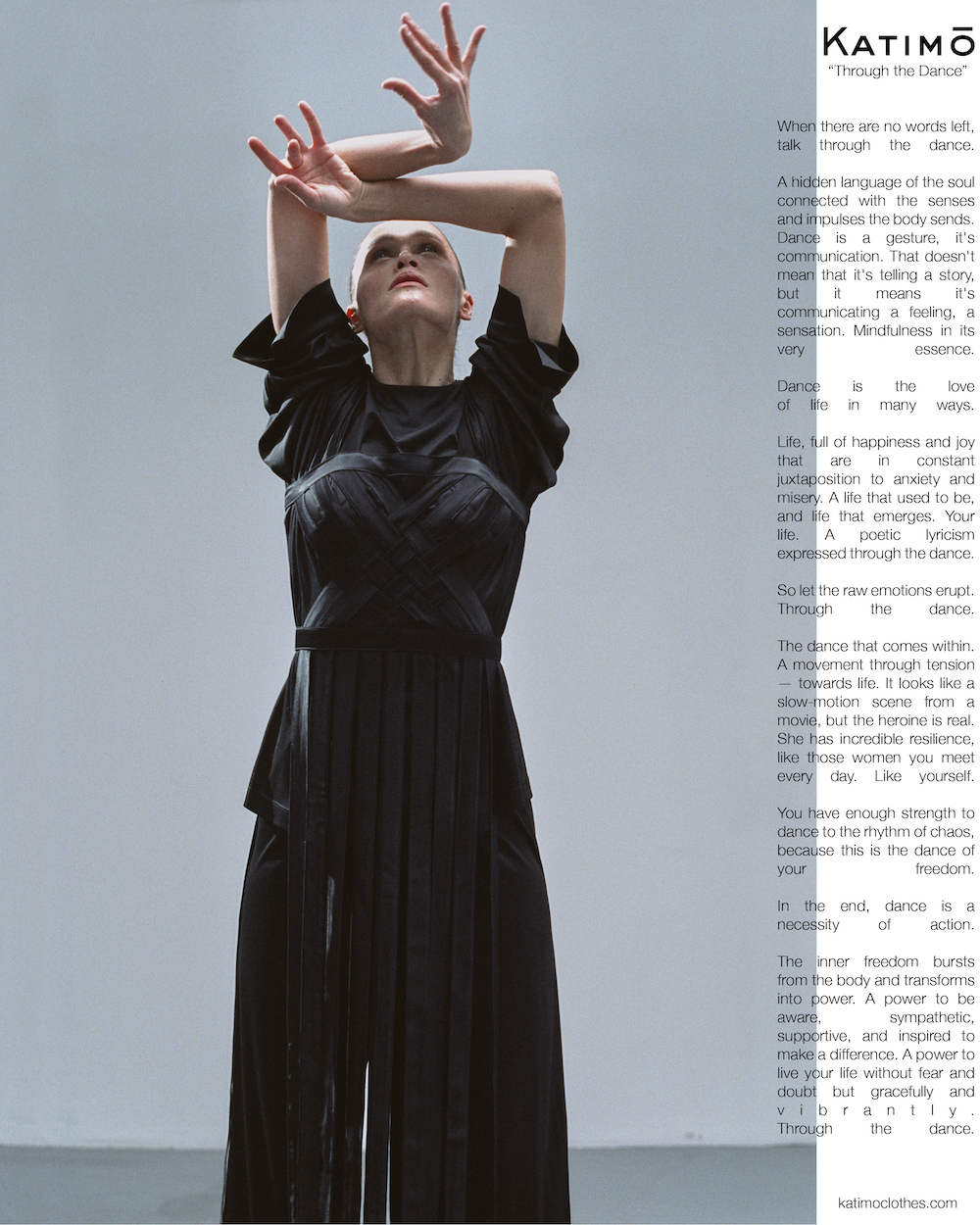 "Інтелектуальне прочитання гардероба проголошує комфорт та забезпечує свободу рухів, наче вбрання для особливого жіночого танцю. Це схоже на slow-motion сцену з фільму, але ця героїня Katimo — реальна. Вона має несамовиту стійкість, як ті жінки, котрі зустрічаються нам кожного дня. Як ми самі. Вони мають достатньо сили, щоб танцювати у ритмі хаосу, адже це танець їх свободи", — розповідають у Katimo.
