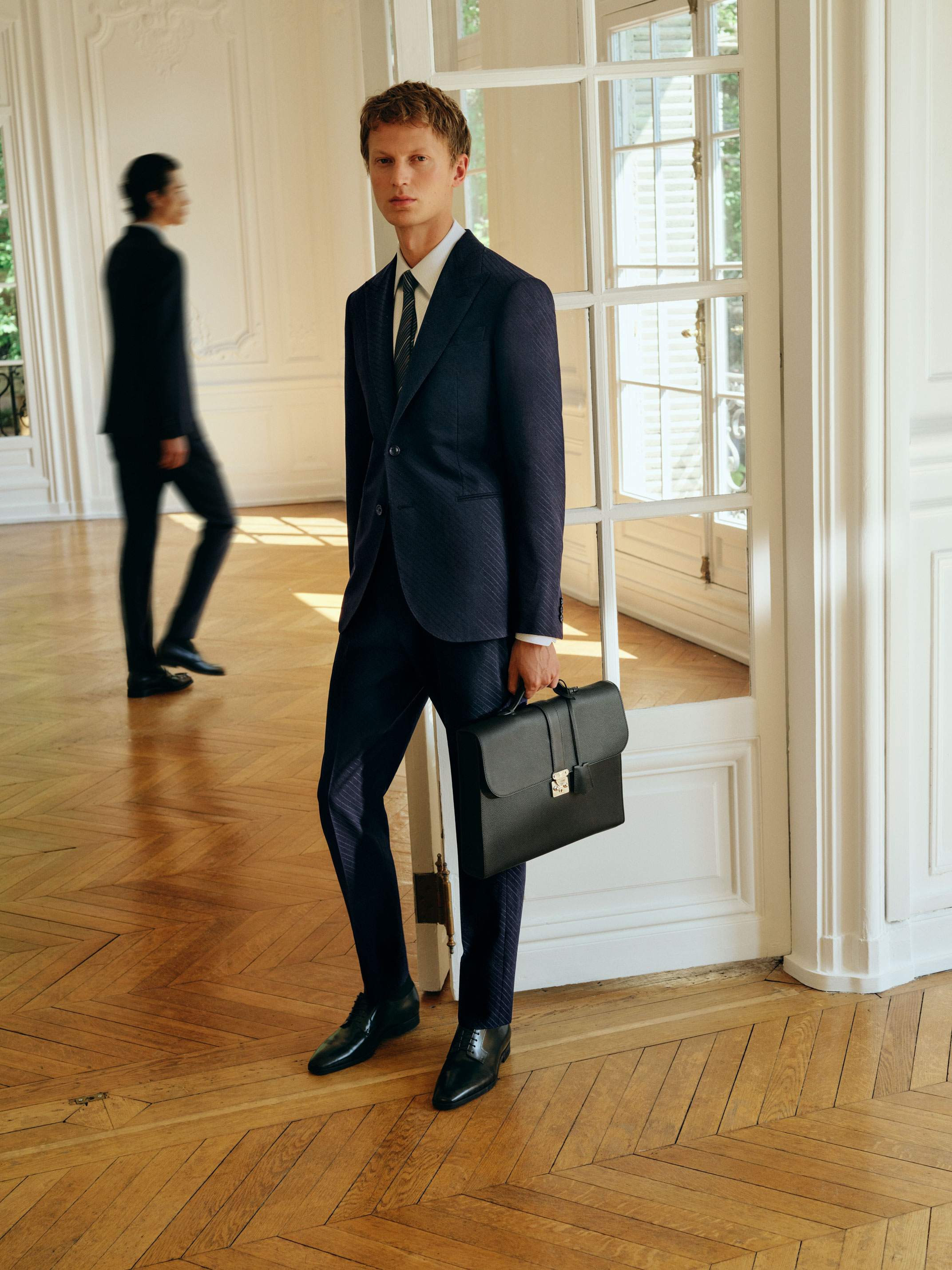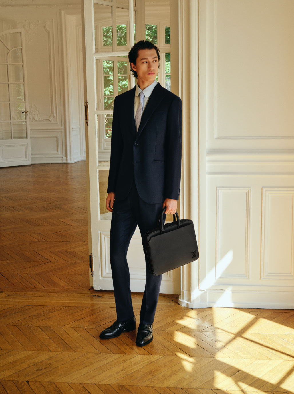 Оксфордські сорочки зі скошеними комірцями й манжетами — це речі, які доповнюють елегантні айтеми, як і чорний або сірий двосторонній бомбер. Серед аксесуарів — функціональний портфель LV Aerogram Pilot Briefcase, ідеальна для ділового ансамблю сумка Fastline Messenger, краватки й дармовиси зі шкіряними ручками. А також знамениті моделі сумок Keepall, Aerogram Lock та нова Georges. Завершити образ покликане взуття: дербі Voltaire із глазурованою телячою шкірою, мокасини Sorbonne та шкіряні класичні черевики Chelsea та Richelieus.
