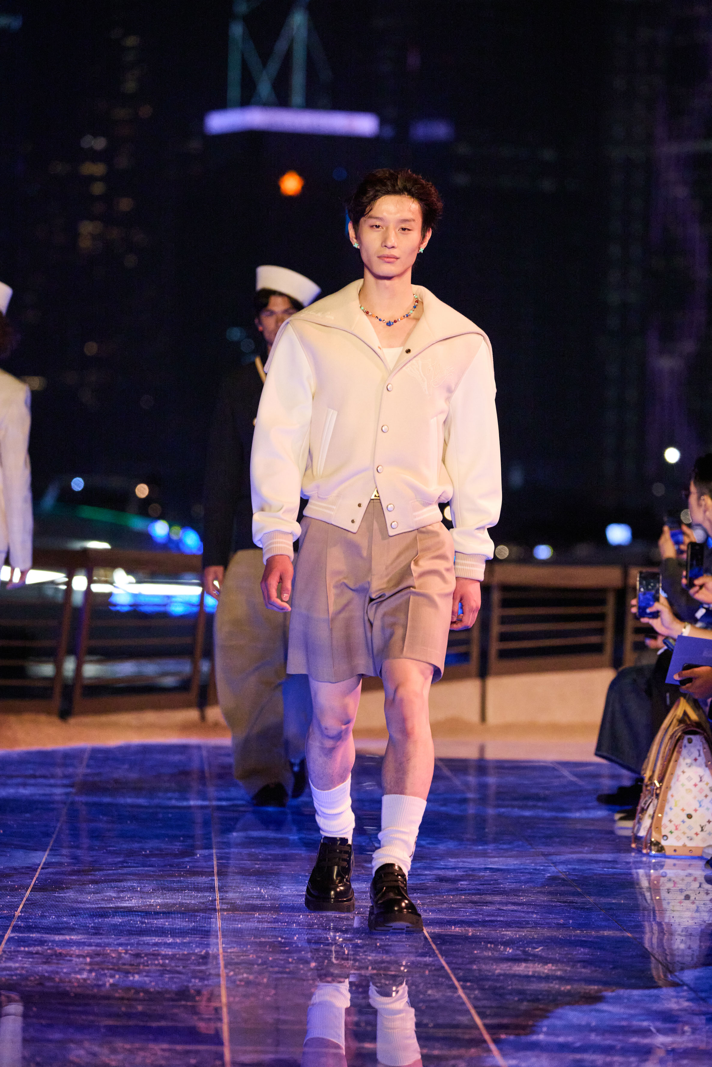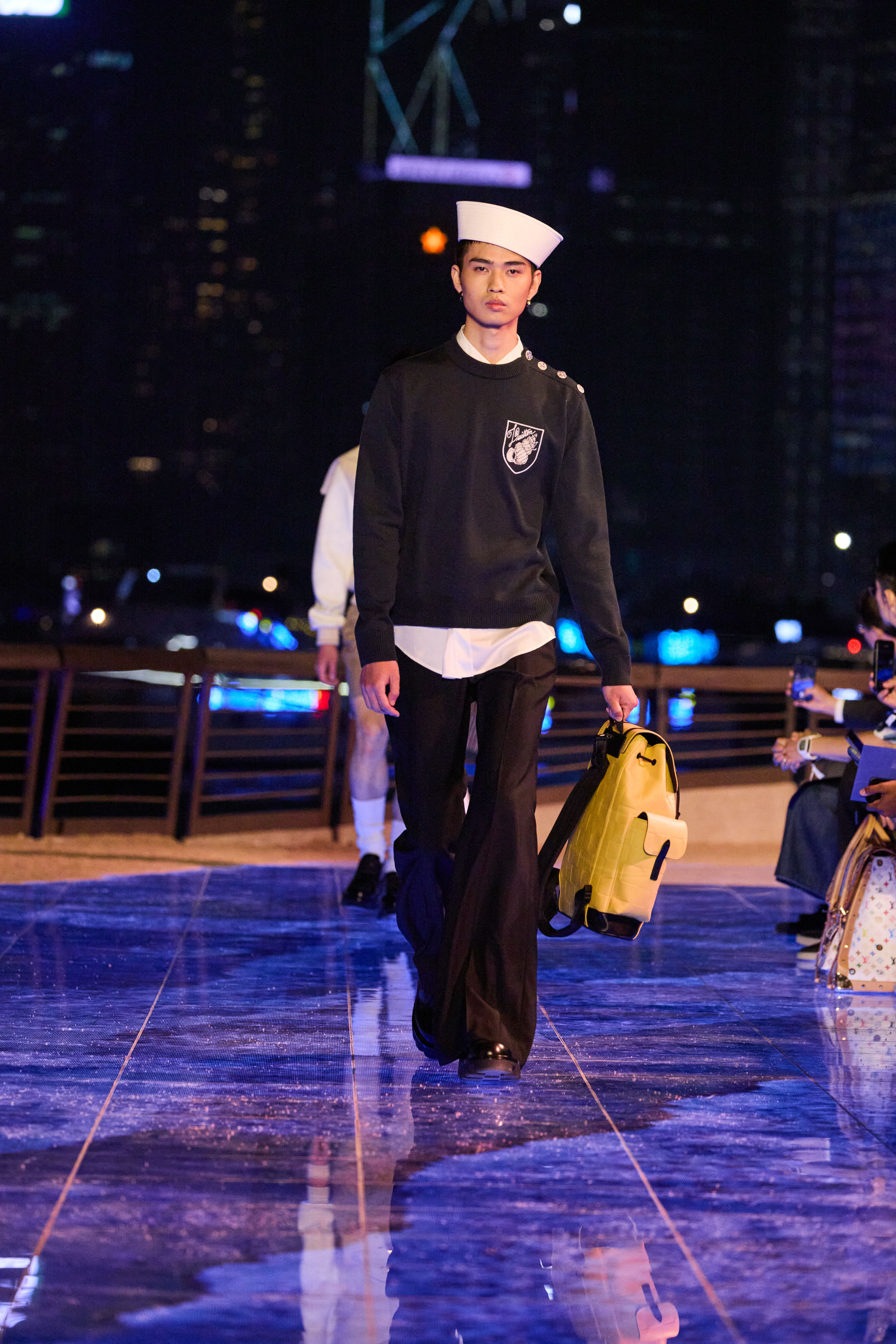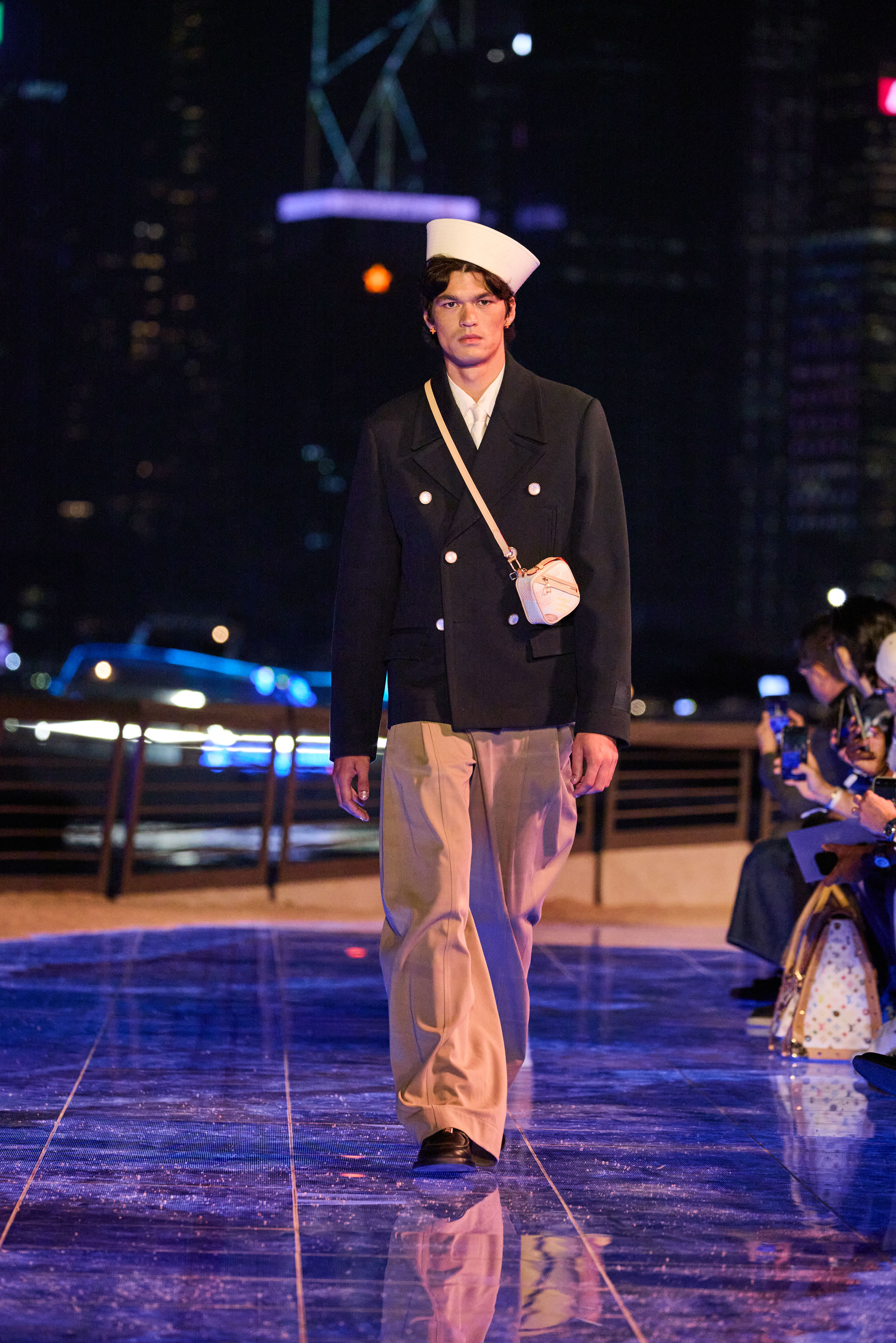 Під музичний супровід укулеле та морських хвиль з’явився перший образ денді-моряка, морська уніформа якого обігрувалася в різноманітних ітераціях – від смугастих двобортних костюмів з розкльошеними штанами або шортами до сюртуків з перлинними гудзиками. Мотиви смужки, відтворені в мініатюрних низках перлів, філігранно викладено на двобортному чорному пальто. Вишиті візерунки мушель стилістично доповнюють спортивні куртки з матроським коміром. Новий логотип infinity LV, немов загратований сіткою, з'являється на в’язаному кардигані, жакардовому костюмі та нейлонових рукавах шкіряної куртки.