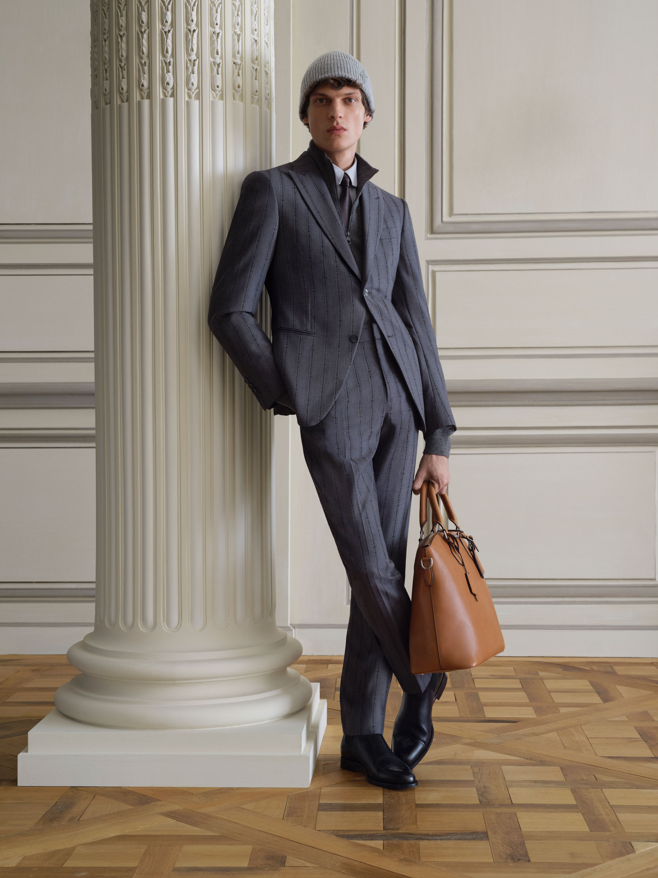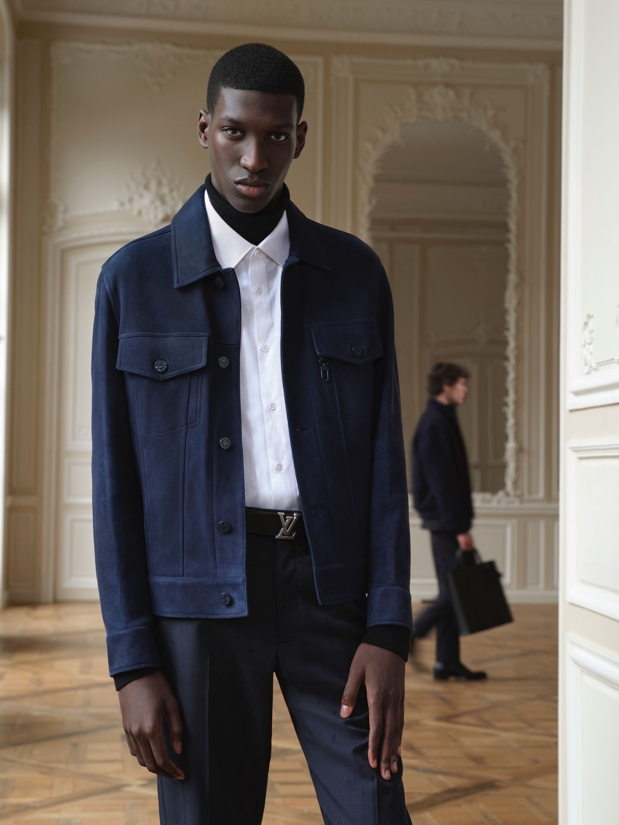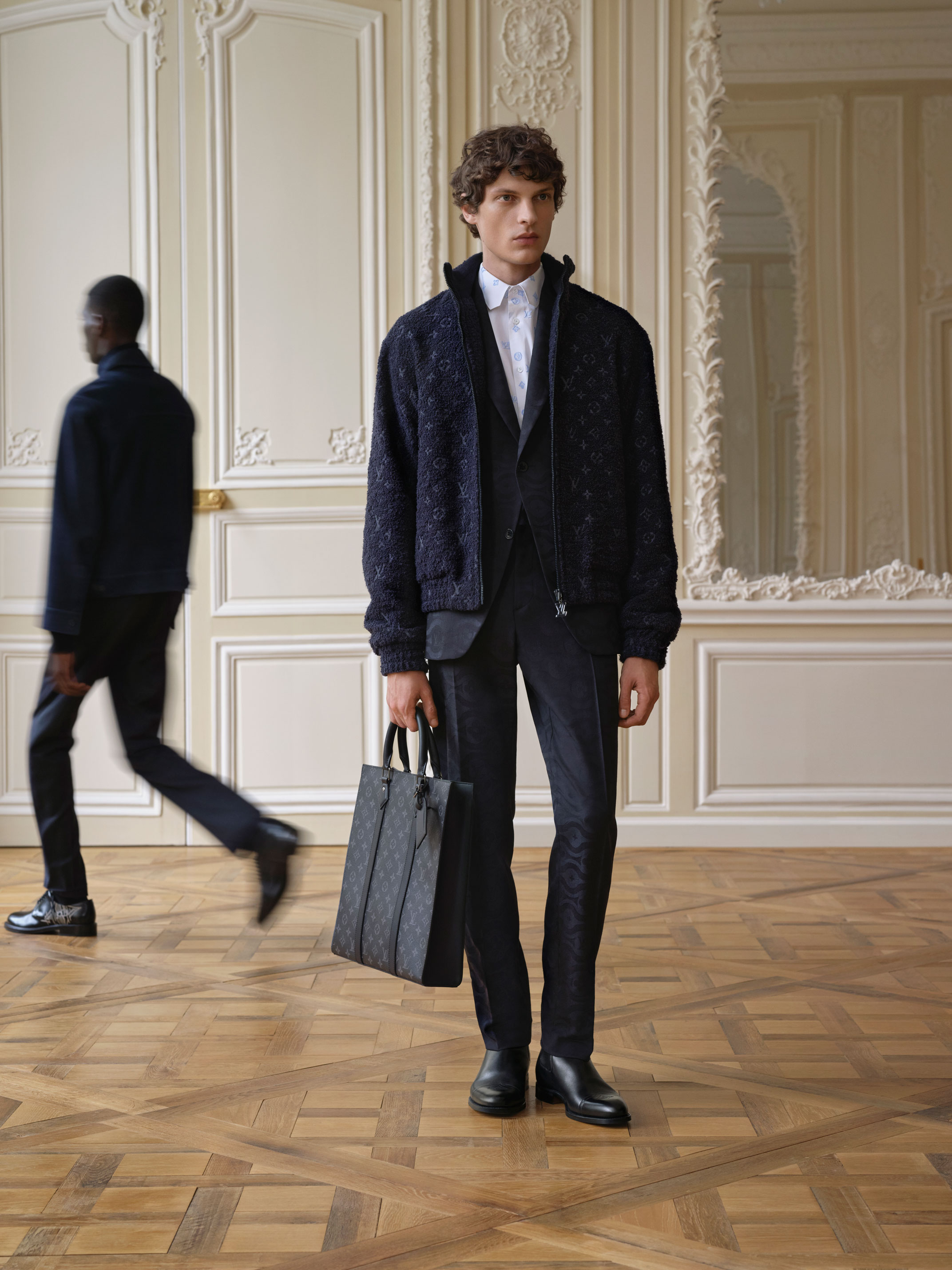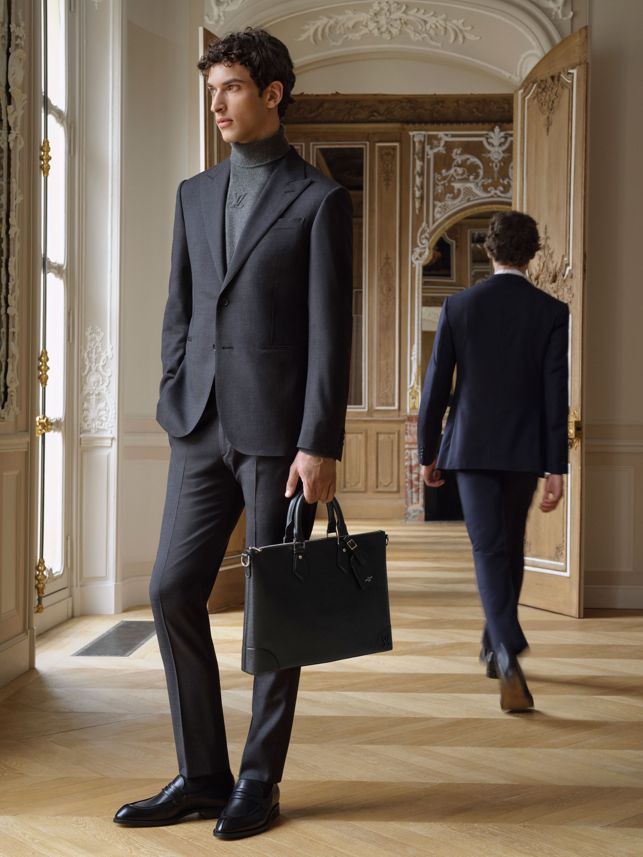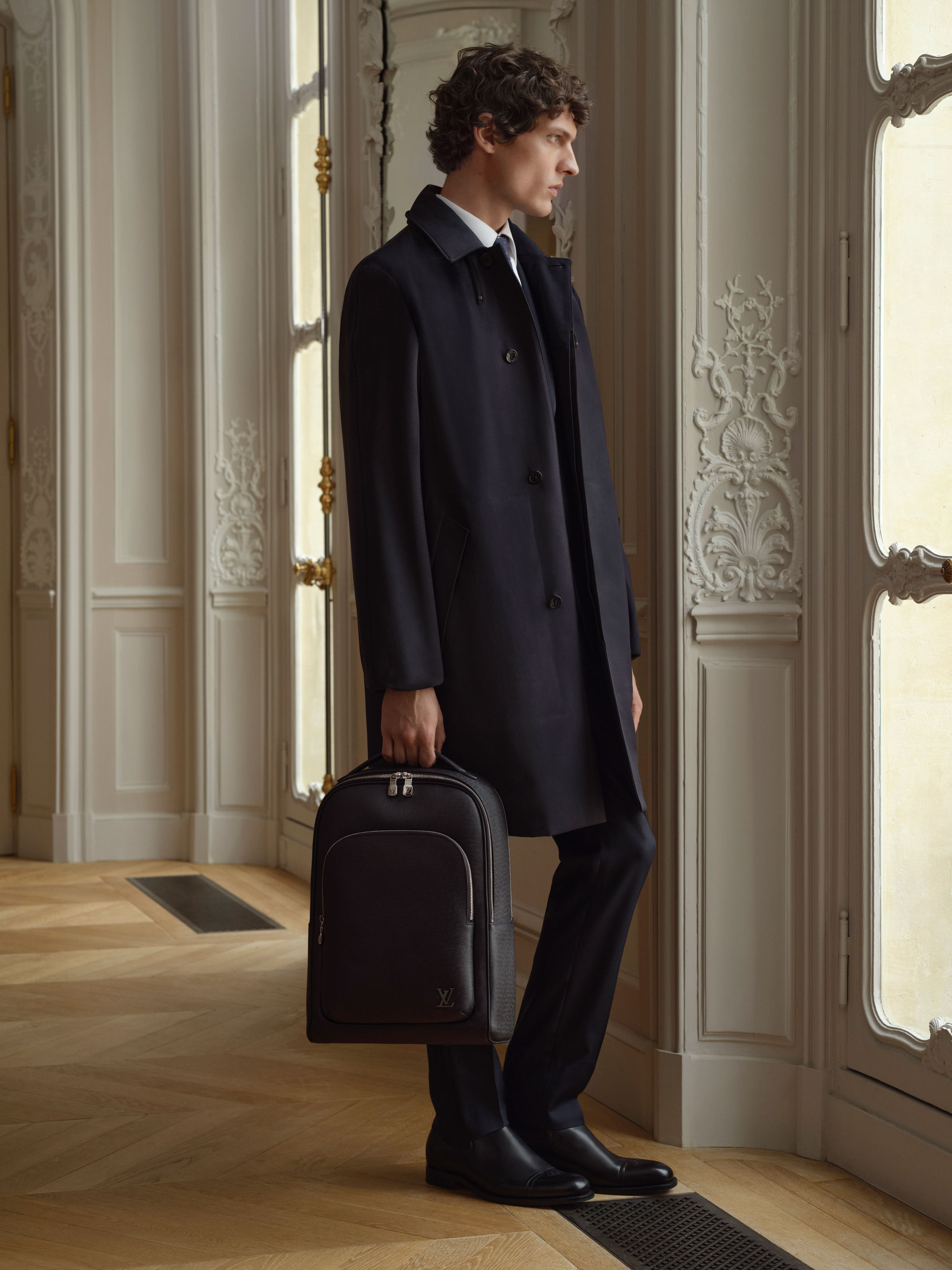 Ще діловитий гардероб Louis Vuitton демонструє повсякденні варіанти: замшеву шкіряну куртку, водолазки й кардигани. Фактурність образів забезпечують аксесуари: сумки Keepall, Horizon у графітовому або класичному чорному та Fastline з серії LV Aerogram.
