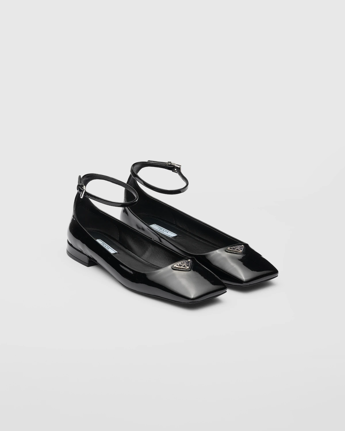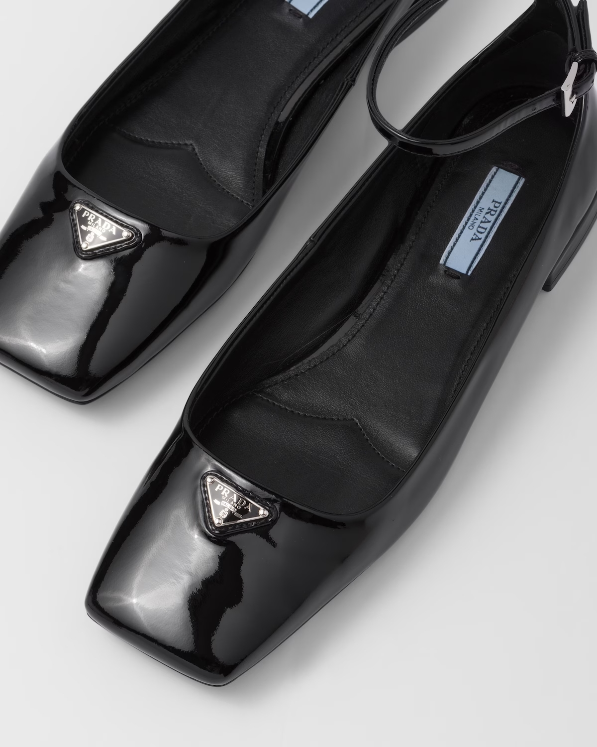 Лаковані балетки від Prada поєднують одразу два трендових дизайни – «балерина» і Мері Джейн. Пара стане чудовим доповненням як класичних, так і більш неформальних образів. Чорні балетки доповнюються трикутним логотипом бренду на мисі.