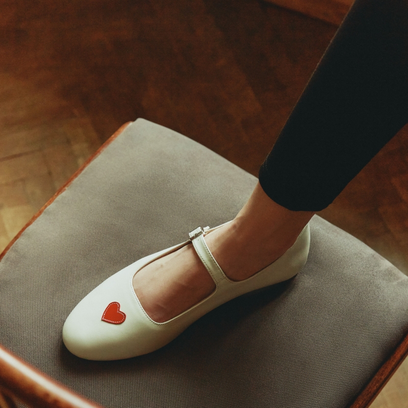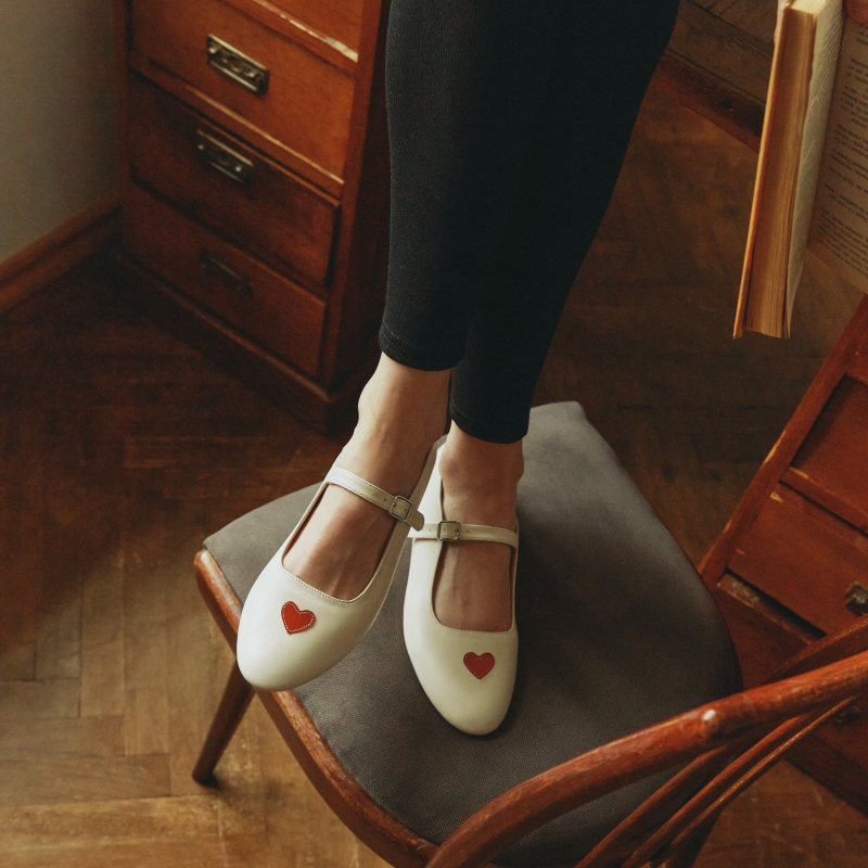 Класична модель балеток у молочному кольорі з округлим мисом від українського бренду Lookie Atelier пасуватиме до будь-якого повсякденного образу. Червоне серце – деталь, яка не залишить байдужими прихильниць стилю преппі.