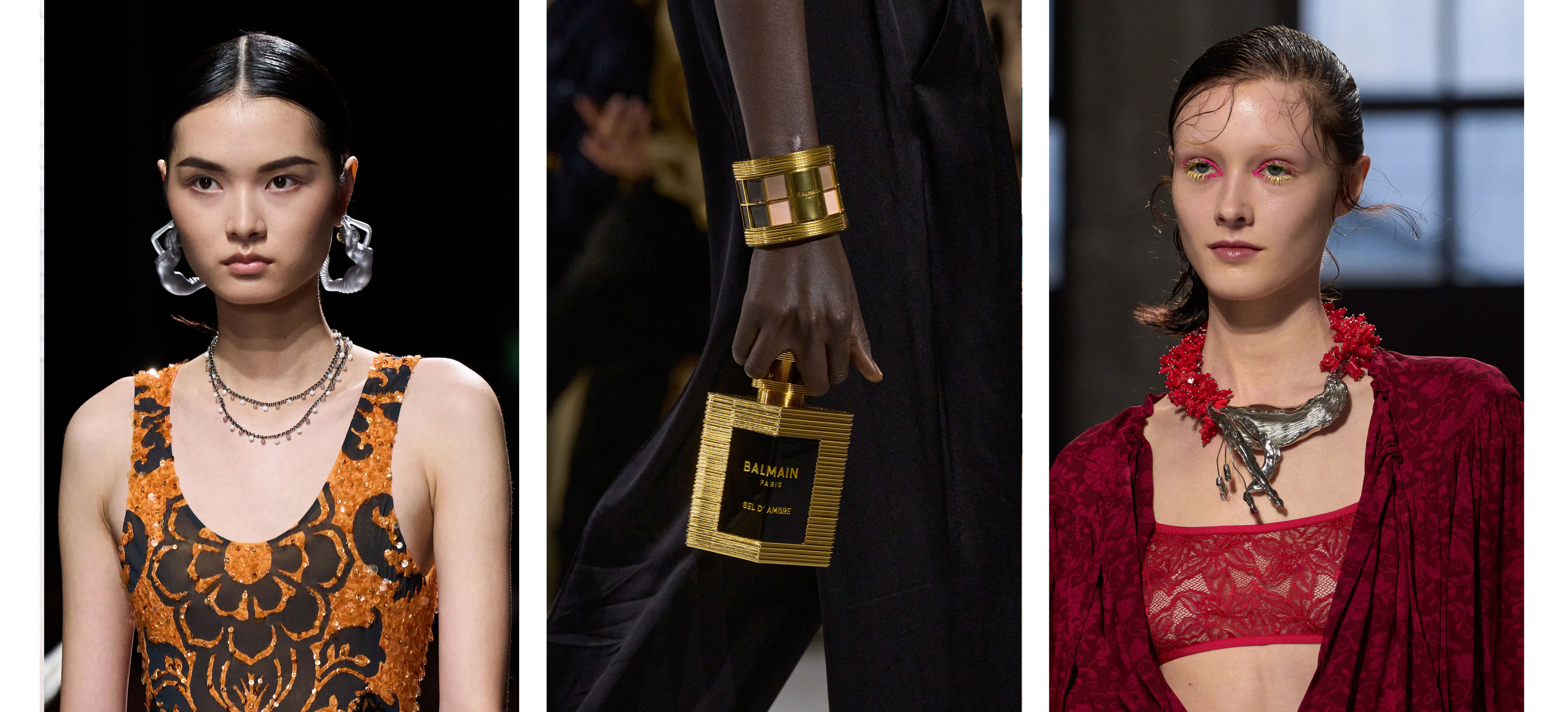 Масивні прикраси виступають чудовим акцентним доповненням образу, захоплюючи увагу також безкомпромісних мінімалістів. Їх ми побачили у вигляді браслета та за сумісництвом косметичної ілюзії в Balmain, флористичного металевого кольє Dries Van Noten і сережок у формі жіночого тіла в Etro.