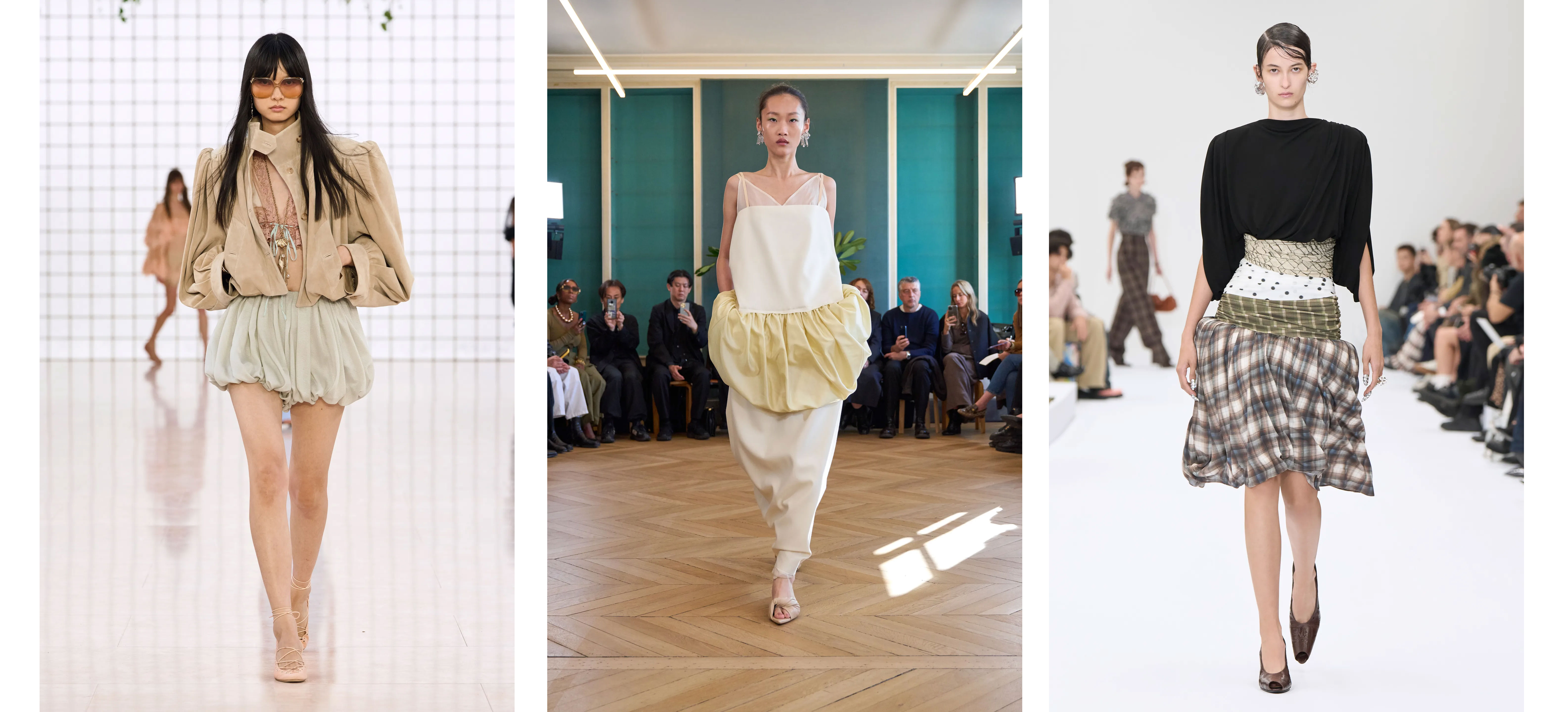 Об’єм, пишність, багатошаровість — всі ці характеристики надають образам грайливості й візуальної виразності. Перебільшені пропорції з’явилися в гороховій та картатій спідниці Acne Studios, ніжному комбінезоні Carven і охопленому стилем бохо-шик образі Chloé.