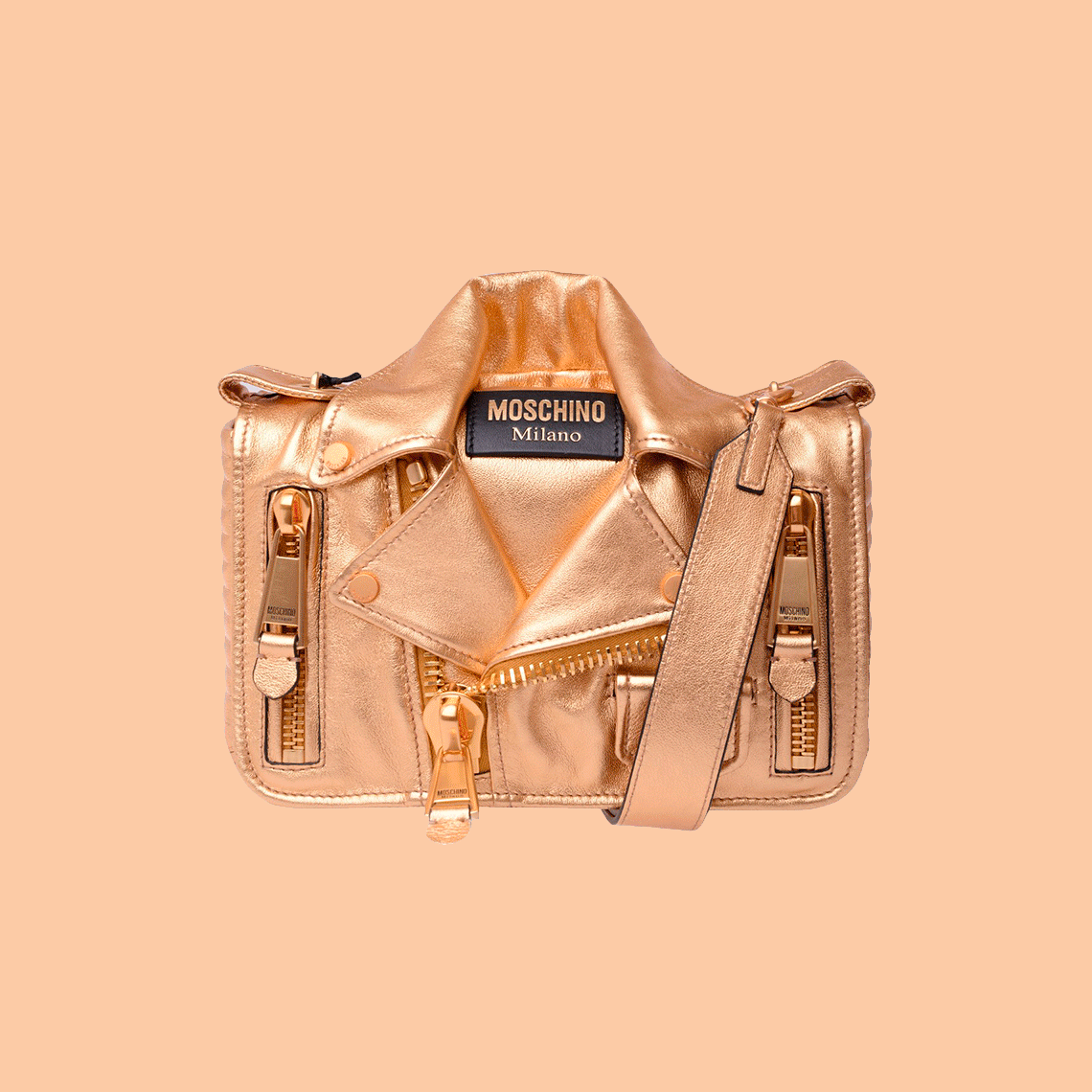 В новой коллекции Moschino мы нашли занятную сумку — biker bag, — выглядит она как аккуратно сложенная байкерская косуха с нашивками. Скотт придумал ее еще летом 2014 года: тогда сумка была выполнена в нетипичном для модного дома варианте — черно-белом. Признание она обрела сразу, и это легко объяснить: это тот самый случай, когда не можешь выбрать между двумя крутыми кожанками. Так вот, теперь можно надеть сразу две. Кстати, примечательная деталь на сумке — логотип, который выглядит как бирка на одежде.