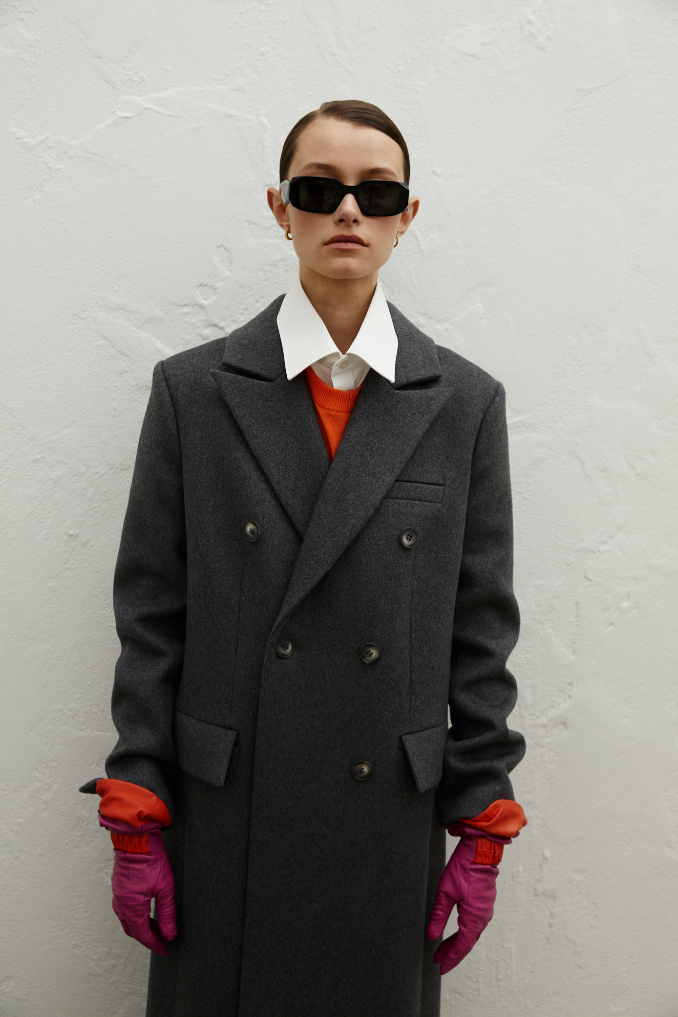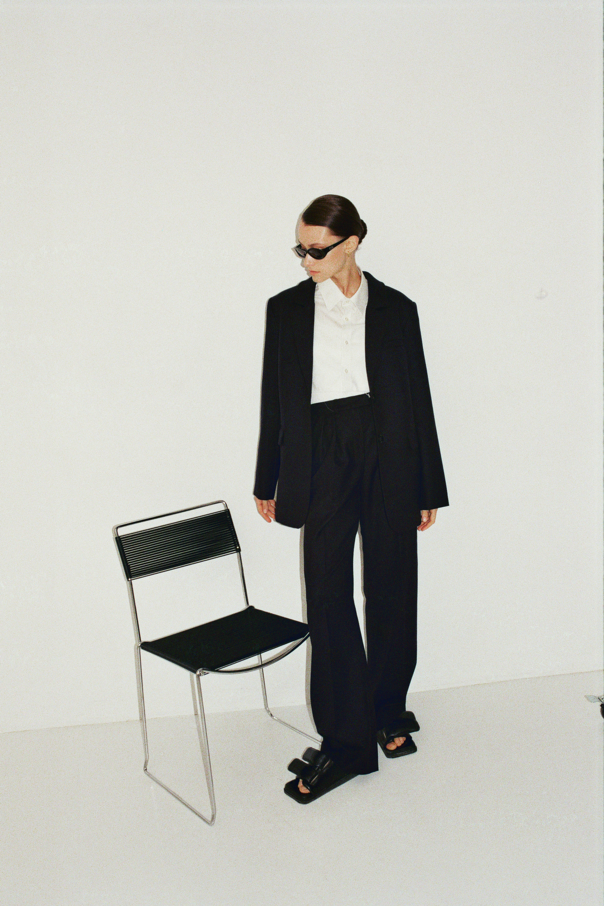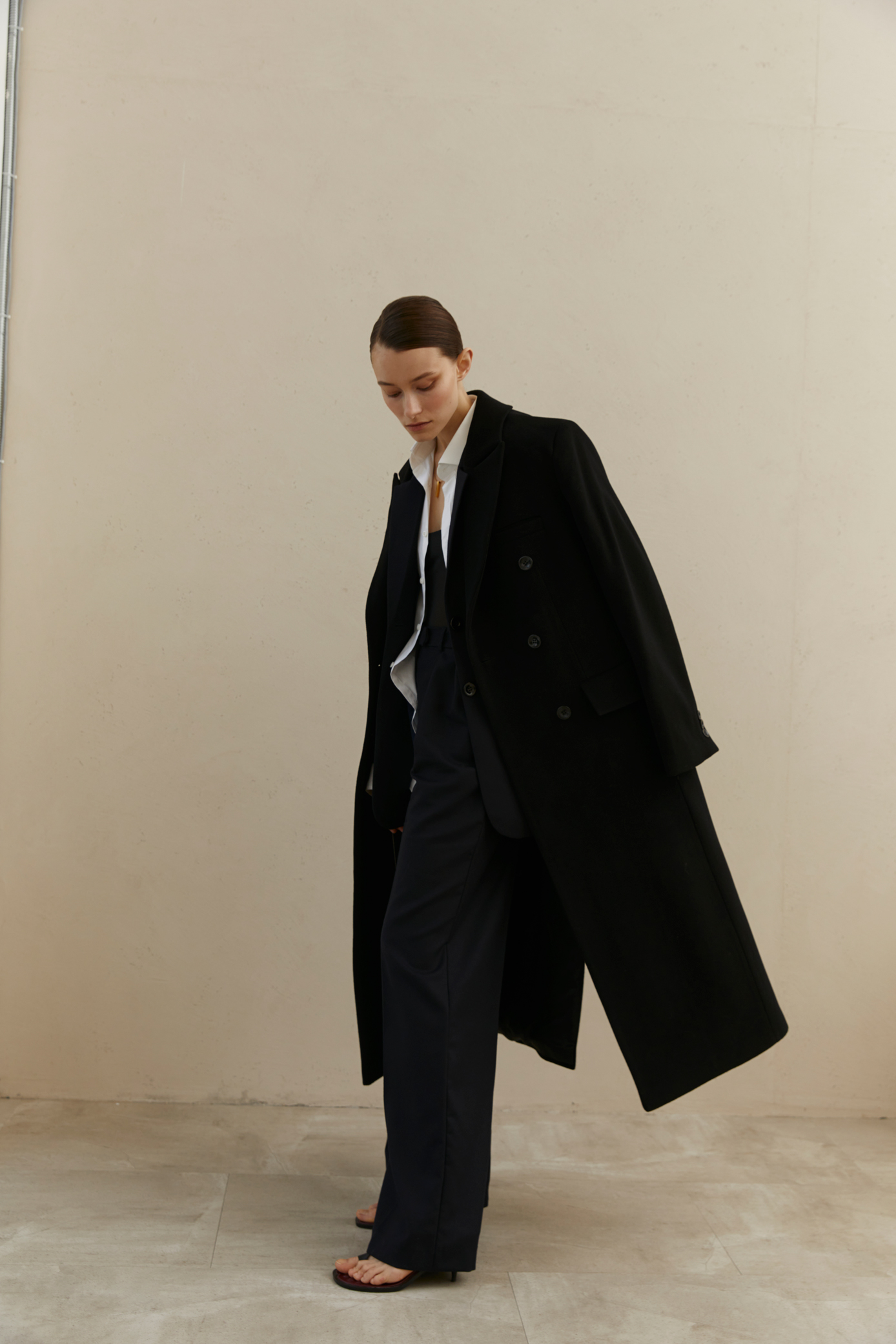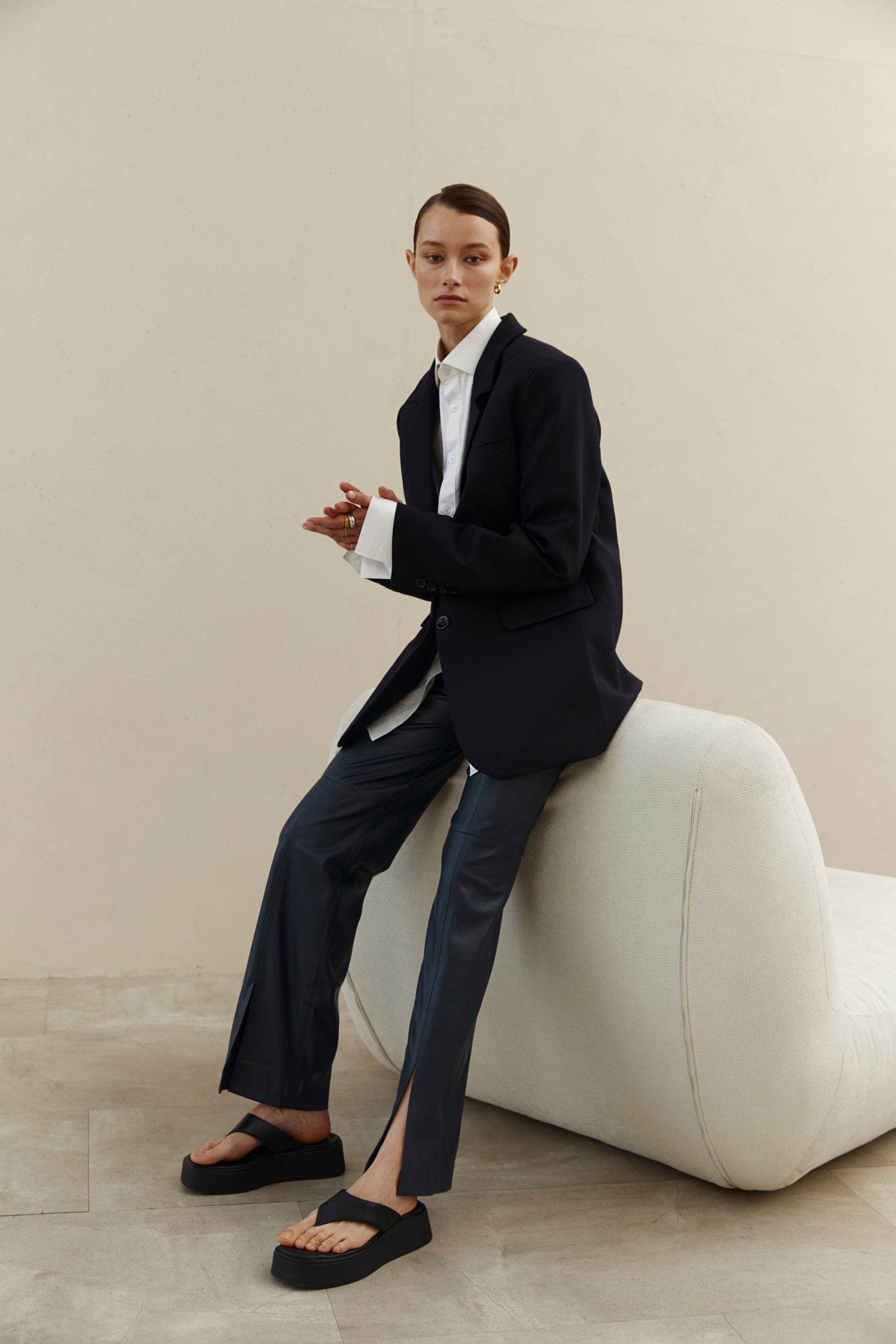 The brand's debut collection is represented by classic two-piece suits, elegant double-breasted coats, and eco-leather trousers. Eternal outfits will match not only the items from the collection but also the rest of your wardrobe. The palette of the first Eternal collection is neutral: black, grey, sandy, and dark blue. This makes the brand's garments perfect for combining them with a great variety of other clothes and accessories — both with a monochrome tone and bright accent colors.