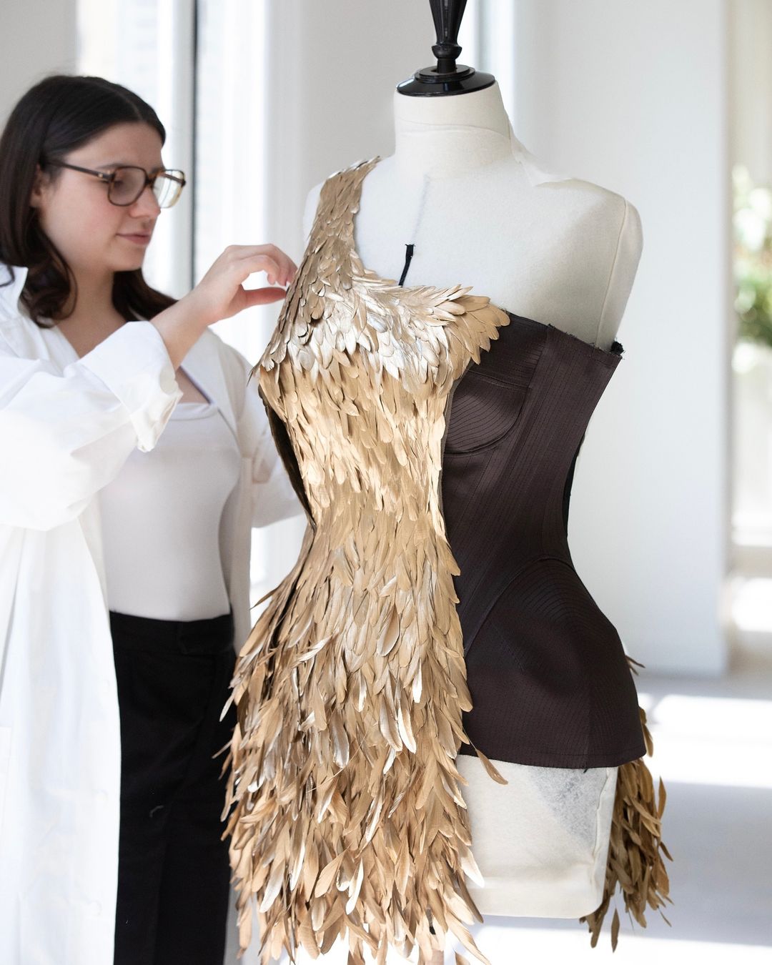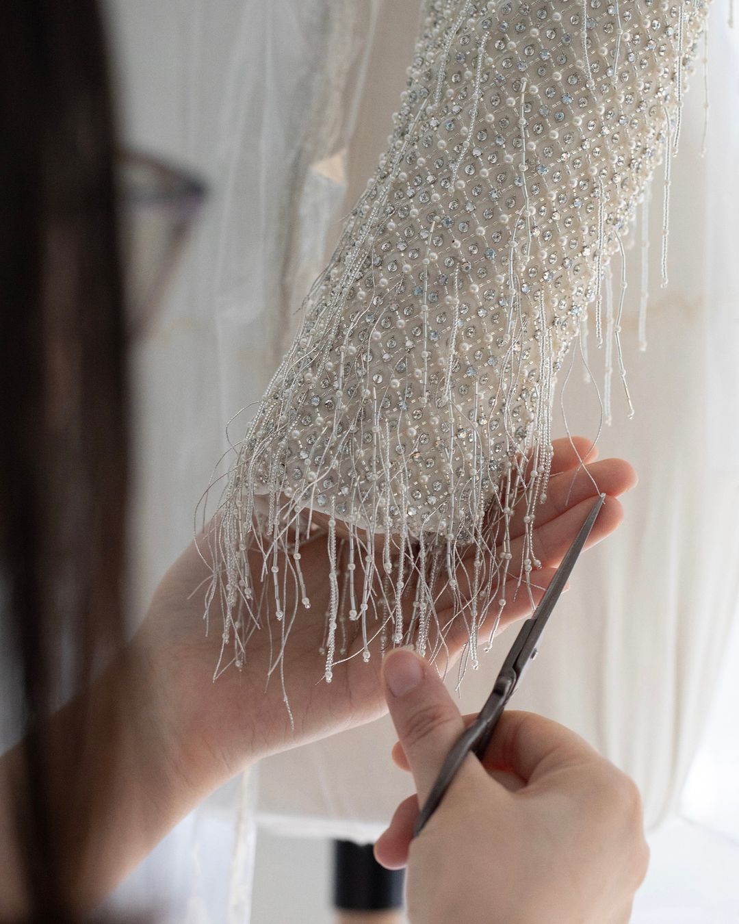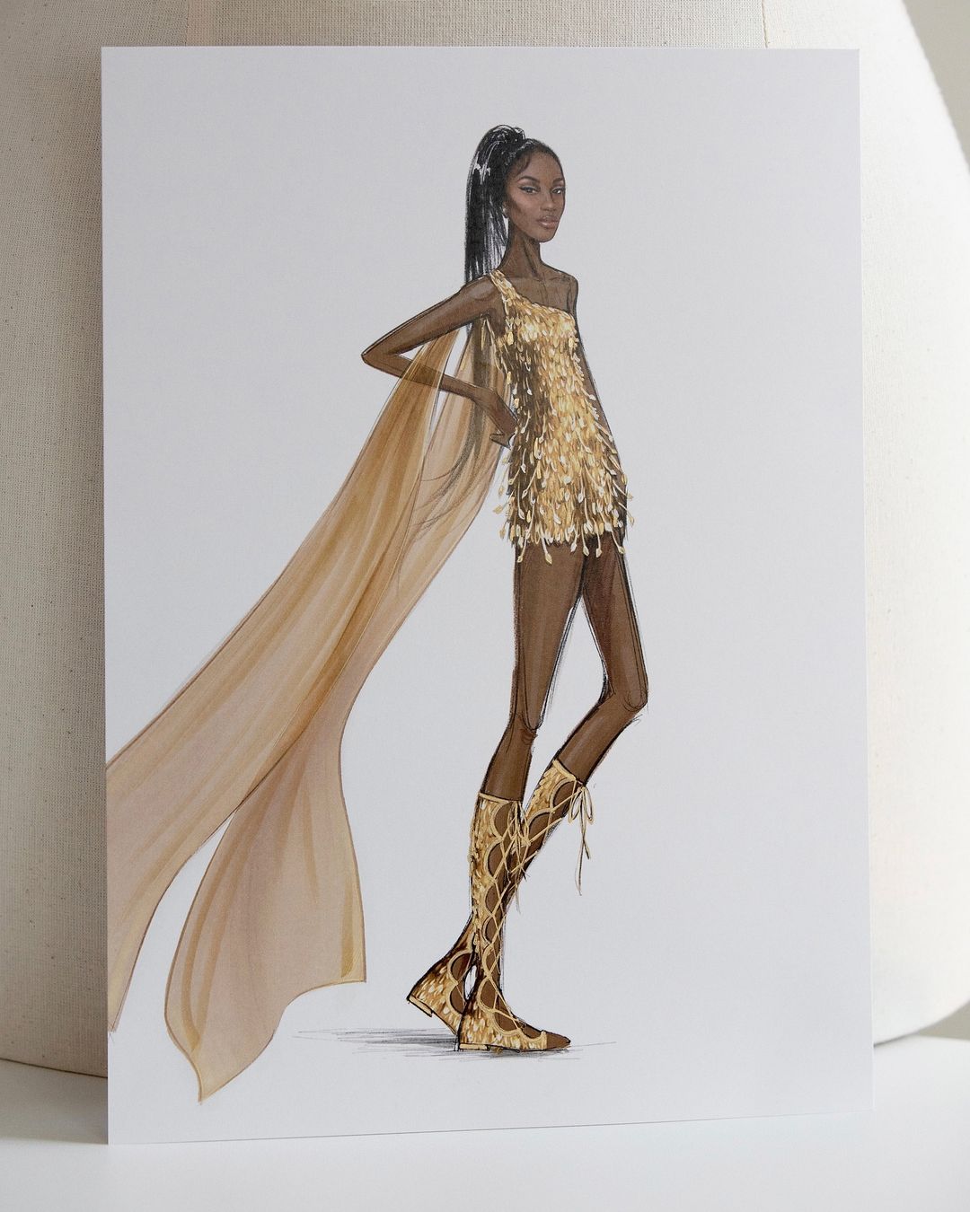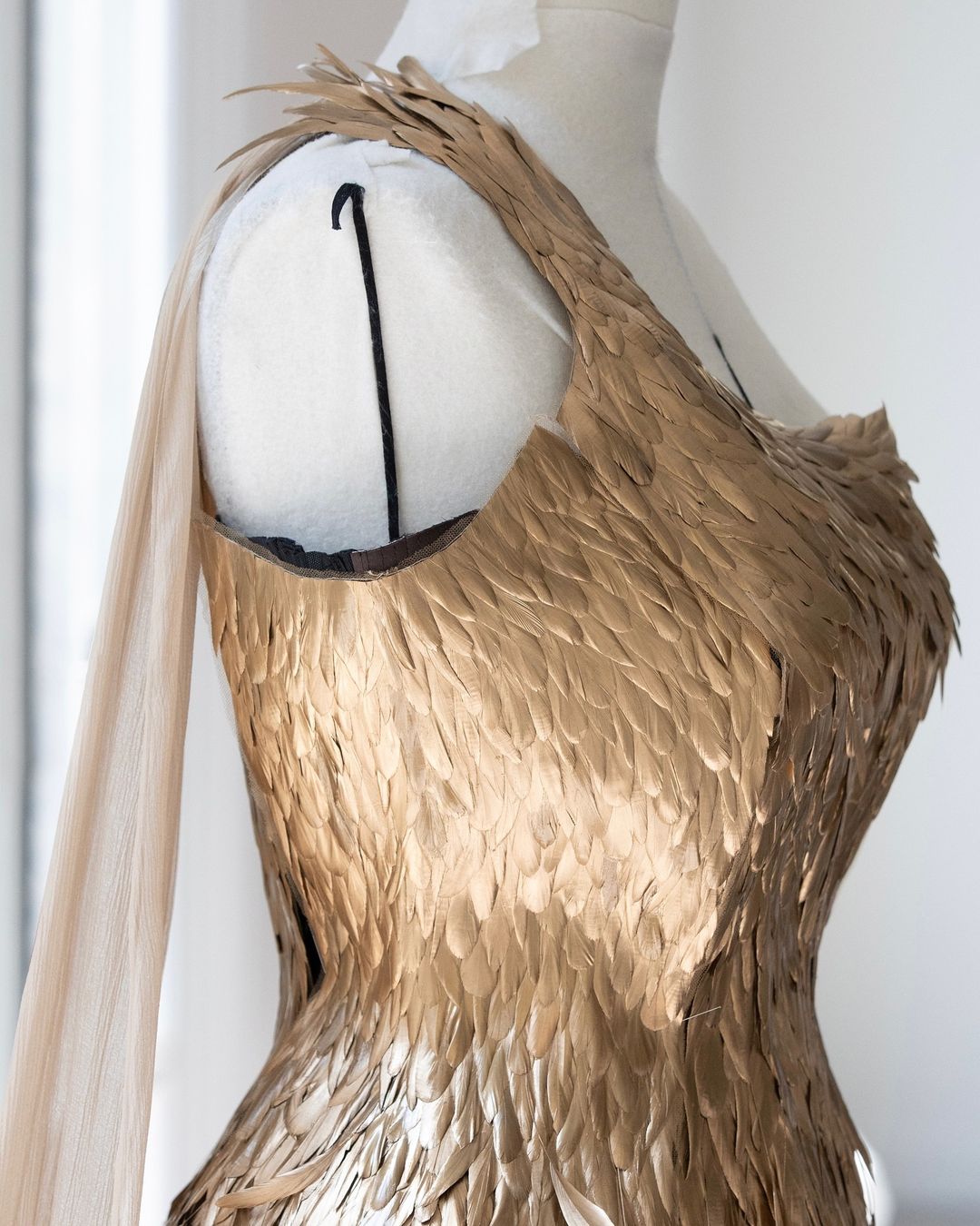 Аби створити сукню-футляр з довгими рукавами та високою горловиною для Селін Діон, пішло більше 1000 годин ручної роботи. Майстри ательє Dior розшили довгу шовкову сукню лелітками, срібним бісером та іншими декоративними матеріалами, відображаючи імітацію софітного сяйва. Невагома бахрома, розташована на рукавах, спідниці та спині, повторювала рухи співачки, додаючи образу вишуканого лоску.