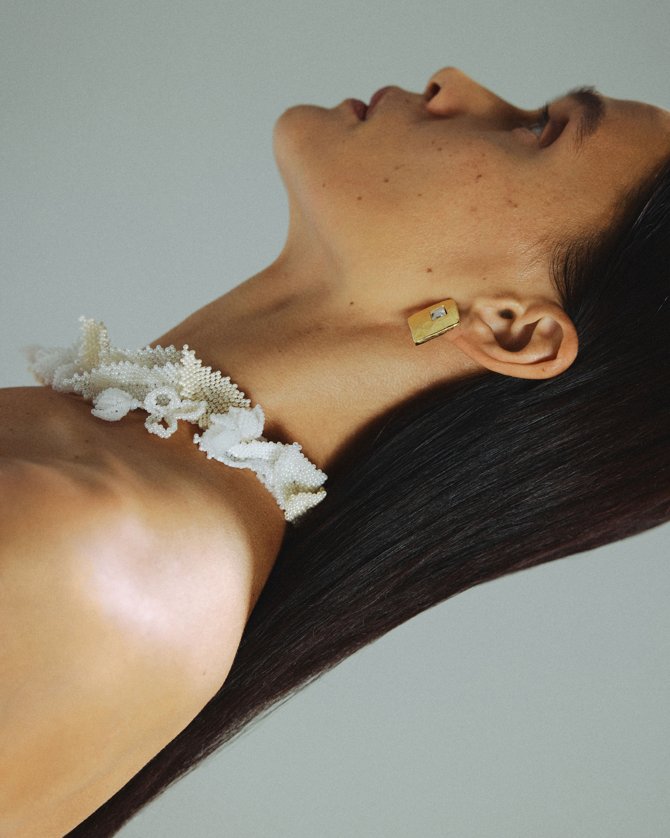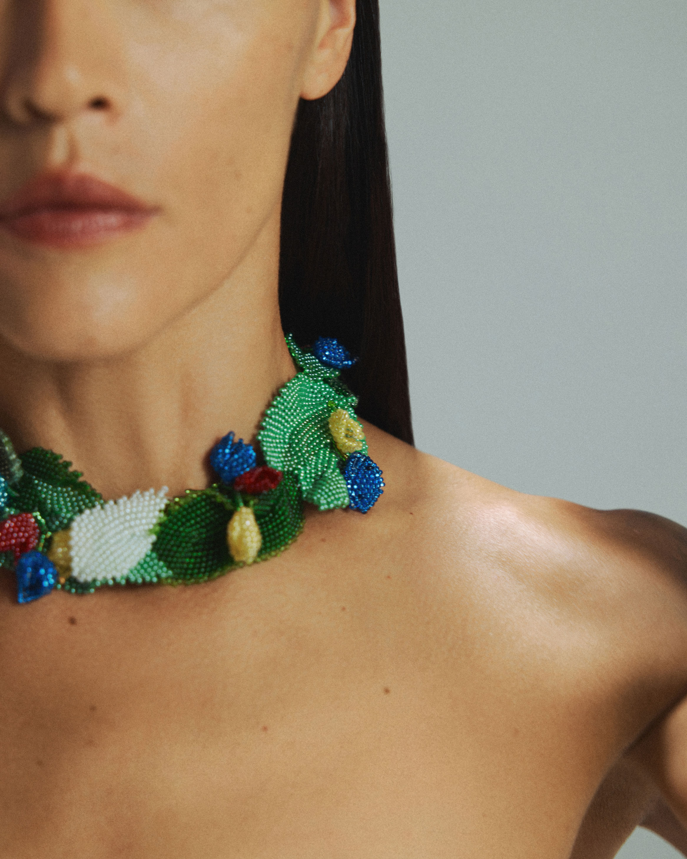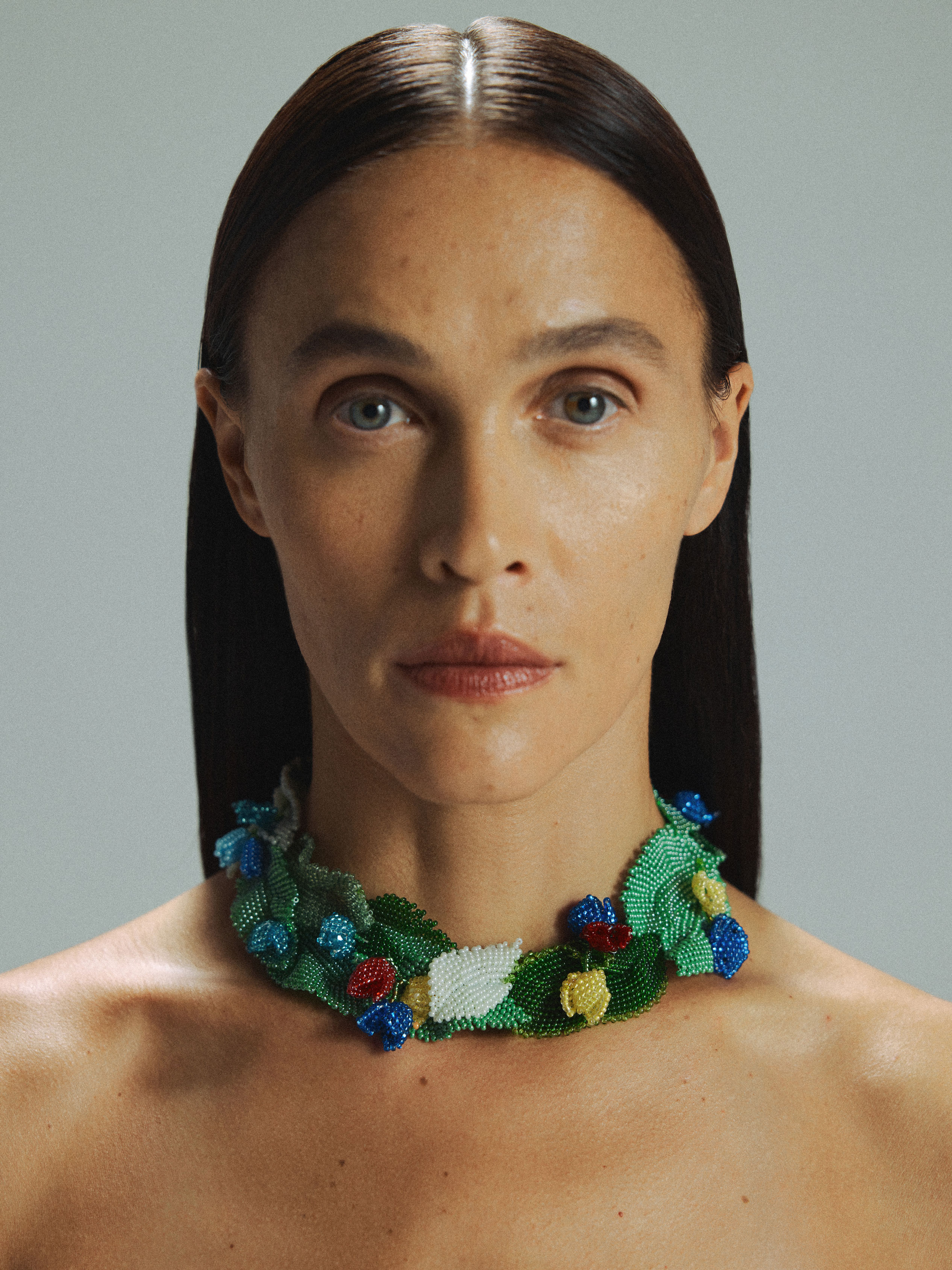 Також дизайнер розробив дві прикраси, які нагадують вінок сплетений із квітів. Прикраса виконана із бісеру. Виробляють прикрасу, виключно вручну, майстрині OMELIA.