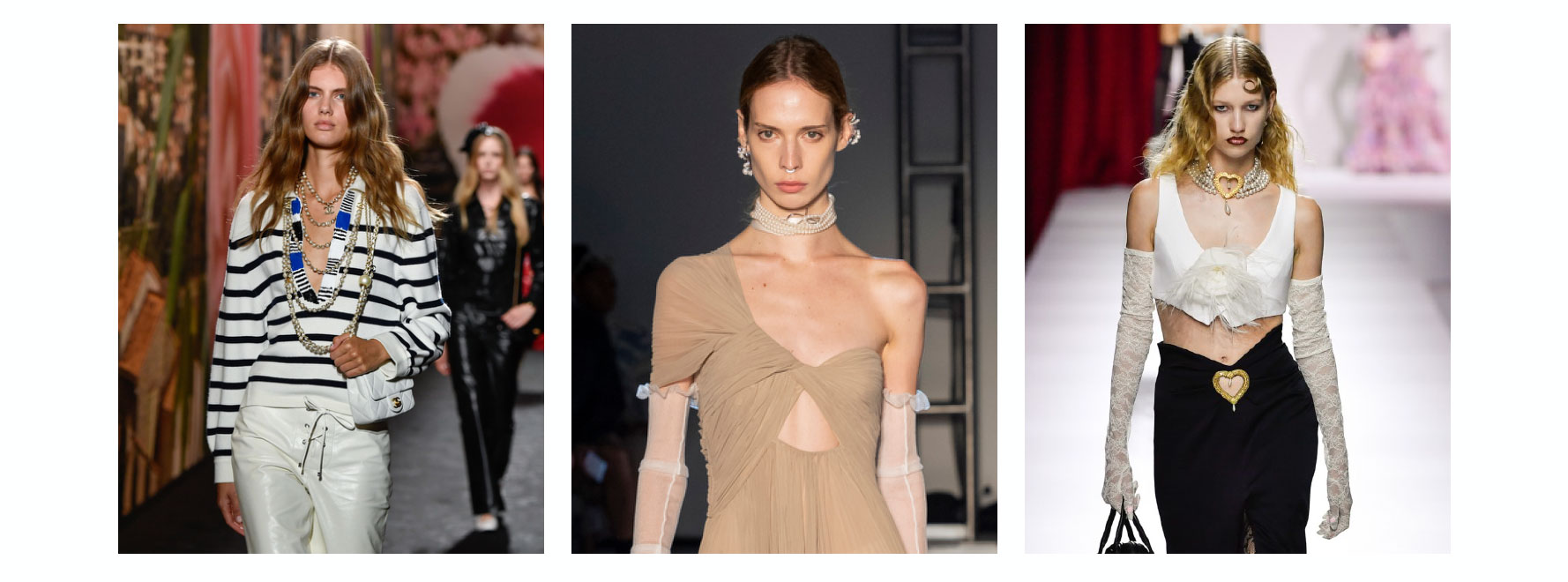 У стилі головних героїв серіалу «Бріджертони», проте не менш сучасно й грайливо, пропонують стилізувати перли в Adeam і Moschino. Обоє пропонують додати в ансамбль із перловими чокерами оперні прозорі рукавиці, а також поекспериментувати з асиметрією та вирізами в максісукні чи максіспідниці.