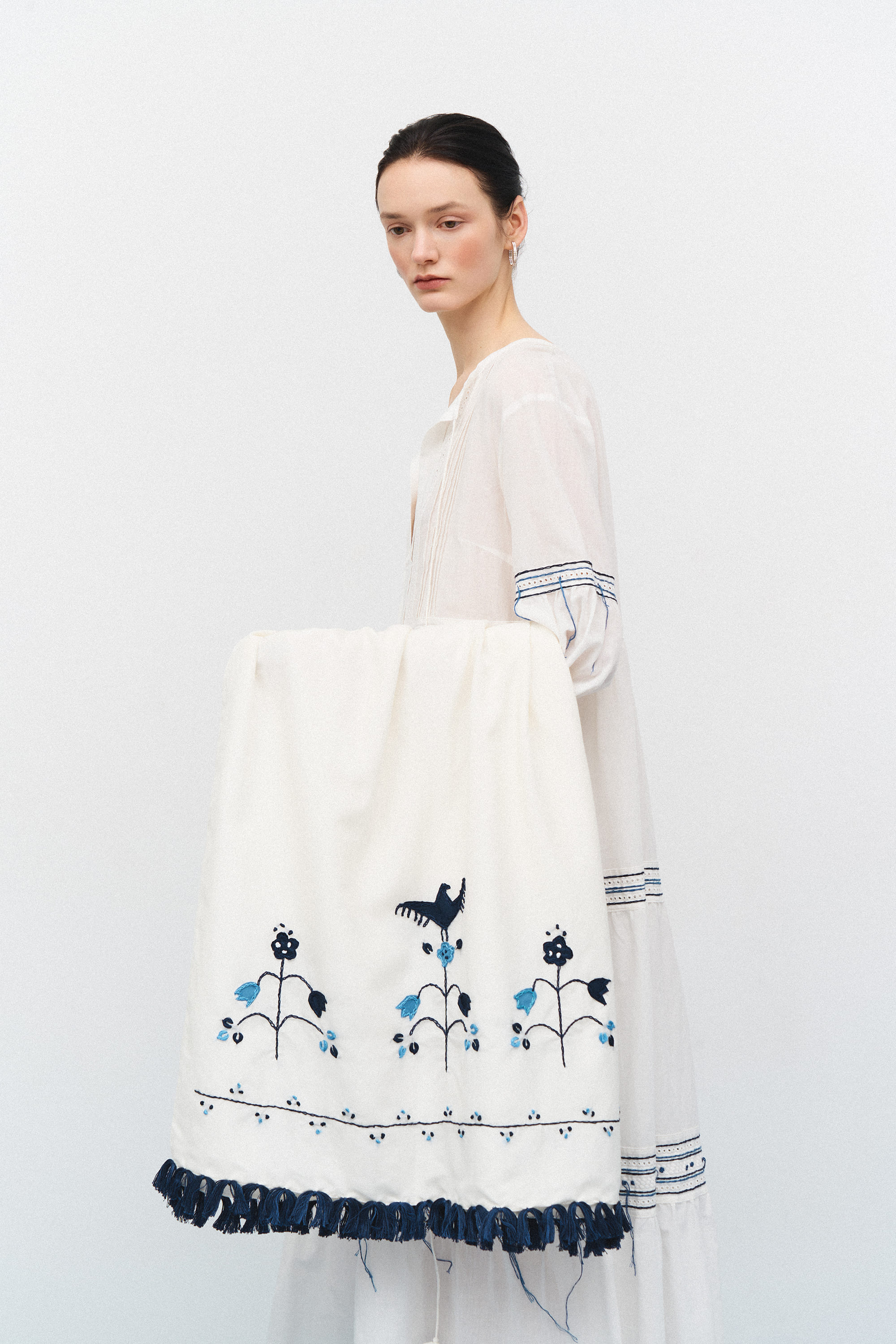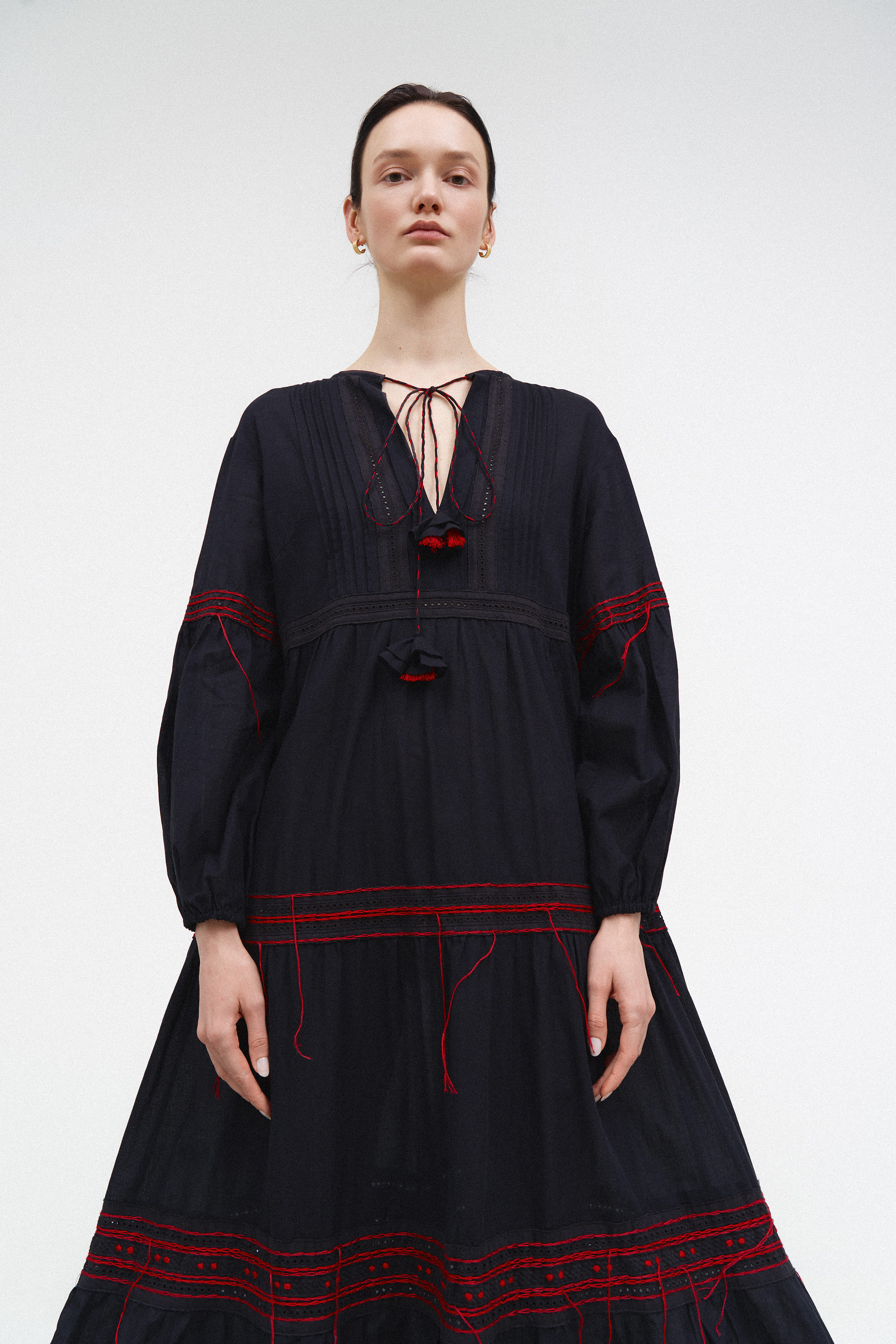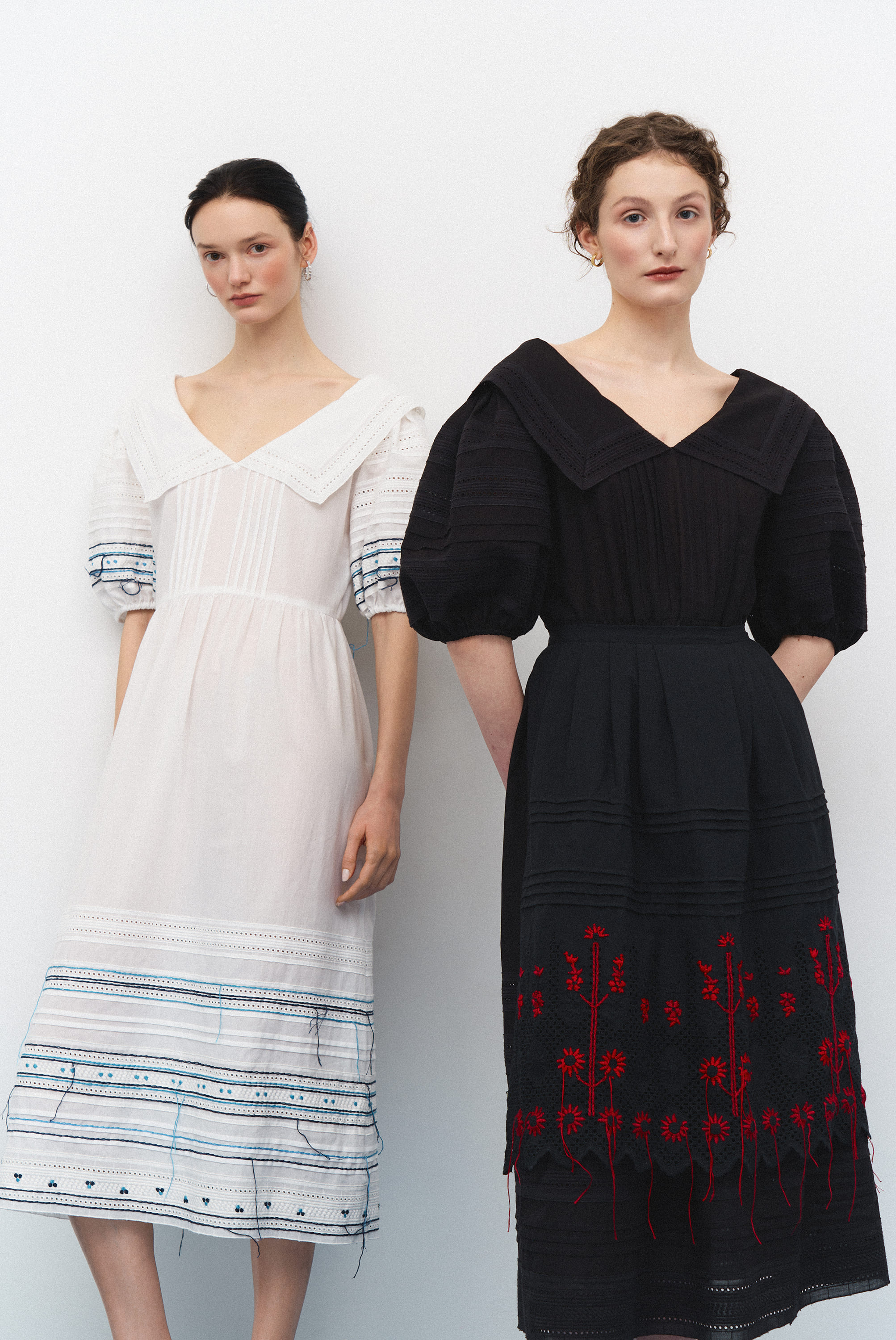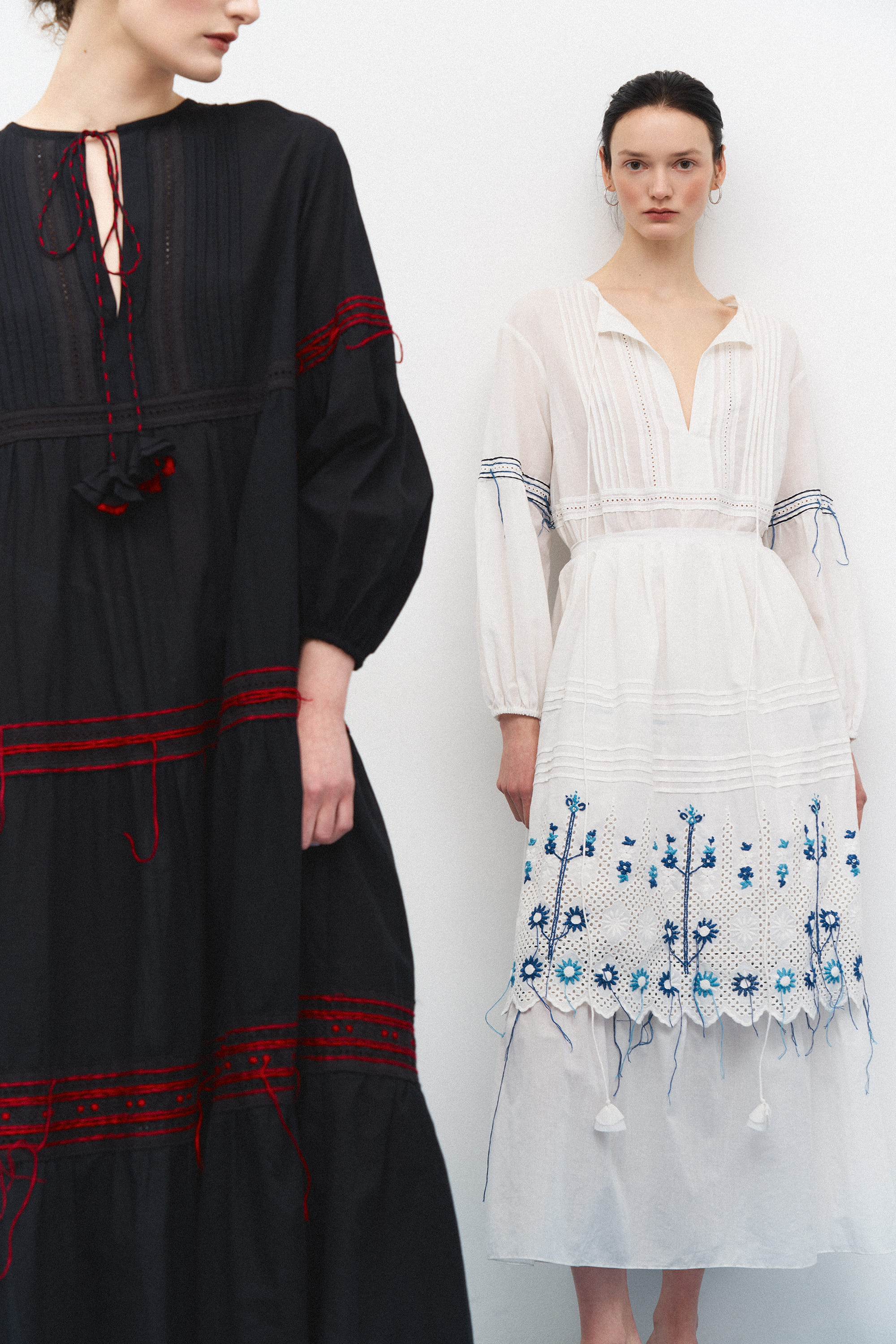 Саме ці мотиви можна знайти у білих та чорних вишиваних сукнях, які стали основою колекції. Важливою деталлю є нитки наче незавершенного шиття: це символ частково втраченого з корінням зв’язку, але який сьогодні українці мають шанс відновити.