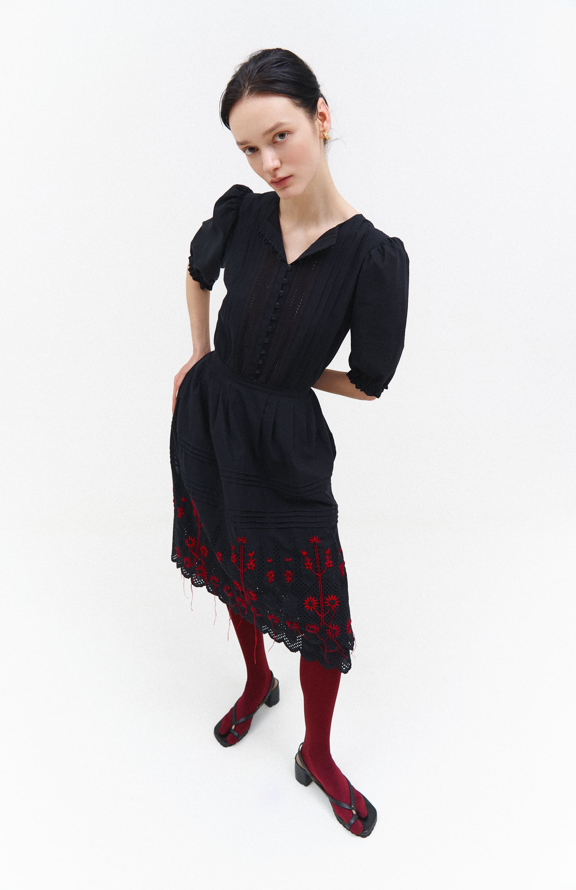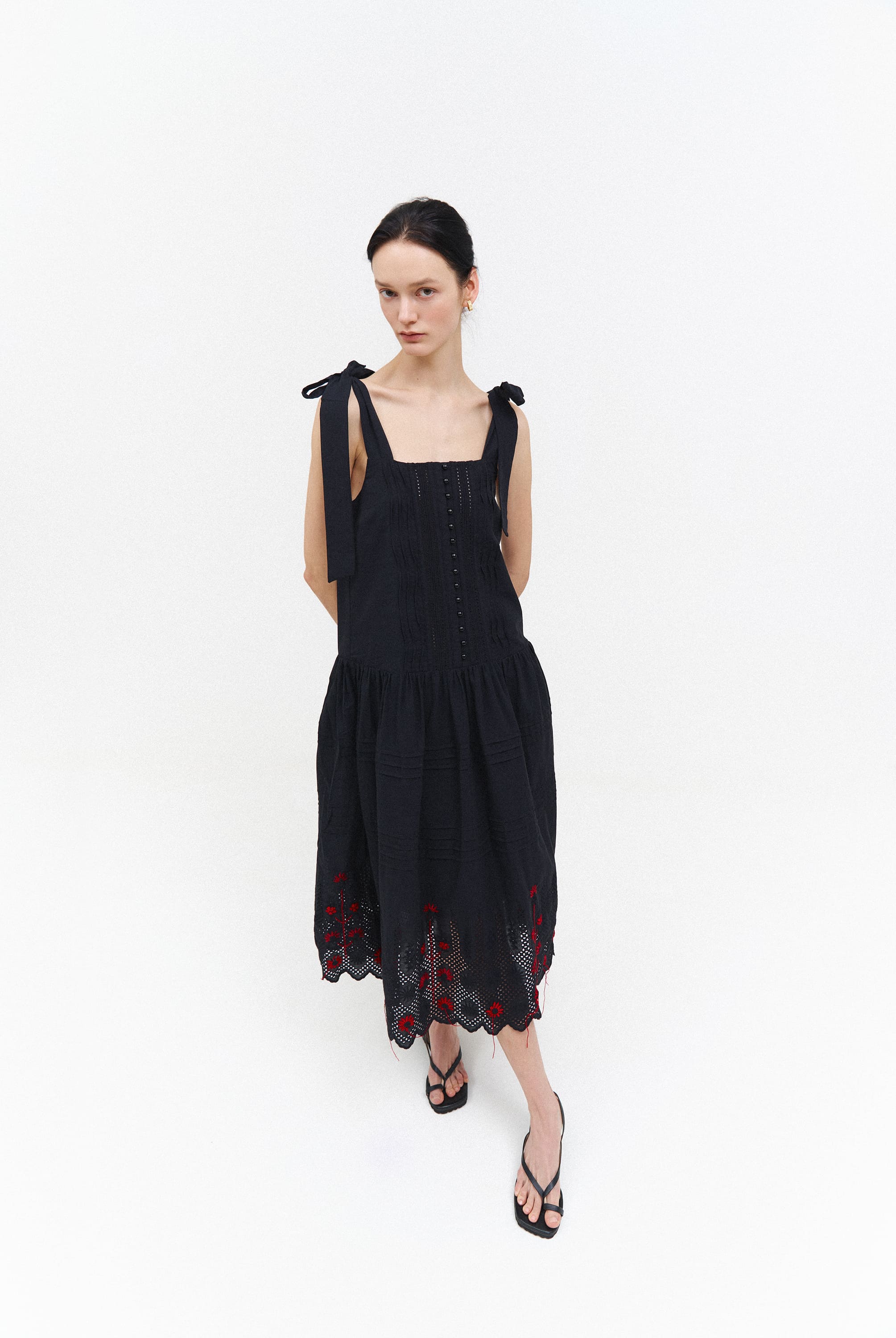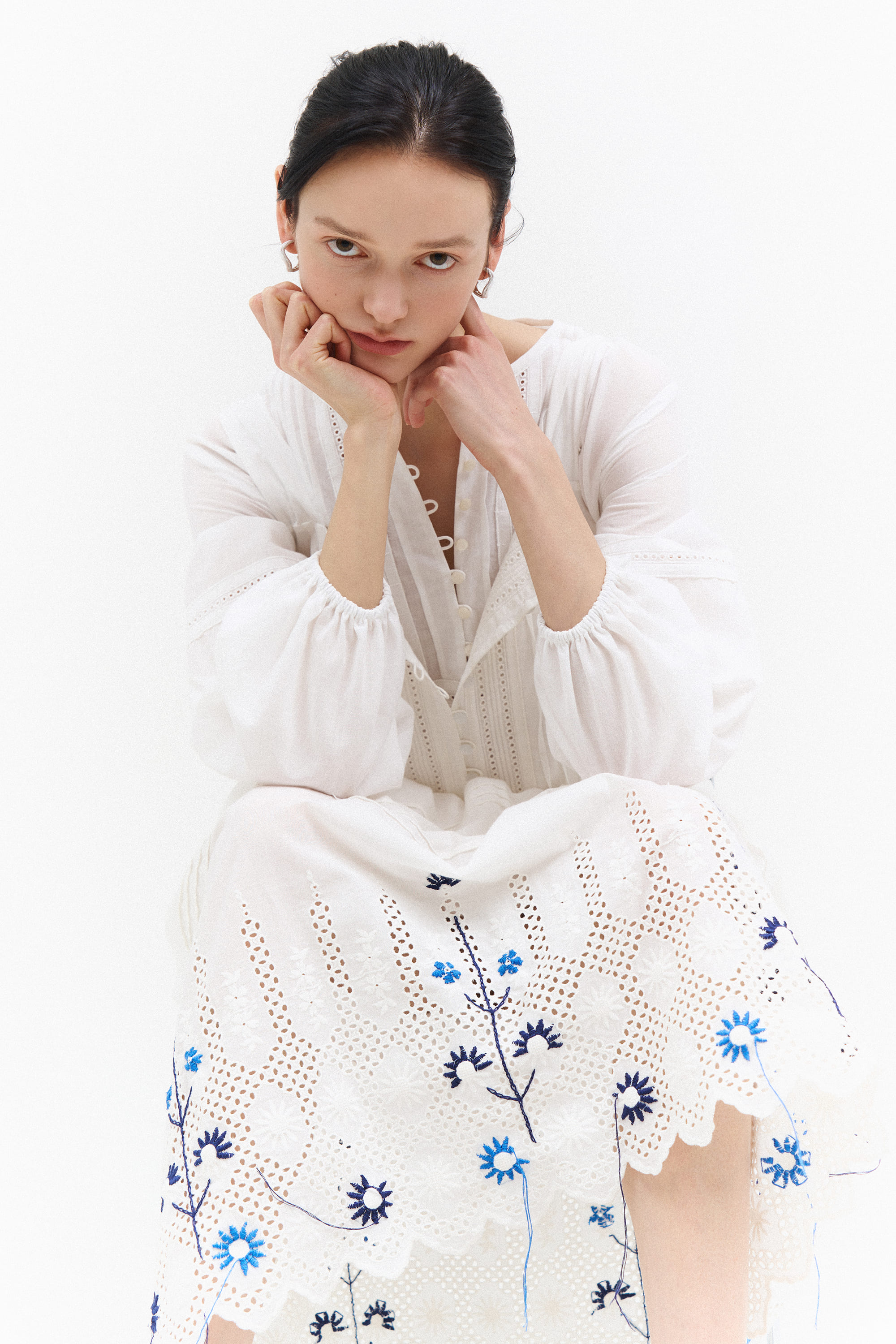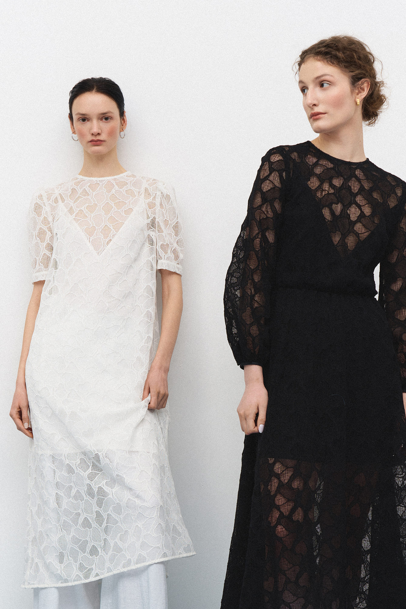 Саме ці мотиви можна знайти у білих та чорних вишиваних сукнях, які стали основою колекції. Важливою деталлю є нитки наче незавершенного шиття: це символ частково втраченого з корінням зв’язку, але який сьогодні українці мають шанс відновити.