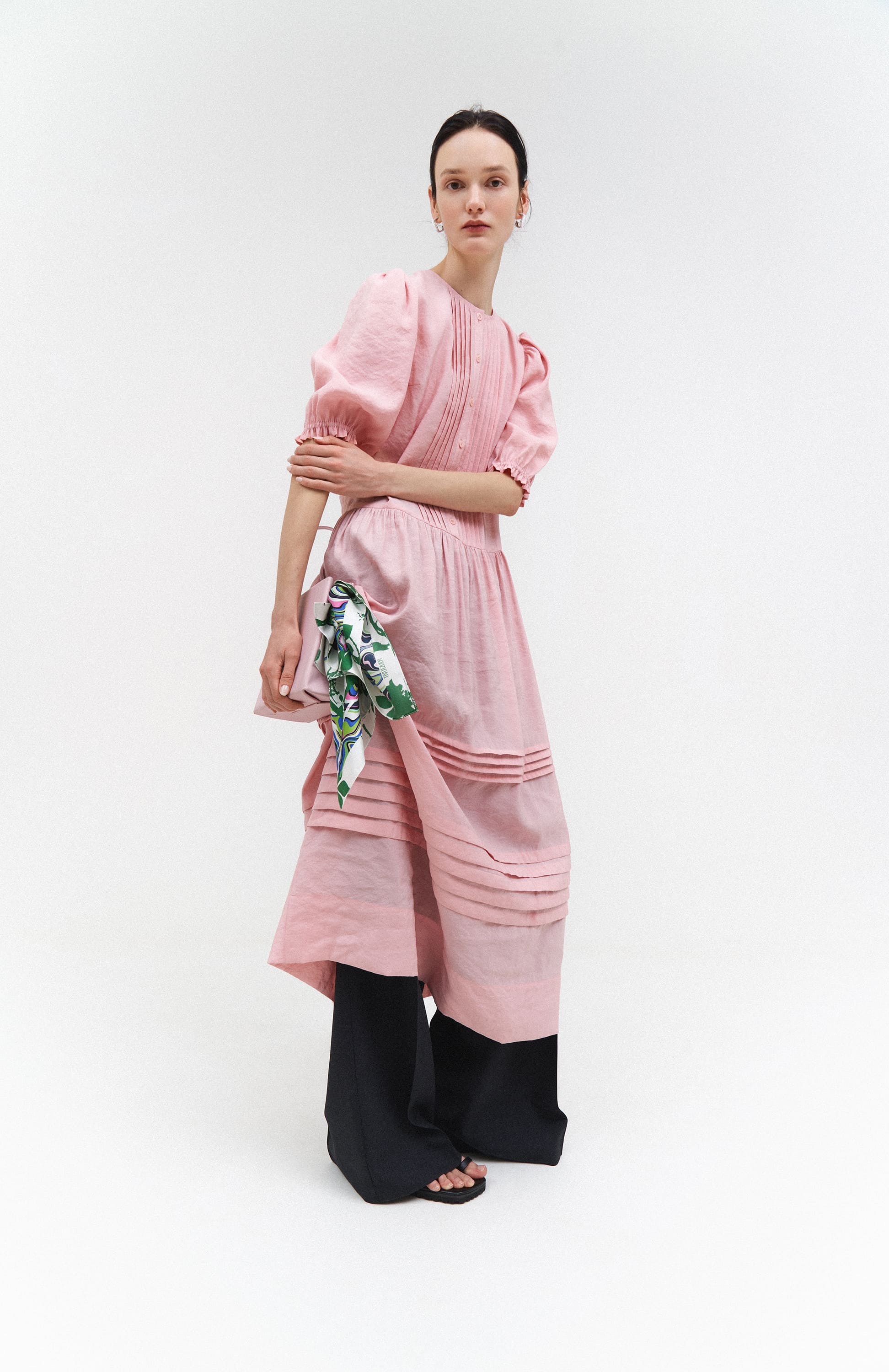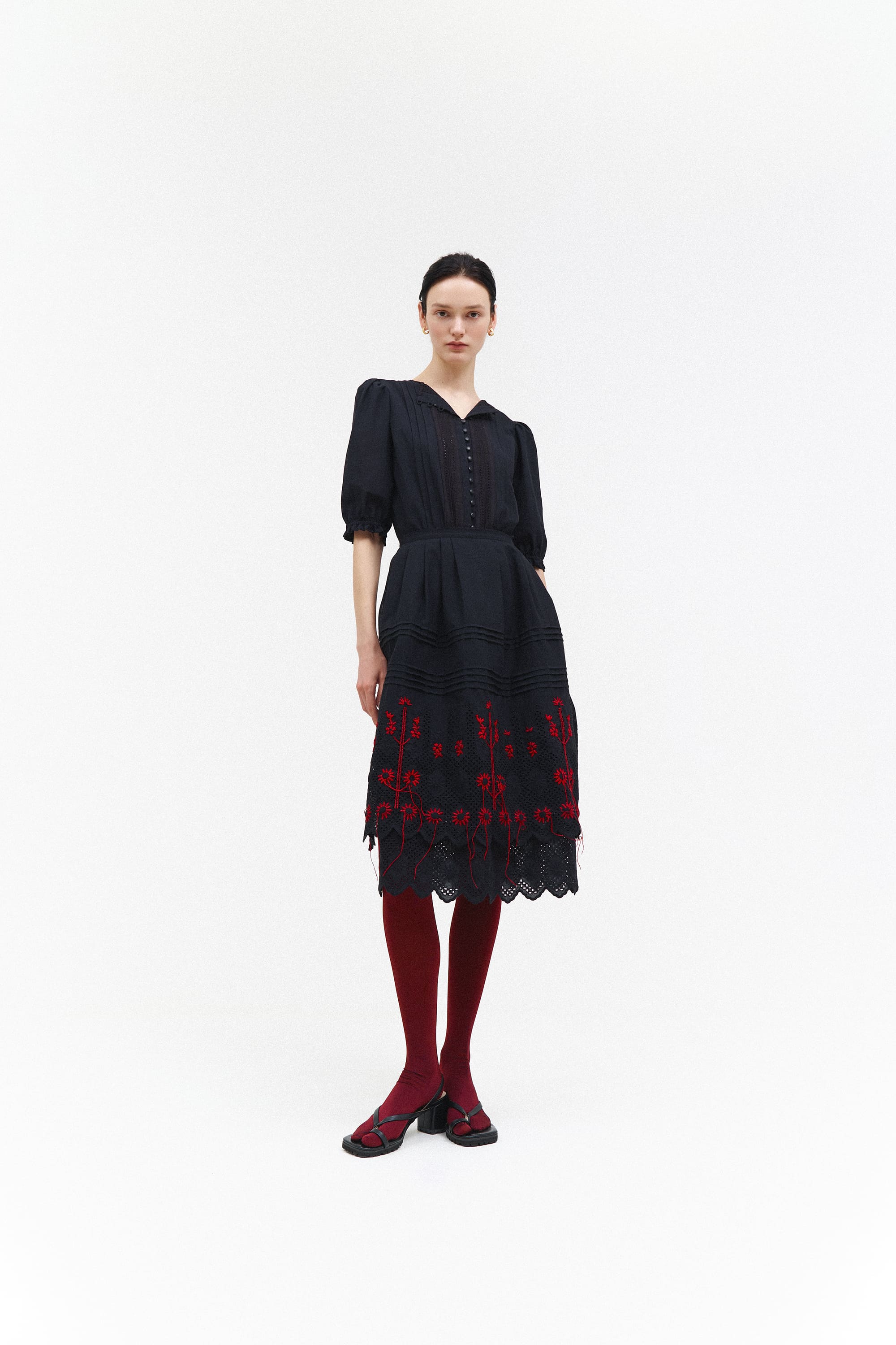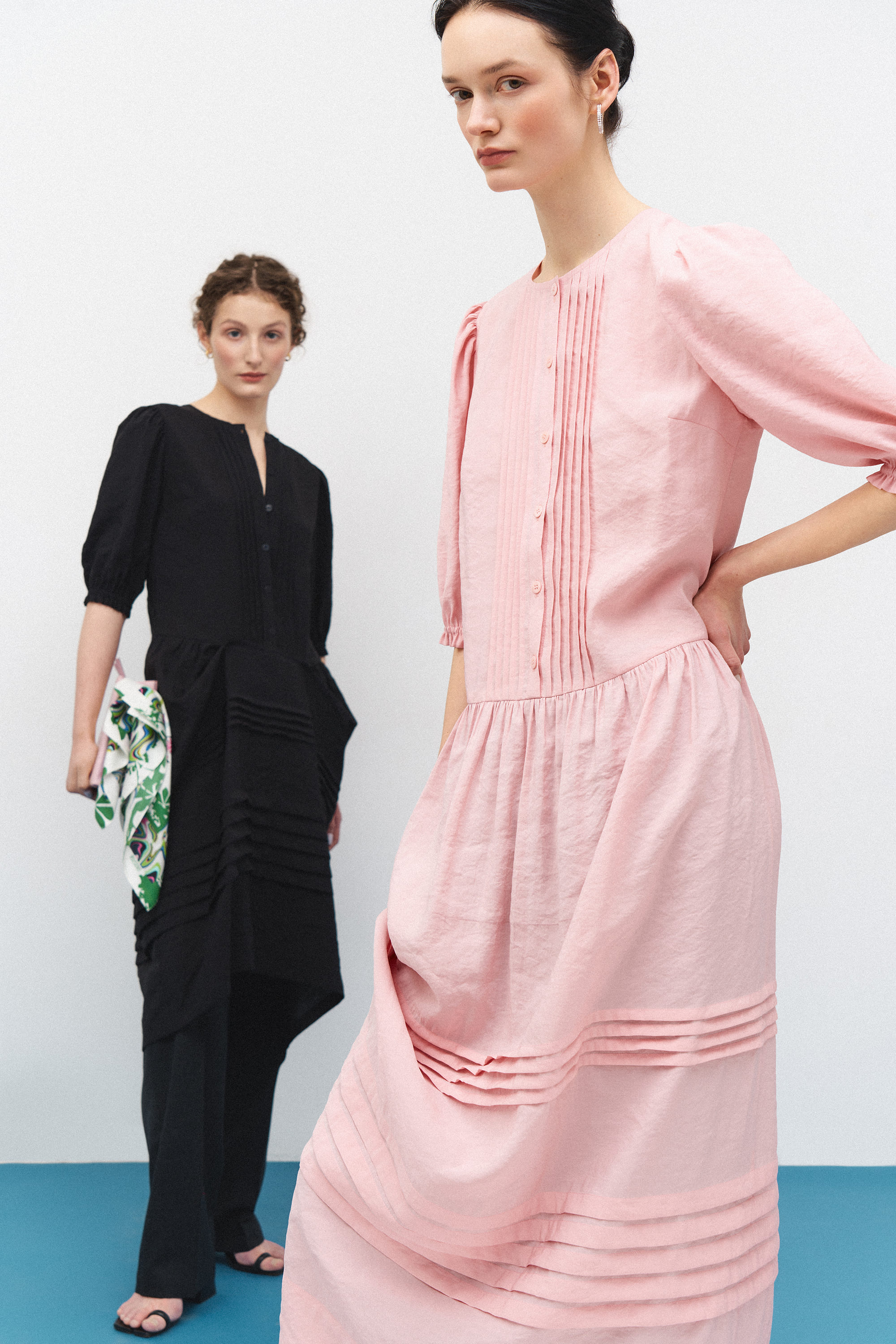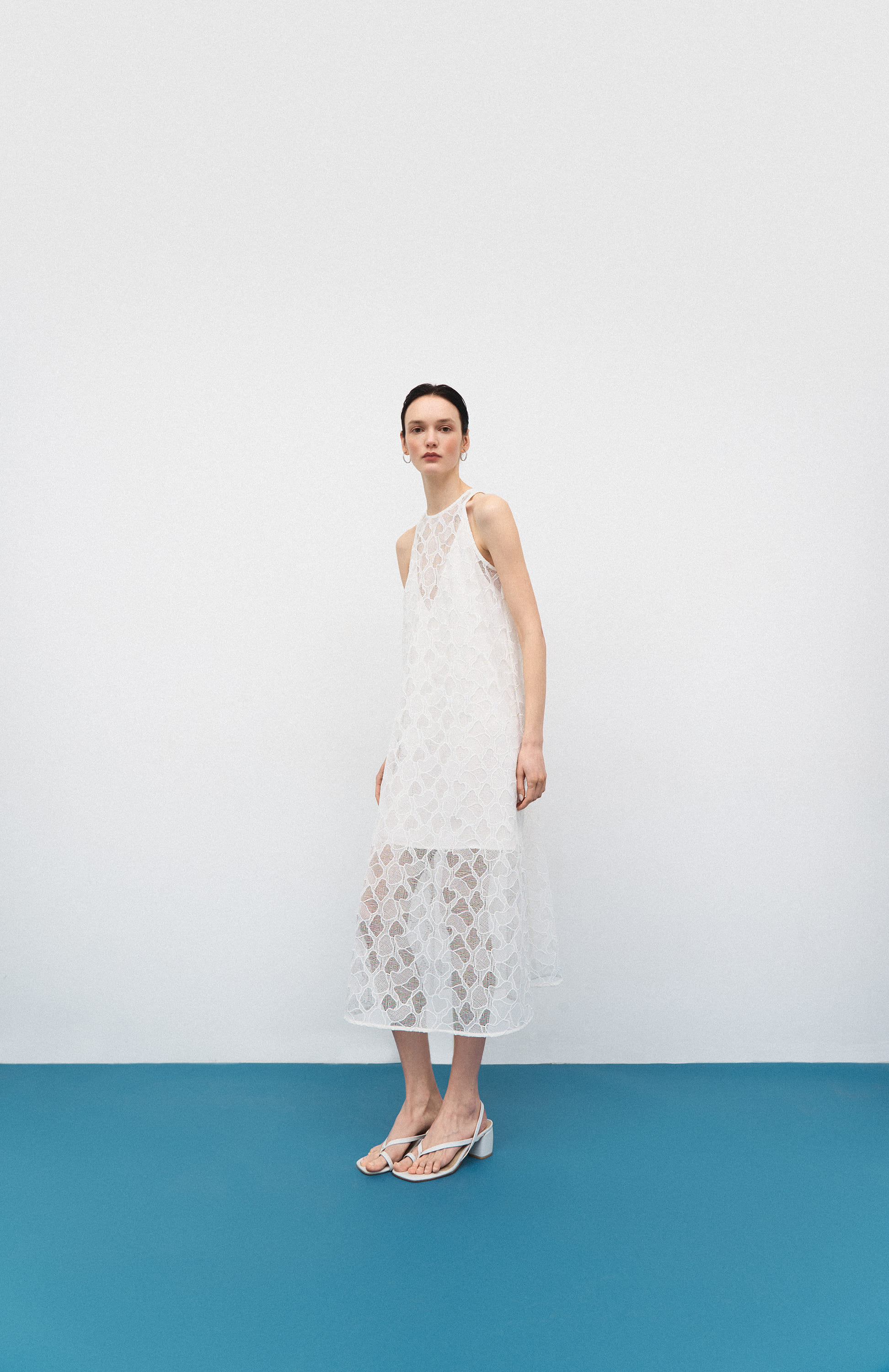 Саме ці мотиви можна знайти у білих та чорних вишиваних сукнях, які стали основою колекції. Важливою деталлю є нитки наче незавершенного шиття: це символ частково втраченого з корінням зв’язку, але який сьогодні українці мають шанс відновити.