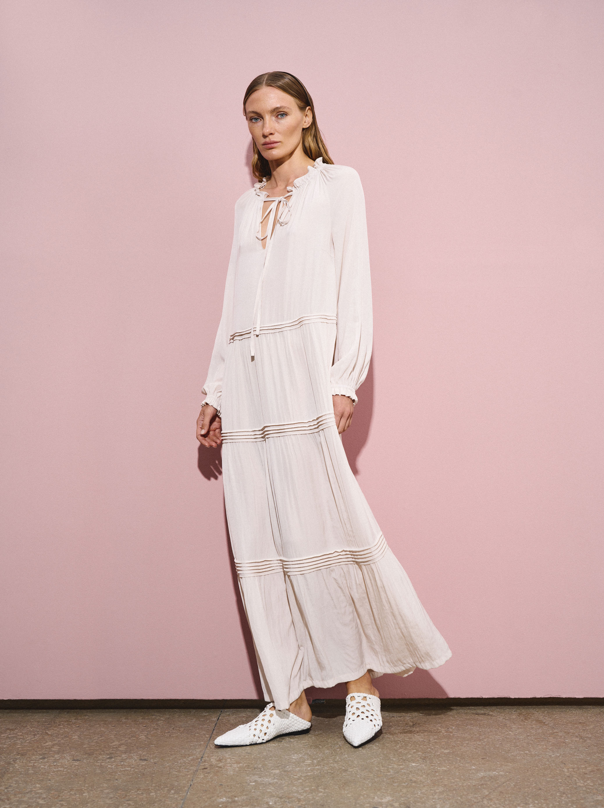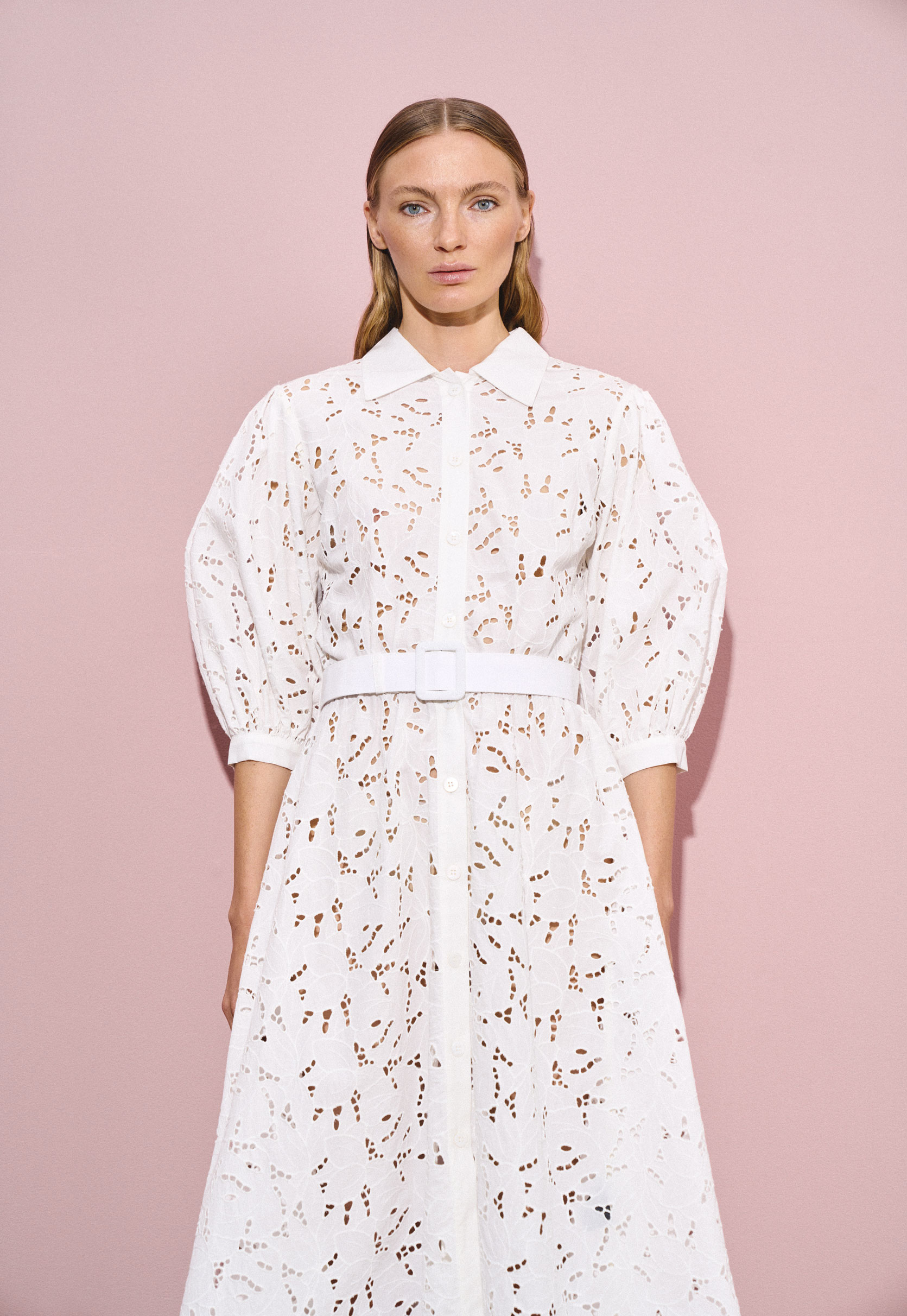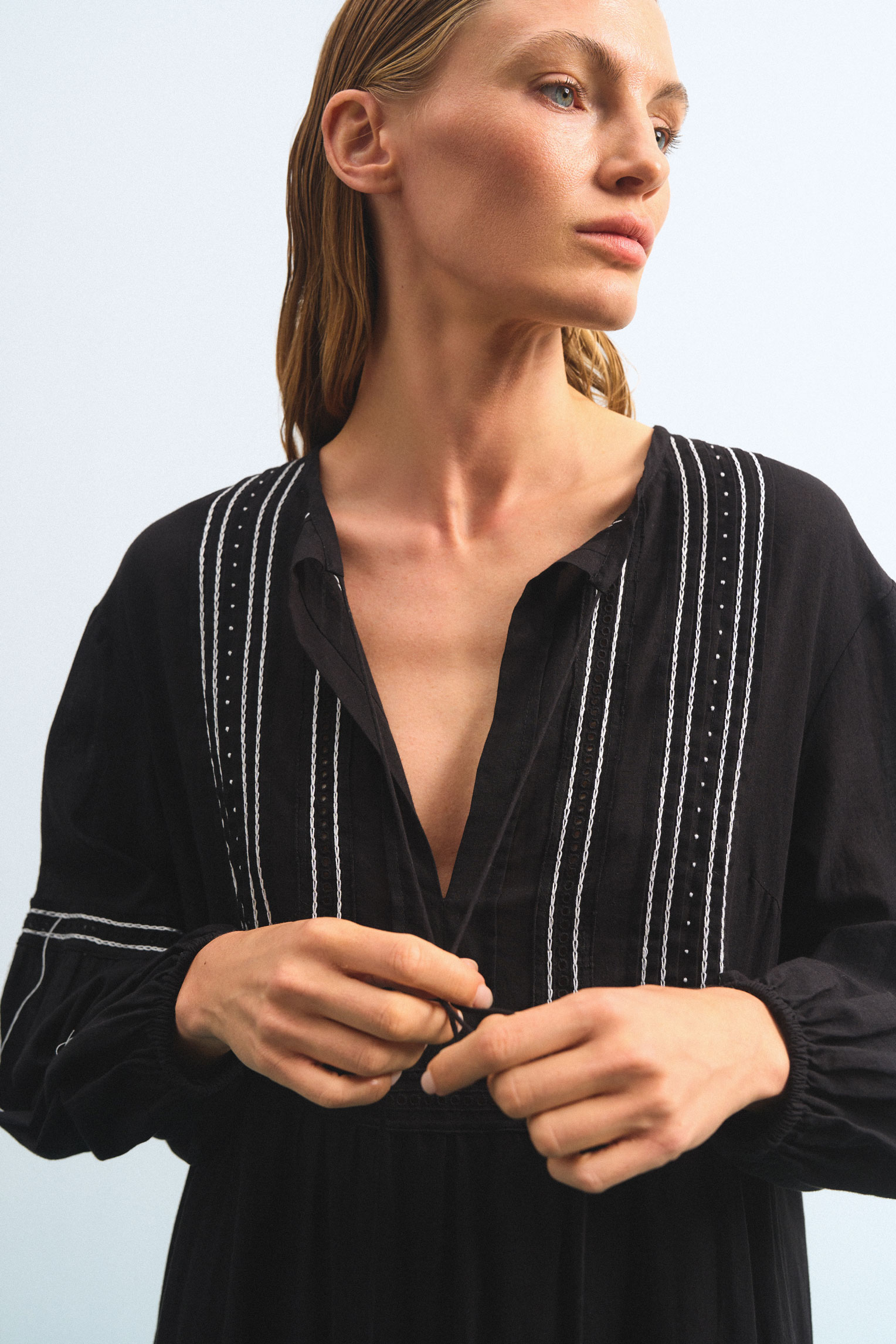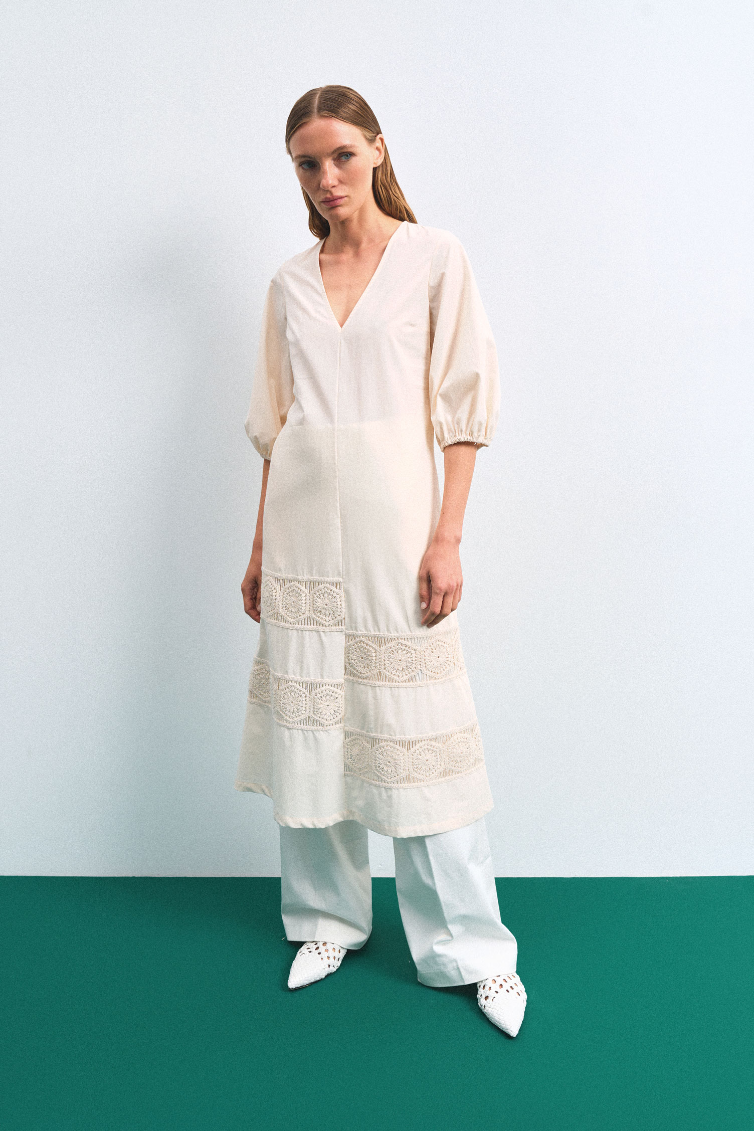 Витонченість шовку, доповнена дрібним квітковим принтом, ніжність суконь молочного кольору поєднується з етнічними деталями, застрочками та мереживами, що разом створюють атмосферу легкості та вишуканості, характерну для Poustovit.