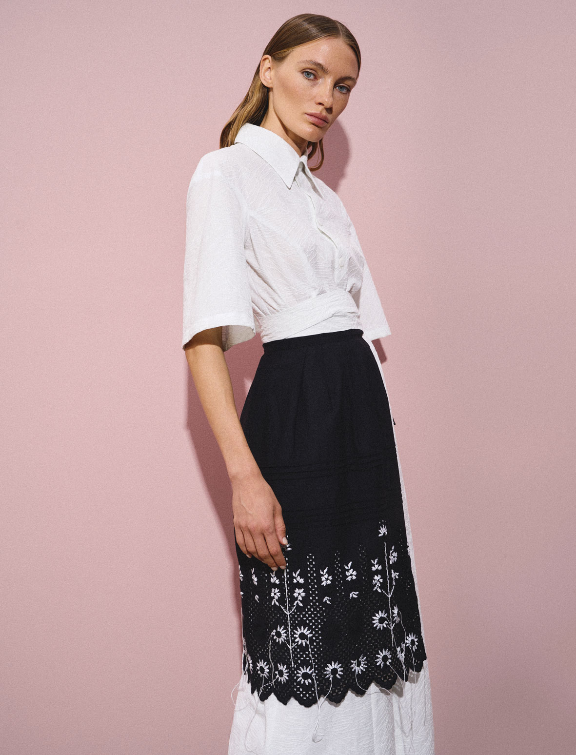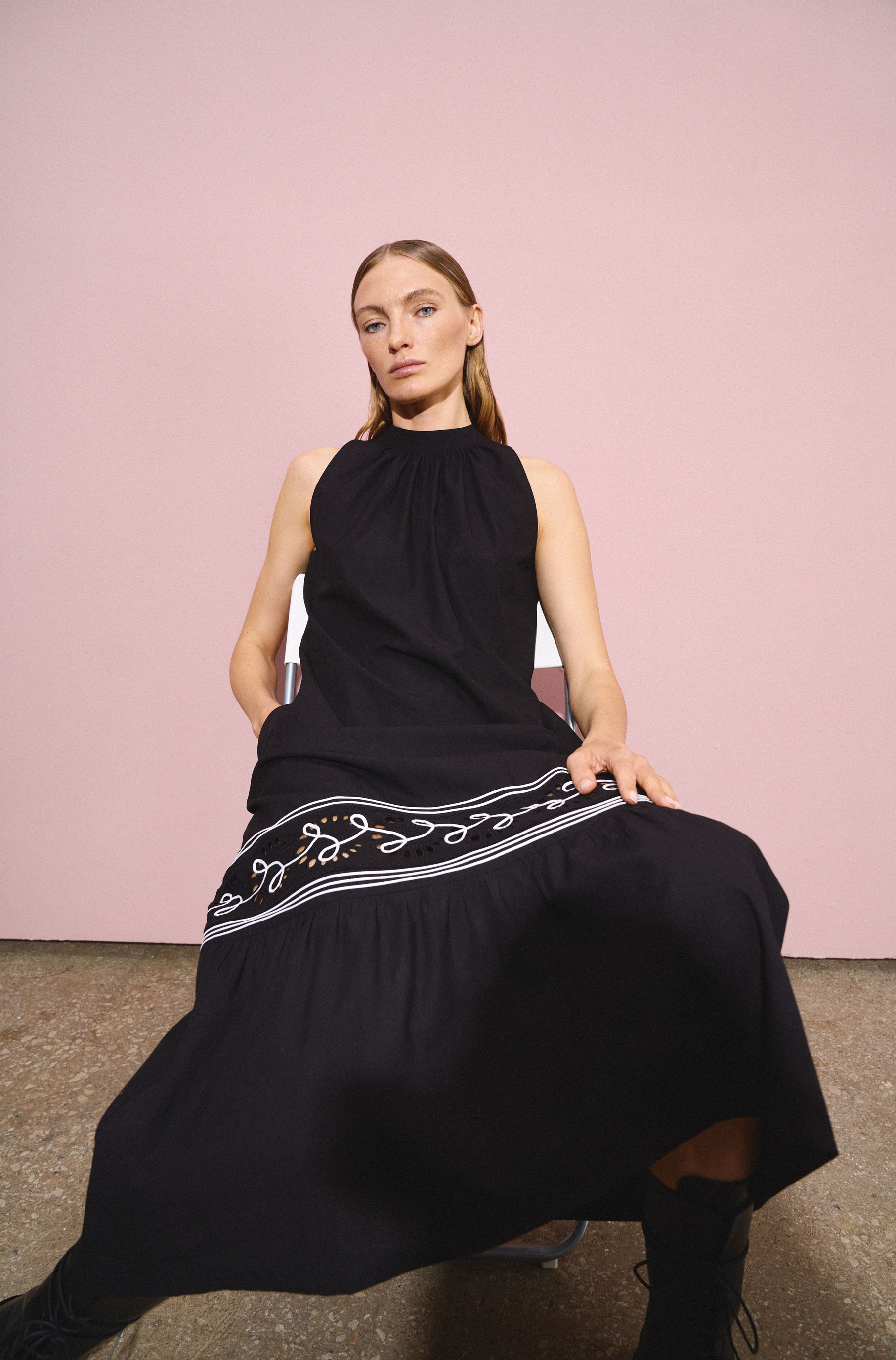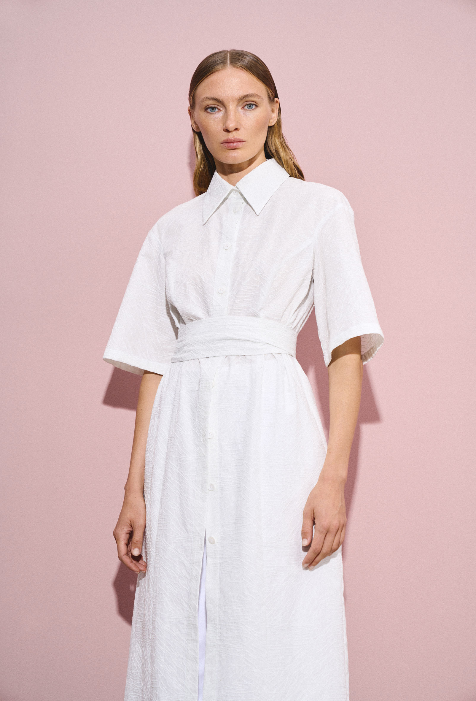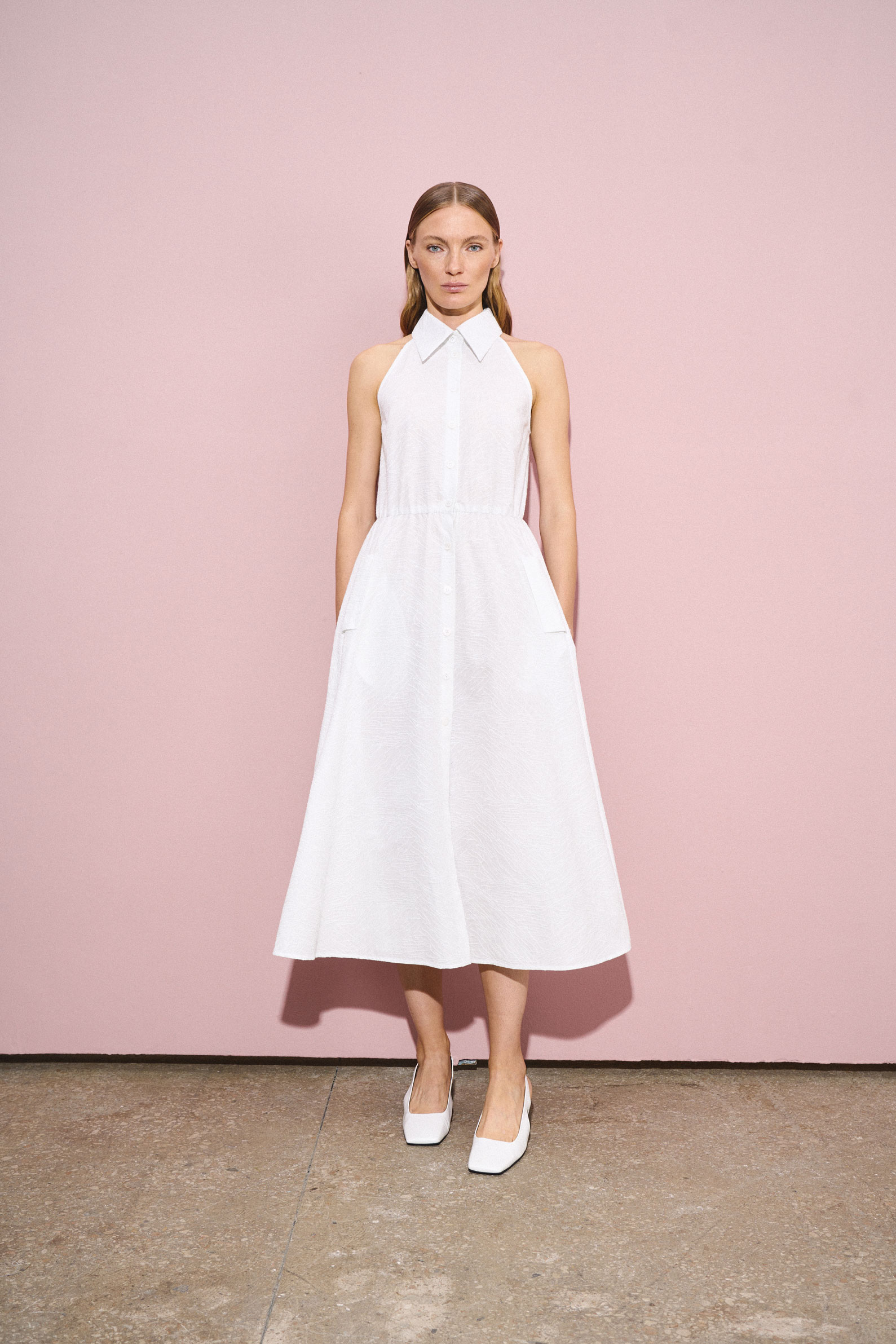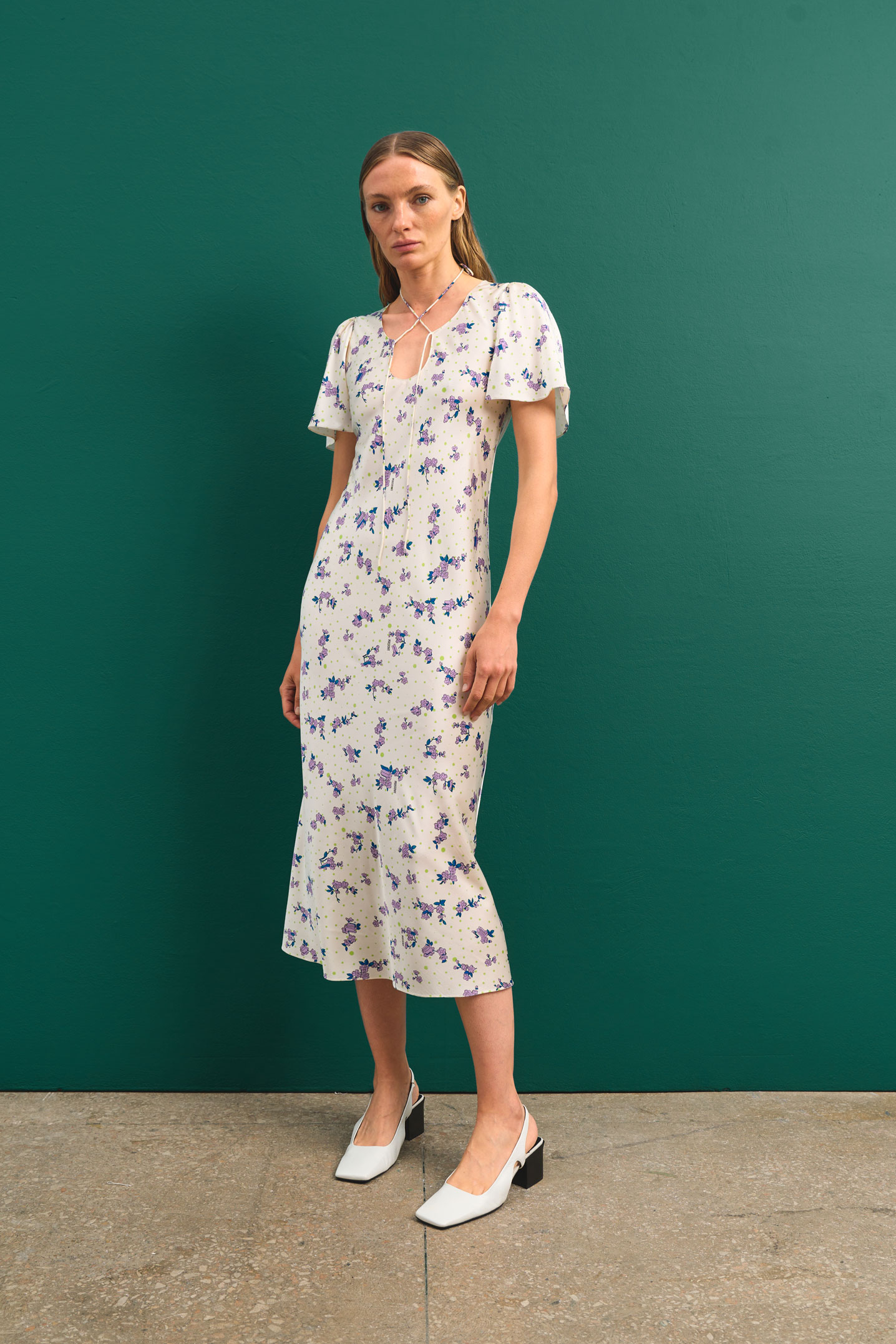 Витонченість шовку, доповнена дрібним квітковим принтом, ніжність суконь молочного кольору поєднується з етнічними деталями, застрочками та мереживами, що разом створюють атмосферу легкості та вишуканості, характерну для Poustovit.