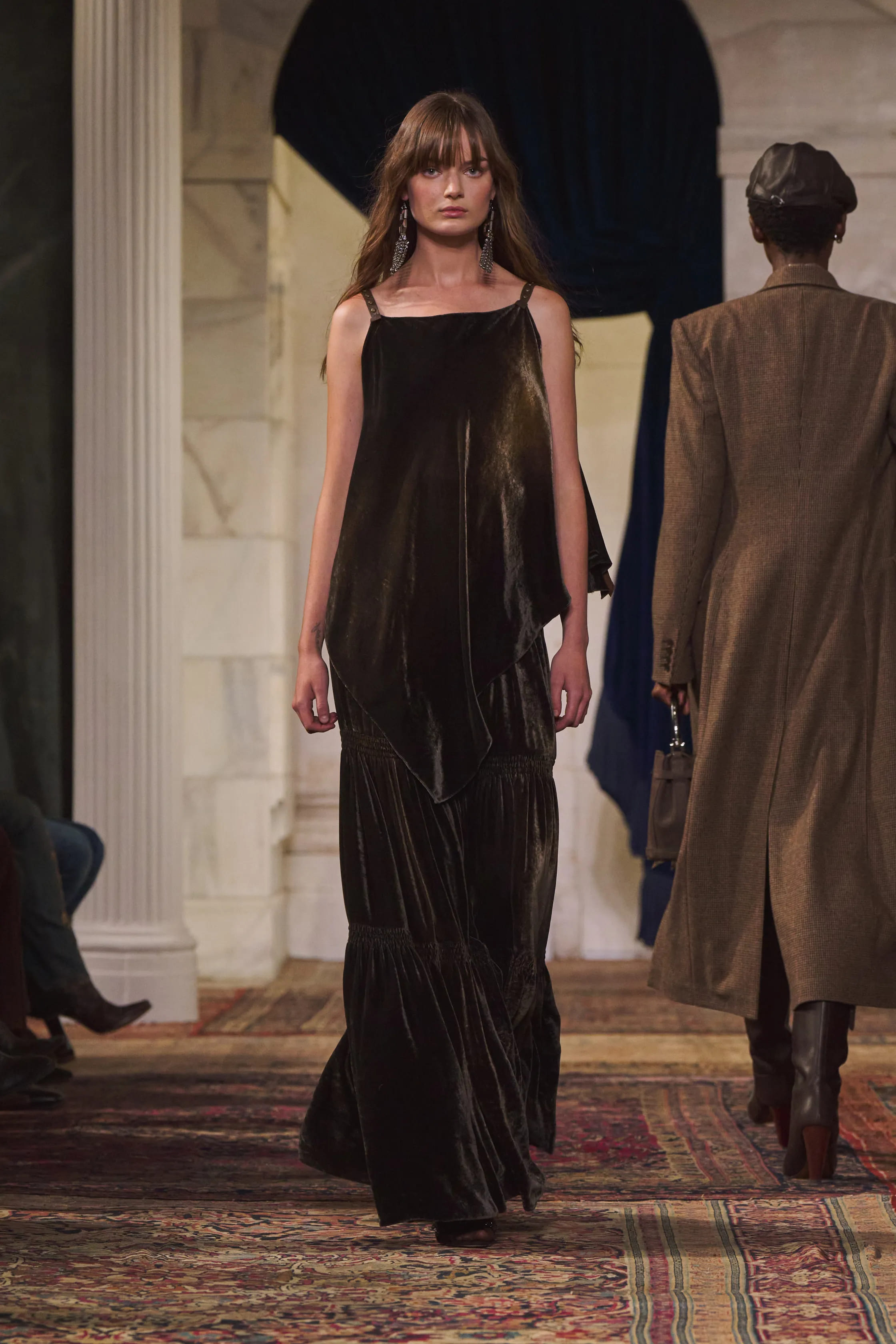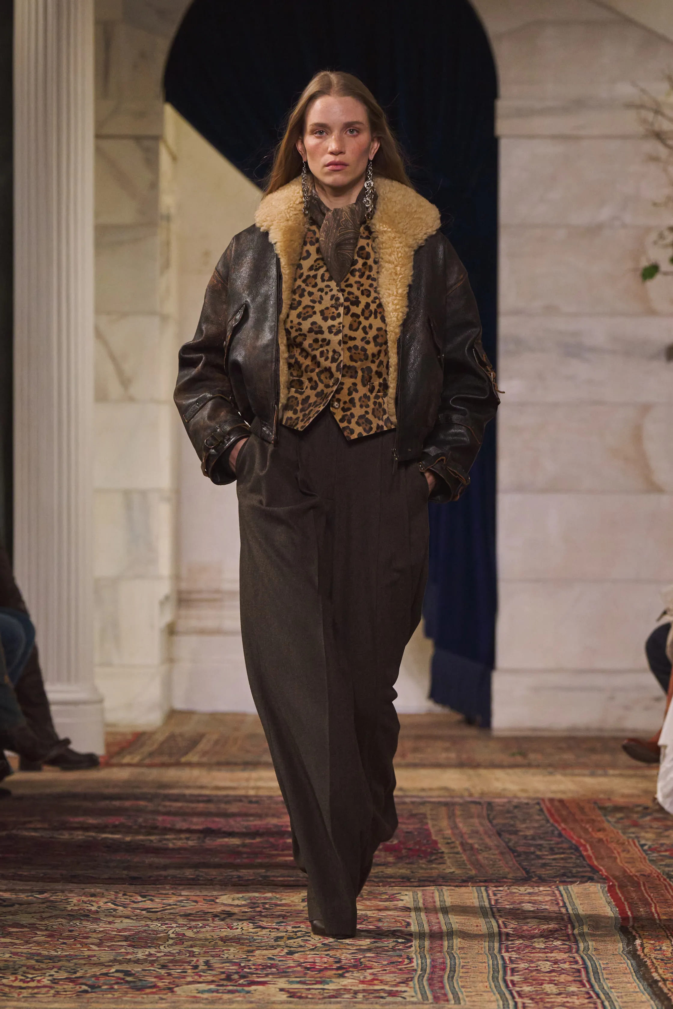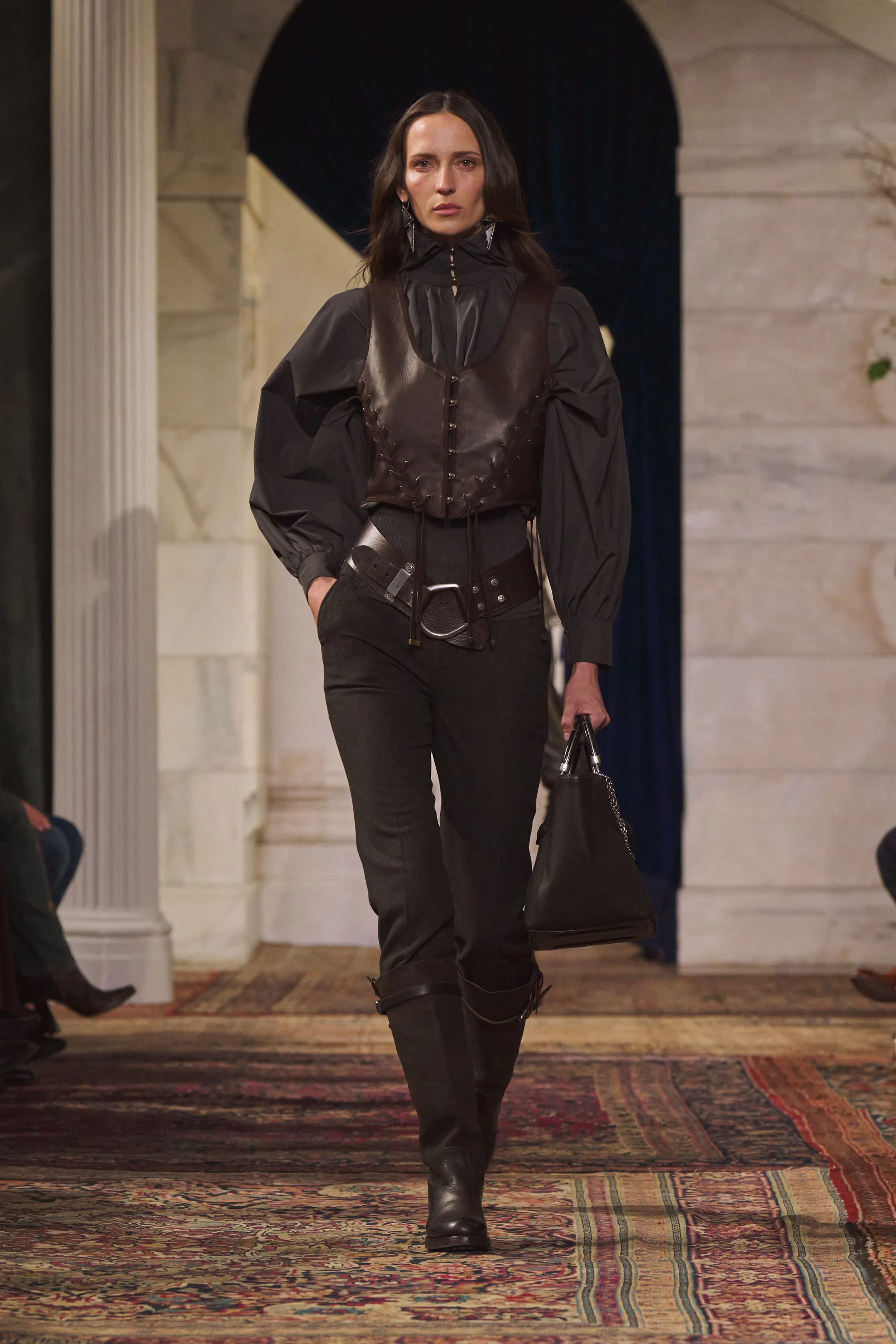 Для шоу простір нью-йоркської галереї сучасного мистецтва Джека Шейнмана Ralph Lauren перетворили на продуману сценографію: стіни прикрасили вручну розписаними полотнами із лісовими мотивами, а підлогу вкрили шарами вінтажних килимів. Такий декор підкреслив лейтмотив колекції — поєднання простоти з безумовною елегантністю.