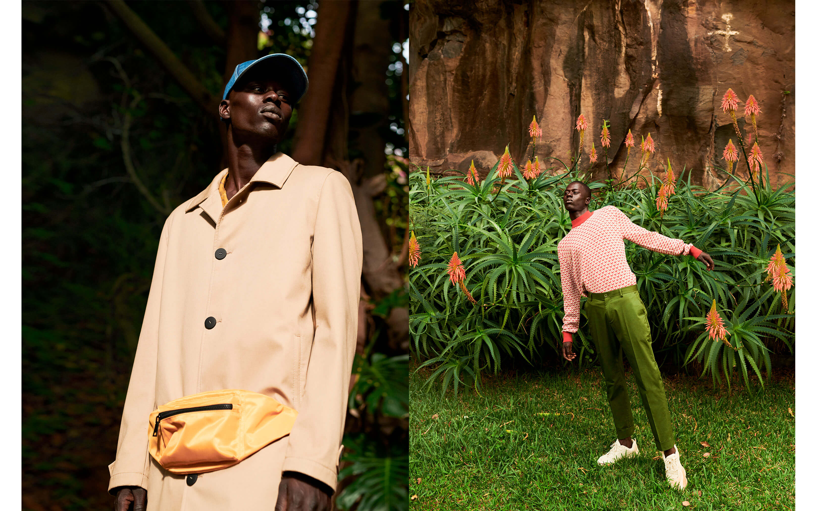 В отличие от женской серии с широкими брюками-кюлотами и свободными льняными рубашками, мужская коллекция в этом сезоне более приталенная и спортивная. В ней прослеживаются отсылки к спортивным трендам 1990-х, а главный акцент смещен в сторону геометрических форм – прямого кроя пальто, свободные чиносы со стрелками, приталенные костюмы и плащи. В коллекцию также вошли рубашки и спортивные бомберы с геометрическим принтом, трендовые спортивные кроссовки на толстой подошве и объемные универсальные мужские сумки. Смену сезона Reserved также подчеркнули за счет цветовой гаммы: сочные оттенки зеленого и синего дополнены горчичным, темно-красным и белым.
