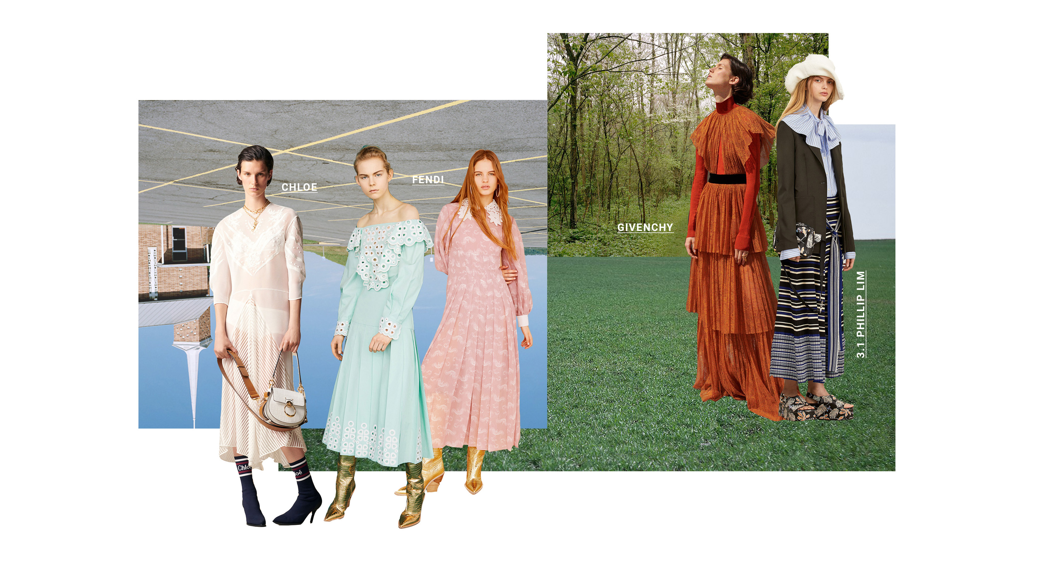 Верными своей эстетике остаются Chloe и Erdem: в их коллекциях – богемные девушки в легких платьях, украшенных вставками из нежного кружева, воланами и плетениями цветов. А Николя Гескьер в Louis Vuitton из сезона в сезон размышляет на тему ретрофутуризма: в его коллекциях викторианство и античность, высокие воротники и оборки дополняются стремительными силуэтами и материалами, которые принято ассоциировать с будущим технологий – пластиком и блестящими текстурами. А Клэр Уэйт Келлер в Givenchy, пытаясь аккуратно закончить барочную главу Риккардо Тиши в истории Дома, посвящает круизную коллекцию Японии – ее героини внутренне сильны и целостны, что не мешает им носить аристократичные плиссированные платья.
