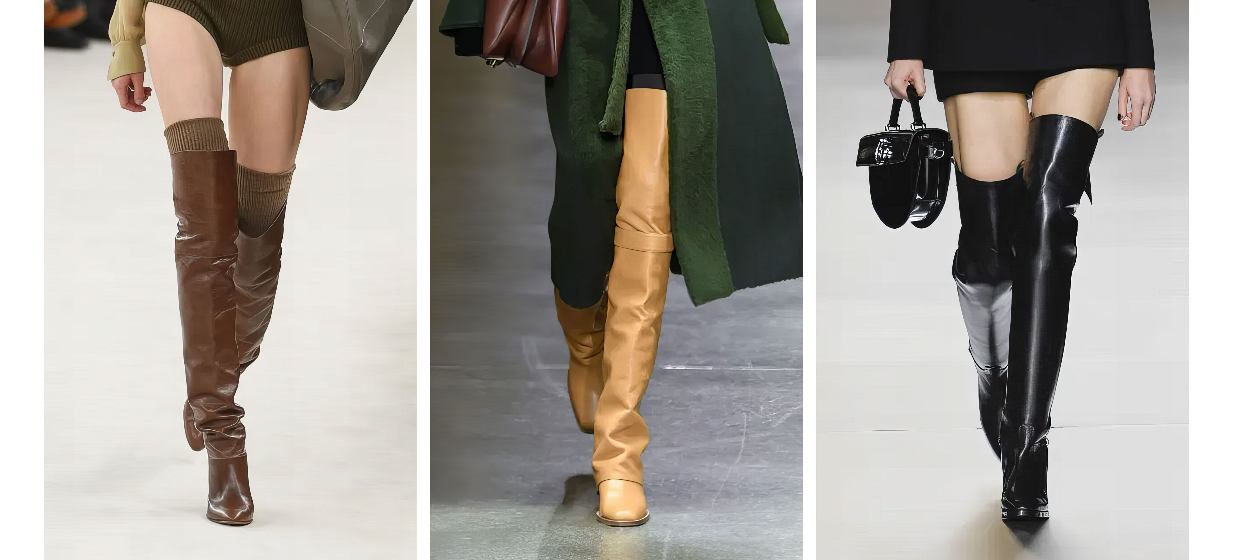 Проти поганої погоди й задля стильних образів — одні з характеристик, чому чоботи вище коліна вартують уваги. У Chloé, Fendi й Gucci їх пропонують одягати зі струмливими, прозорими максісукнями, мінісукнями, поверх приталеного низу або з короткими шортами.