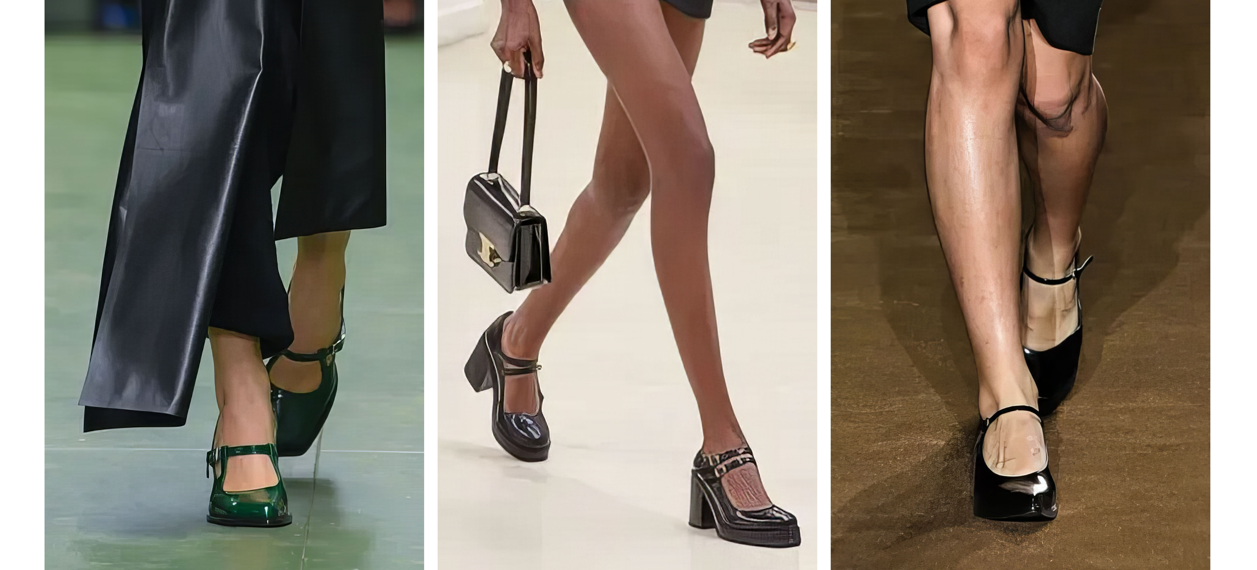 Уже кілька сезонів тренди взуття неодмінно включають Mary Jane — елегантне взуття із закритим мисом, товстішими підборами та ремінцем у зоні щиколотки. Цього сезону, особливо осінню, воно також не втратить власної актуальності. Celine пропонують надати перевагу позачасовій чорній моделі, як і Miu Miu. Місце кольору теж знайшлося — в Loewe представили темно-зелені Mary Jane.