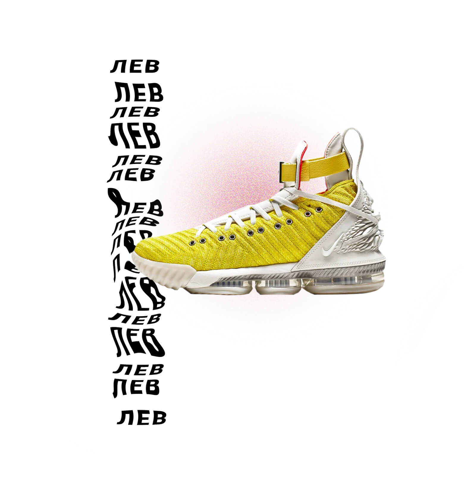 Желтые кроссовки из коллаборации Леброна Джеймса и Nike украшены серебряными деталями, вишневыми акцентами и головами львов. Такая пара станет центральным акцентом всего образа, а для динамичных Львов — еще и смелым заявлением.