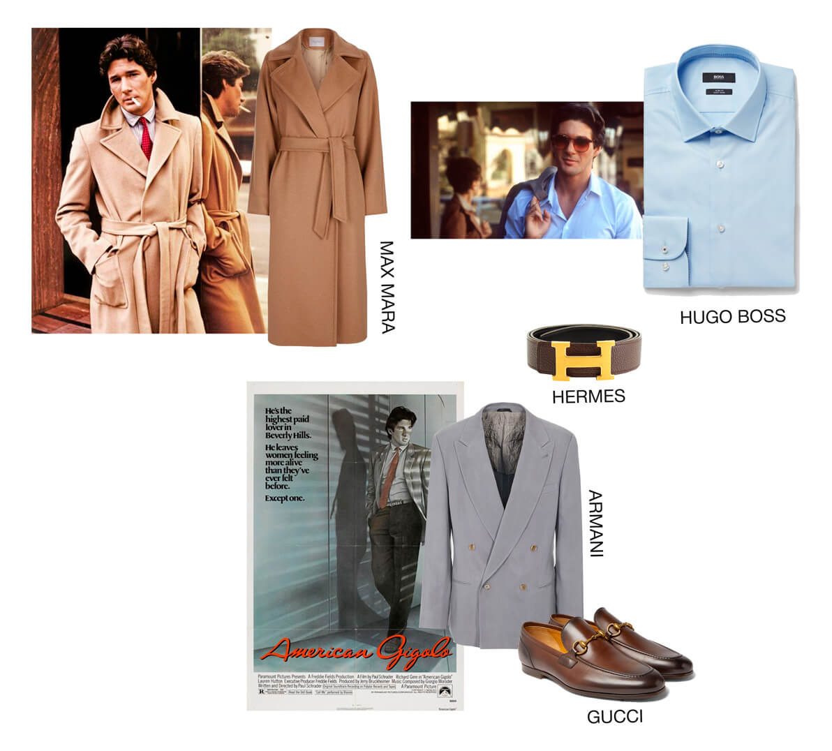 Молодой Ричард Гир садится в кабриолет, едет по Беверли-Хиллз и покупает идеально сидящий костюм Armani. “Американский жиголо” стал первым примером открытого продакт-плейсментa в кино. Конечно, в фильмах и раньше упоминали модные бренды, а дизайнеры не впервые одевают главных героев в кино. Но в “Американском жиголо” это впервые сделали так откровенно: в двухминутном эпизоде полуобнаженный Ричард Гир выбирает между десятками пиджаков, рубашек и галстуков, на которых так хорошо виднеется логотип и даже фактура ткани. Актер раскладывает костюмы по всей комнате, напевая популярную в те времена песню The Love I Saw In You Was Just A Mirage и тщательно составляя образы на неделю вперед.