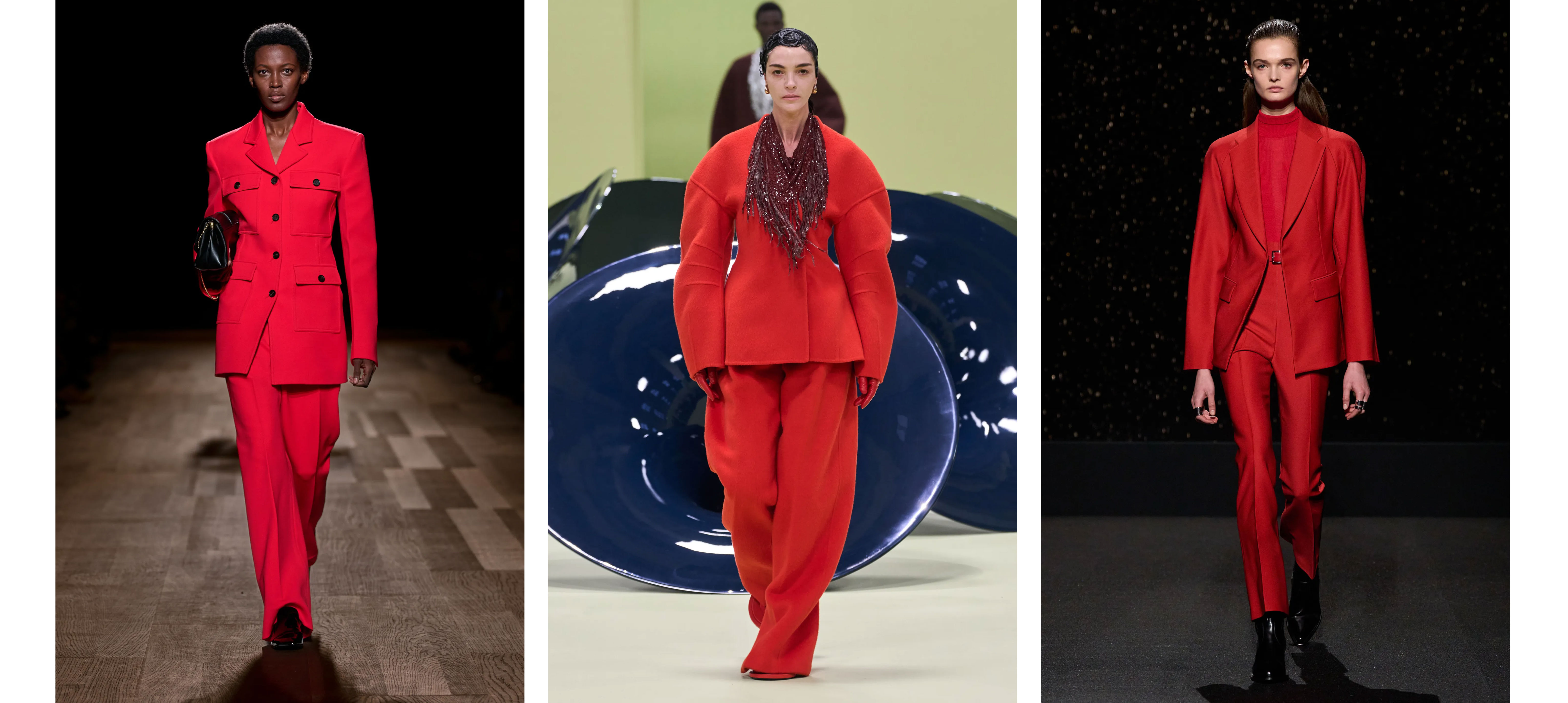 Протягом кількох сезонів поспіль червоний залишається найгарячішим кольором. Особливо ефектно він виглядає в поєднанні з костюмом, як підтверджують Jil Sander, Hermès і Ferragamo.