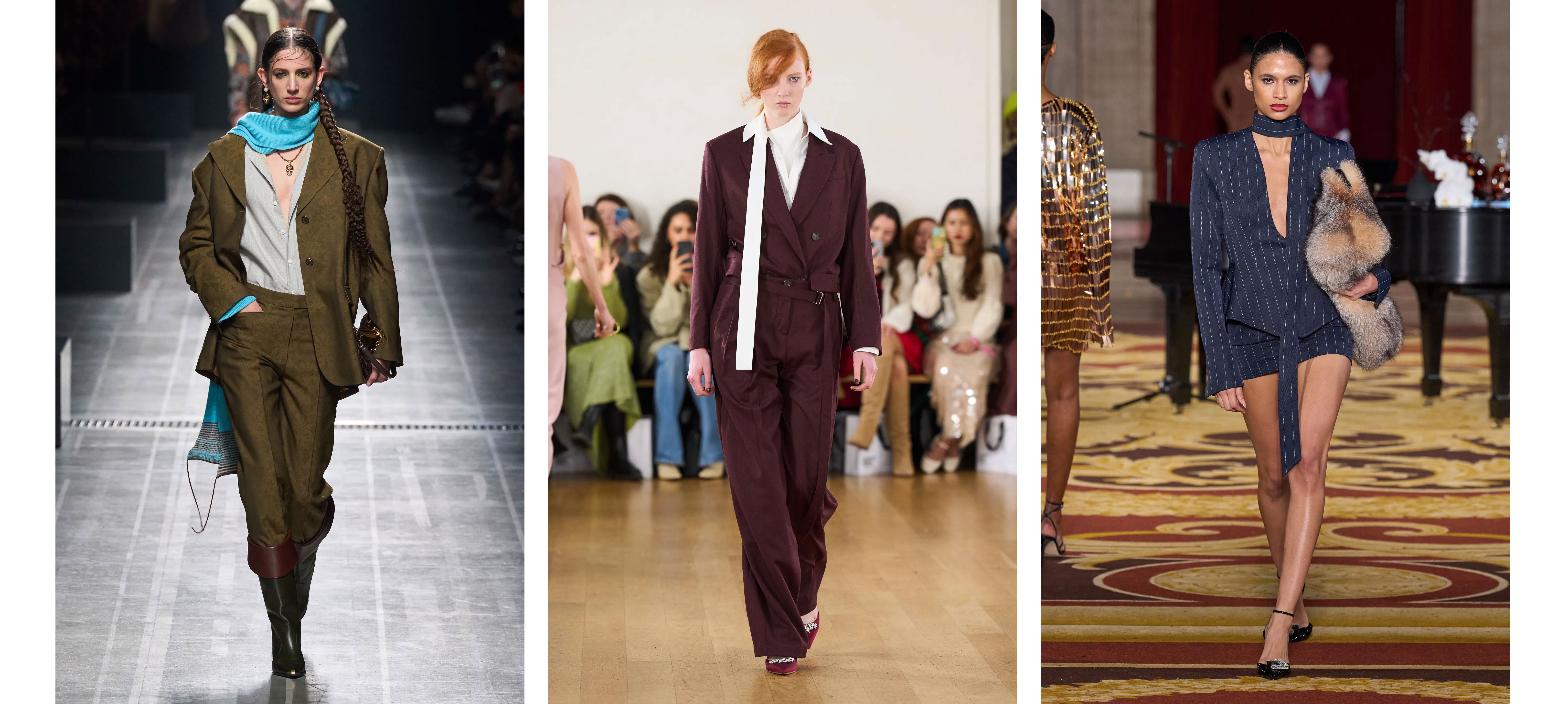 Інтеграція в ансамбль шарфа або стрічки — легкий, проте романтичний і невимушений спосіб зробити образ із костюмом більш цікавим. Такий прийом ми помітили в Etro, де показали акцентний блакитний шарф, на подіумі Eudon Choi та бренду-фаворита Бейонсе й кандидатки в президенти США Камали Гарріс LaQuan Smith.