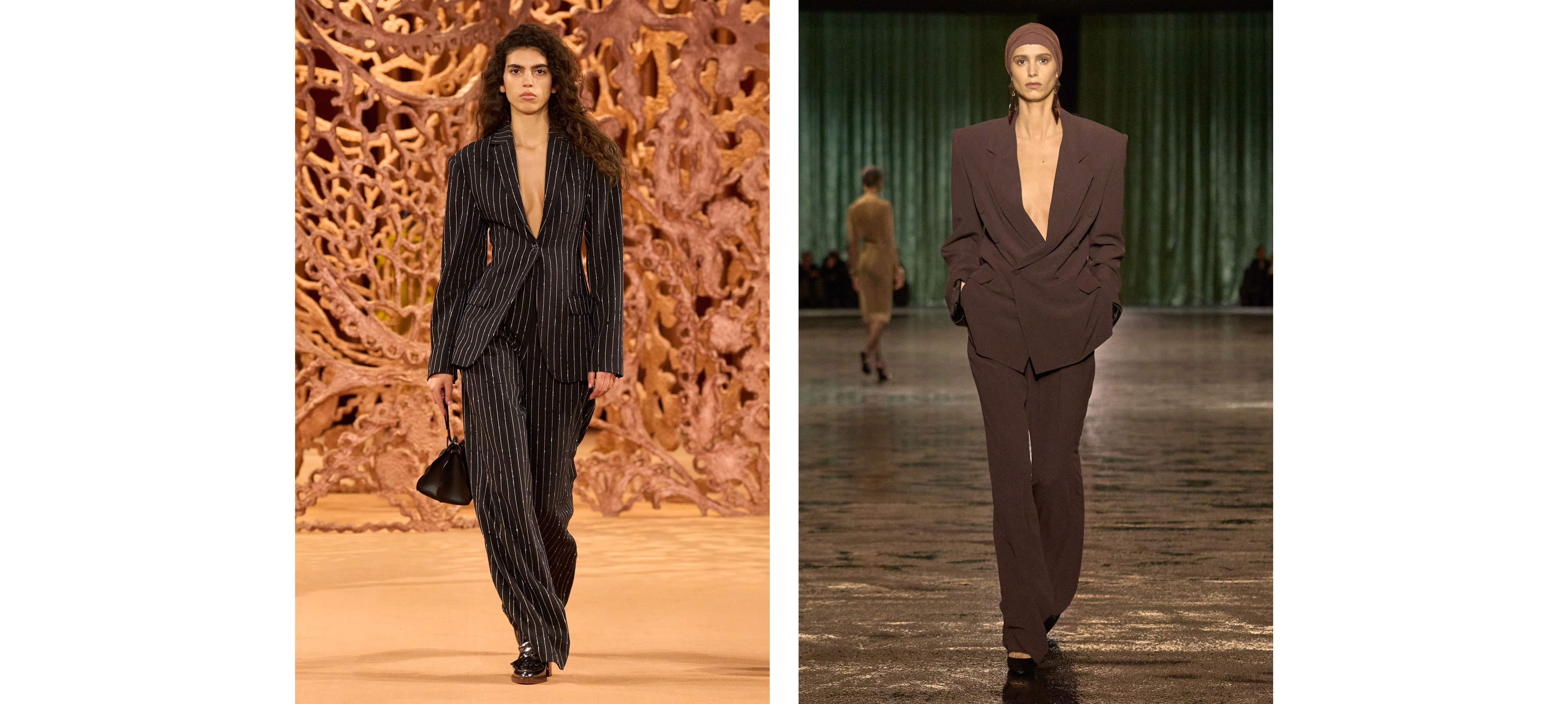 Для тих, хто в пошуку спокусливих і вишуканих вбрань, костюм із глибоким V-вирізом є ідеальним варіантом. Приміром, Saint Laurent презентують таку модель у трендовому шоколадному кольорі, а Ulla Johnson — у не менш трендовій тонкій вертикальній смужці.