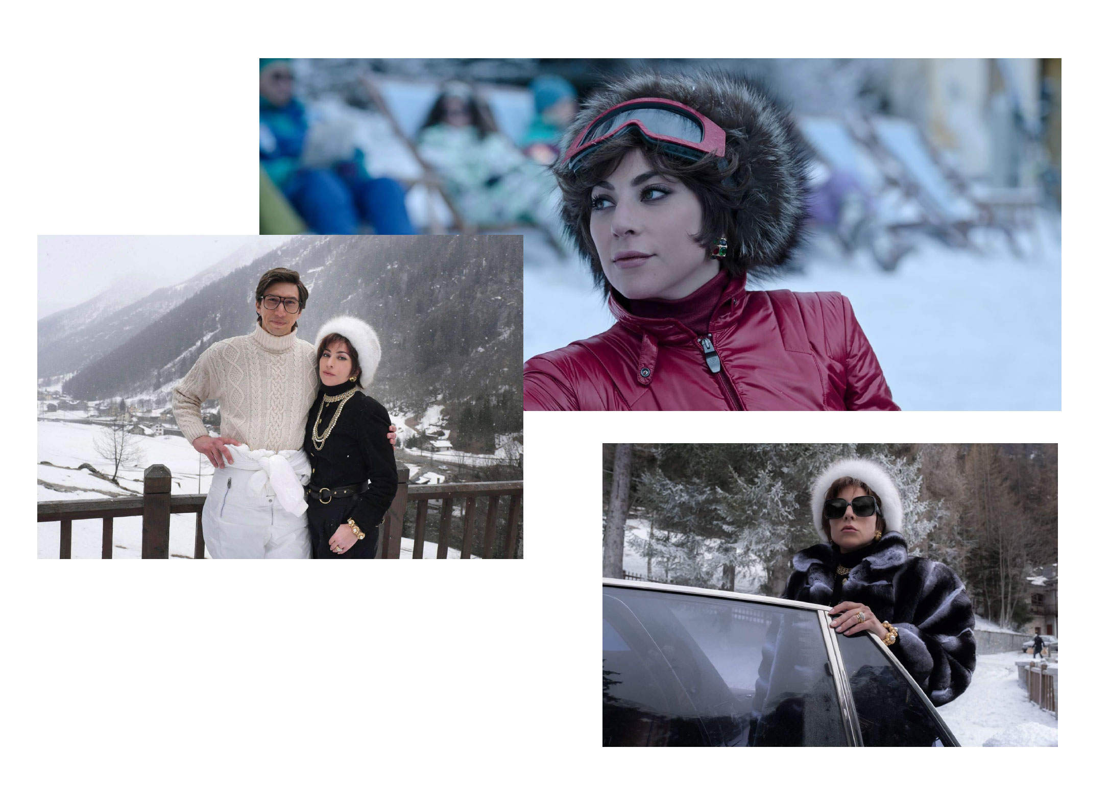 Біографічна драма «Дім Ґуччі» висвітлює падіння сім’ї Ґуччі, котра сьогодні більше не володіє однойменним модним домом. У фільмі Леді Гага перевтілюється в Патрицію Реджані — дружину спадкоємця компанії Мауріціо Ґуччі. Для її героїні було розроблено понад 50 вишуканих образів, включаючи, звісно, одяг Gucci. Особливої уваги варті образи персонажки Леді Гаги на зимовому відпочинку, де римуються хутряні головні убори й масивні прикраси.