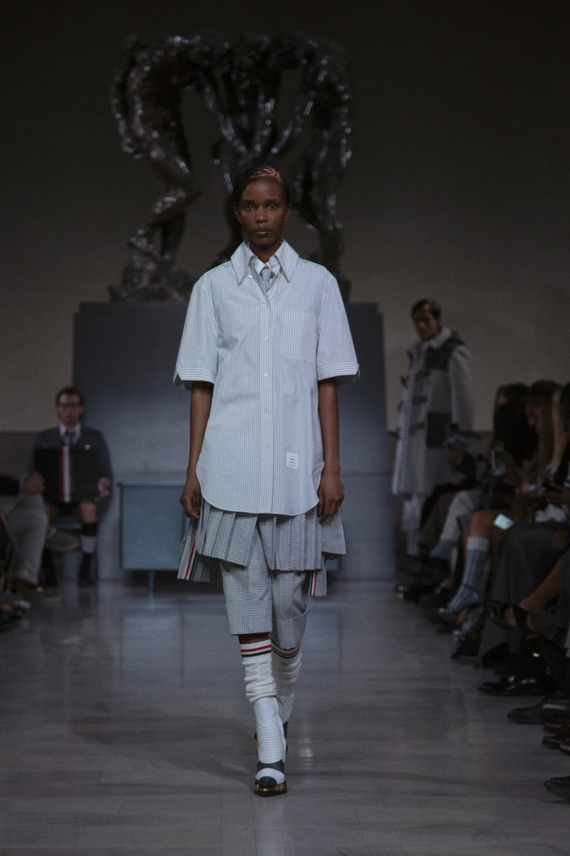 У центрі колекції сезону fall-winter – 2026 — рефлексія над модною практикою довжиною у чверть століття. Тут Том Браун повертається до витоків: класичного костюма, точних пропорцій і діалогу між кравецькою традицією та спортивним одягом. Головним відтінком колекції був обраний сірий – знаковий колір, який нерозривно асоціюється з американським брендом.