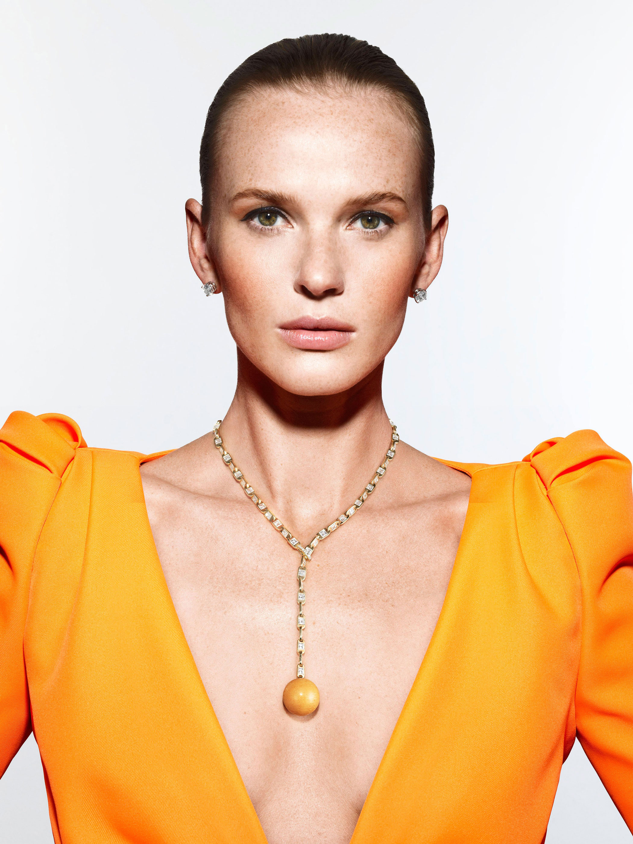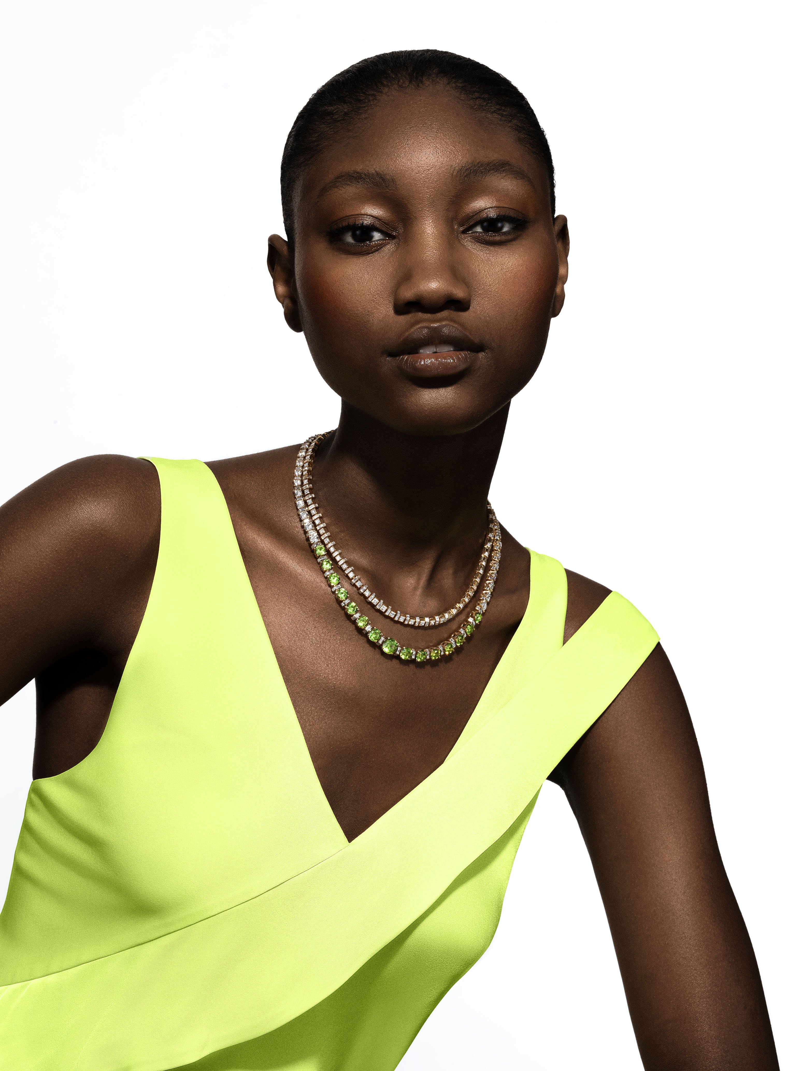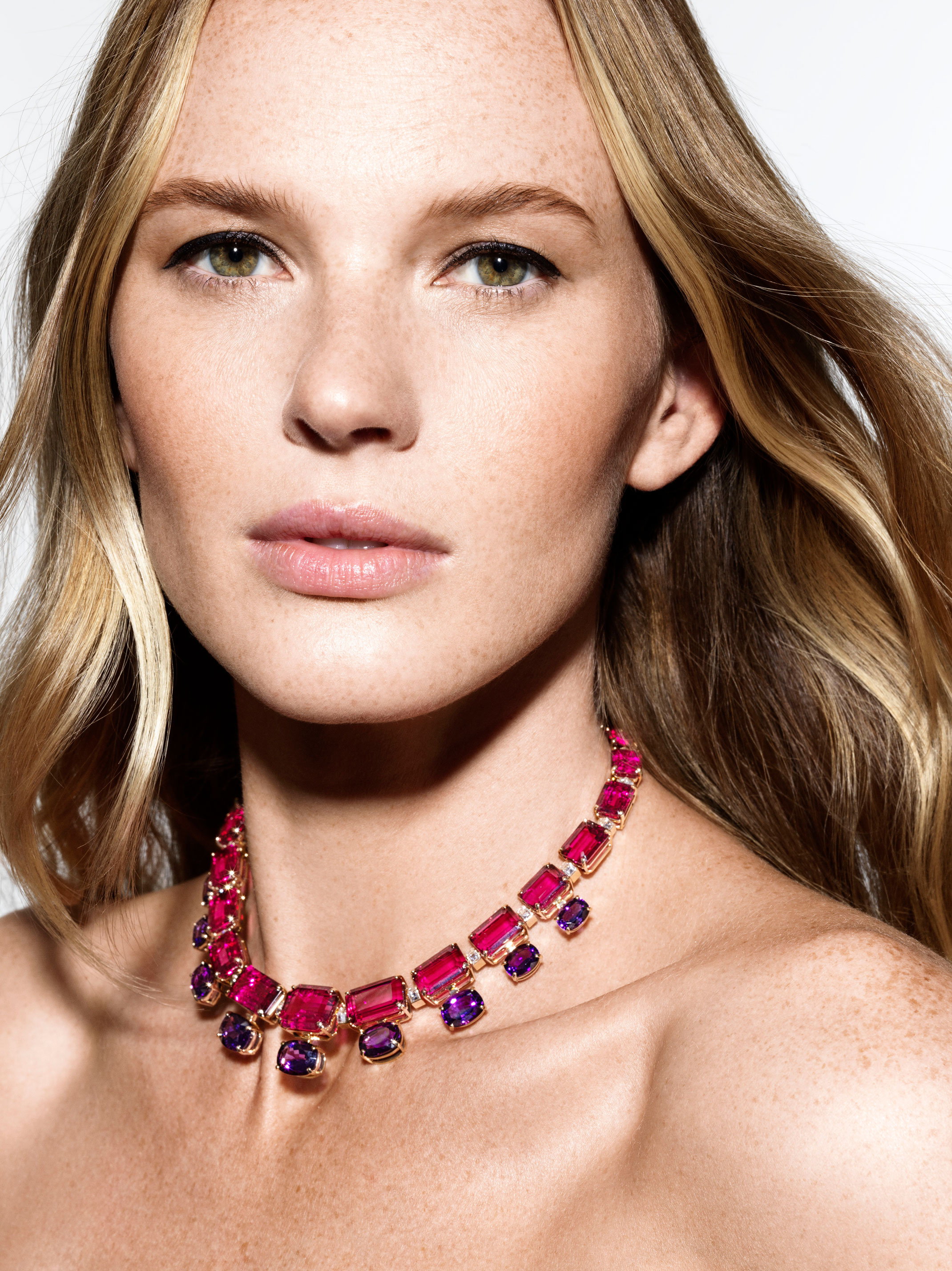 Самым смелым цветовым шедевром в коллекции является колье, состоящее из семи различных драгоценных камней, на приобретение которых ушло более года: аквамаринов, танзанитов, розовых, оранжевых и зеленых турмалинов, рубеллитов и морганитов — в общей сложности 278 карат. Во всей коллекции прослеживаются захватывающие дух всполохи цвета: колье из шпинели и фиолетовых сапфиров, общим весом более 81 и 39 карат соответственно, вдохновлено перьями экзотических птиц, в то время как редкая жемчужина Melo Melo, весом более 95 карат, светится ярко-оранжевым цветом, балансируя на колье из желтого золота в 18 карат и бриллиантов. Зеленые турмалины изумрудной огранки, общим весом более 77 карат, перетекают в градуированные сапфиры индивидуальной огранки общим весом более 29 карат, усиливая электрические оттенки глубоководной флоры и фауны.