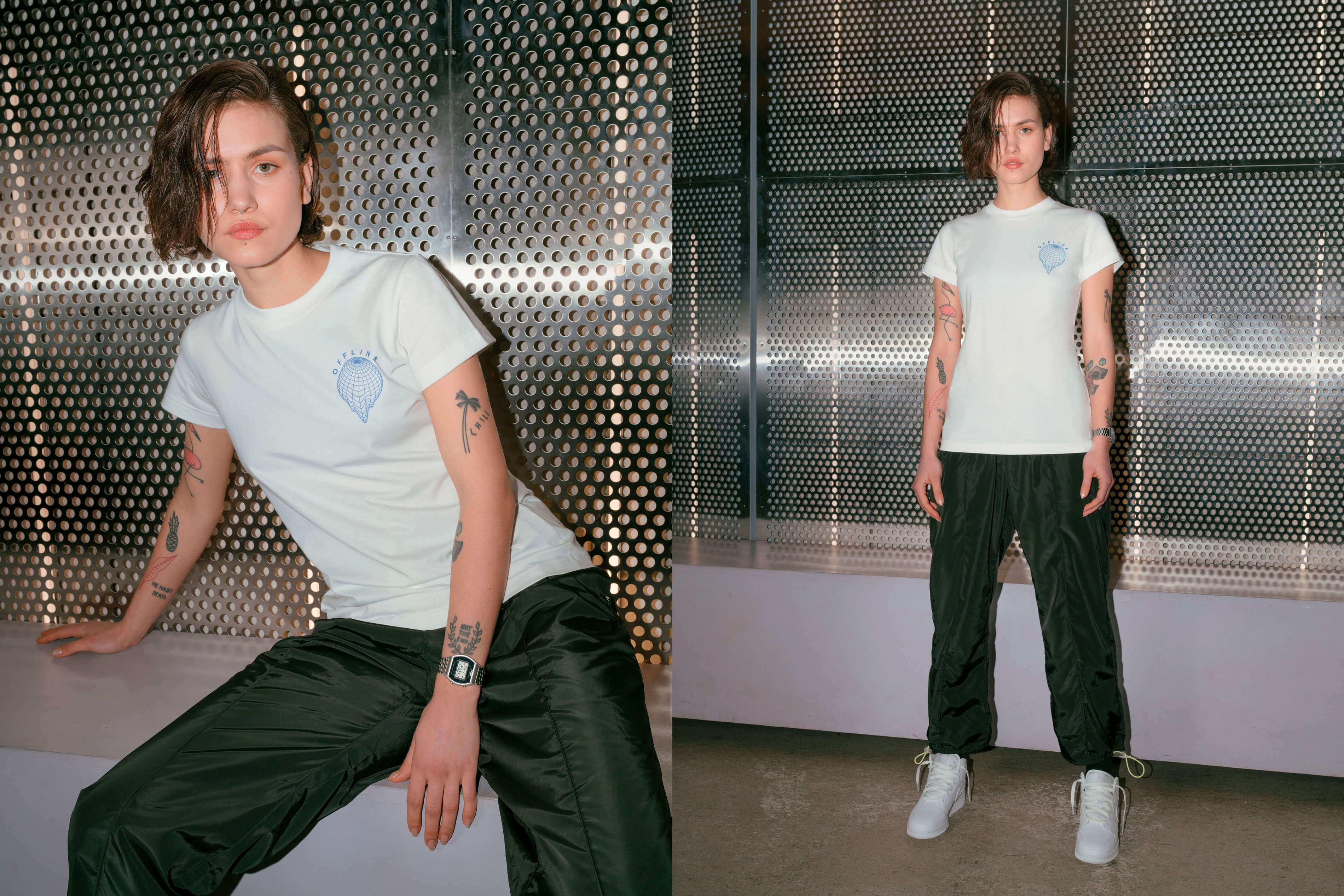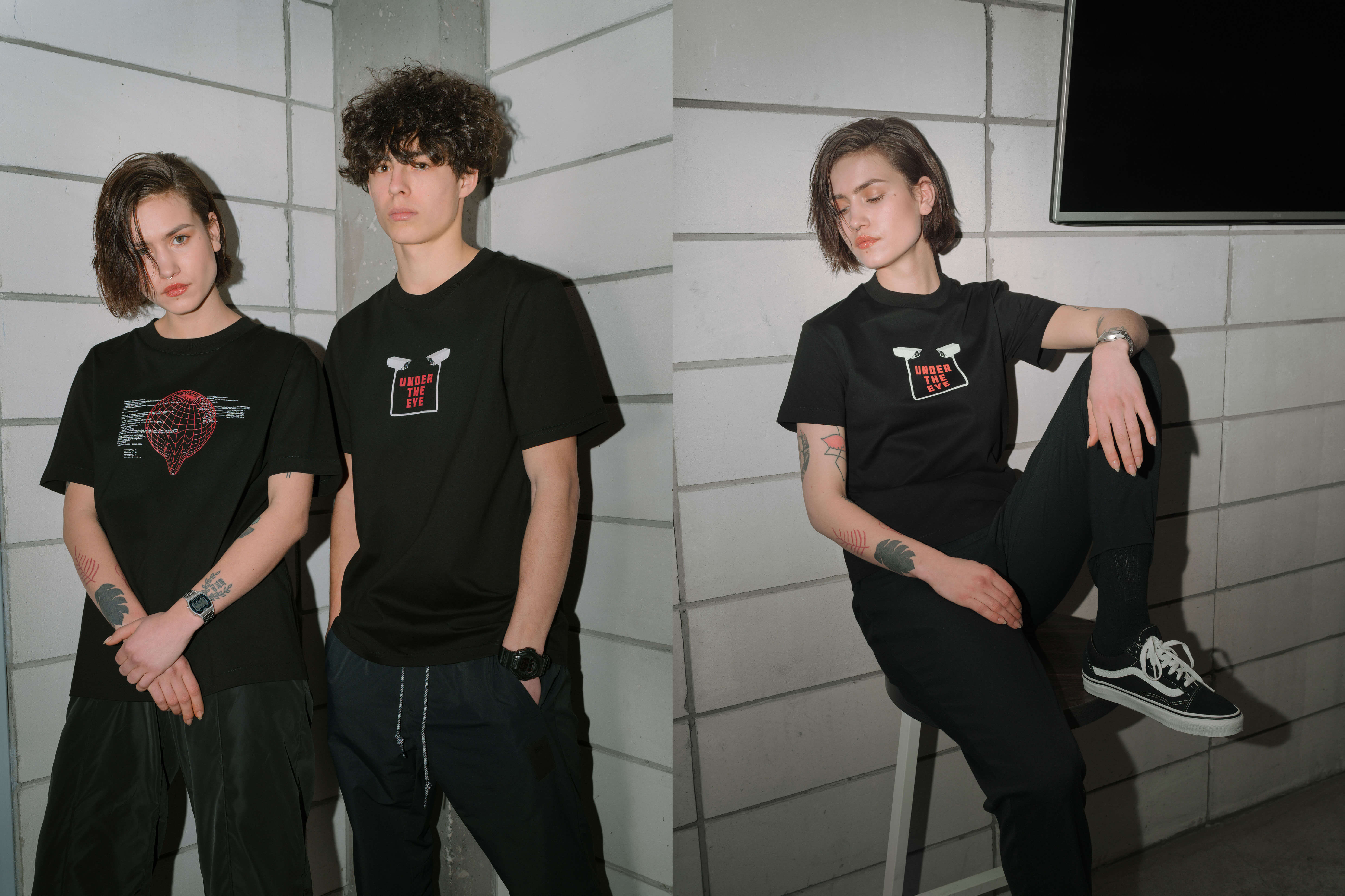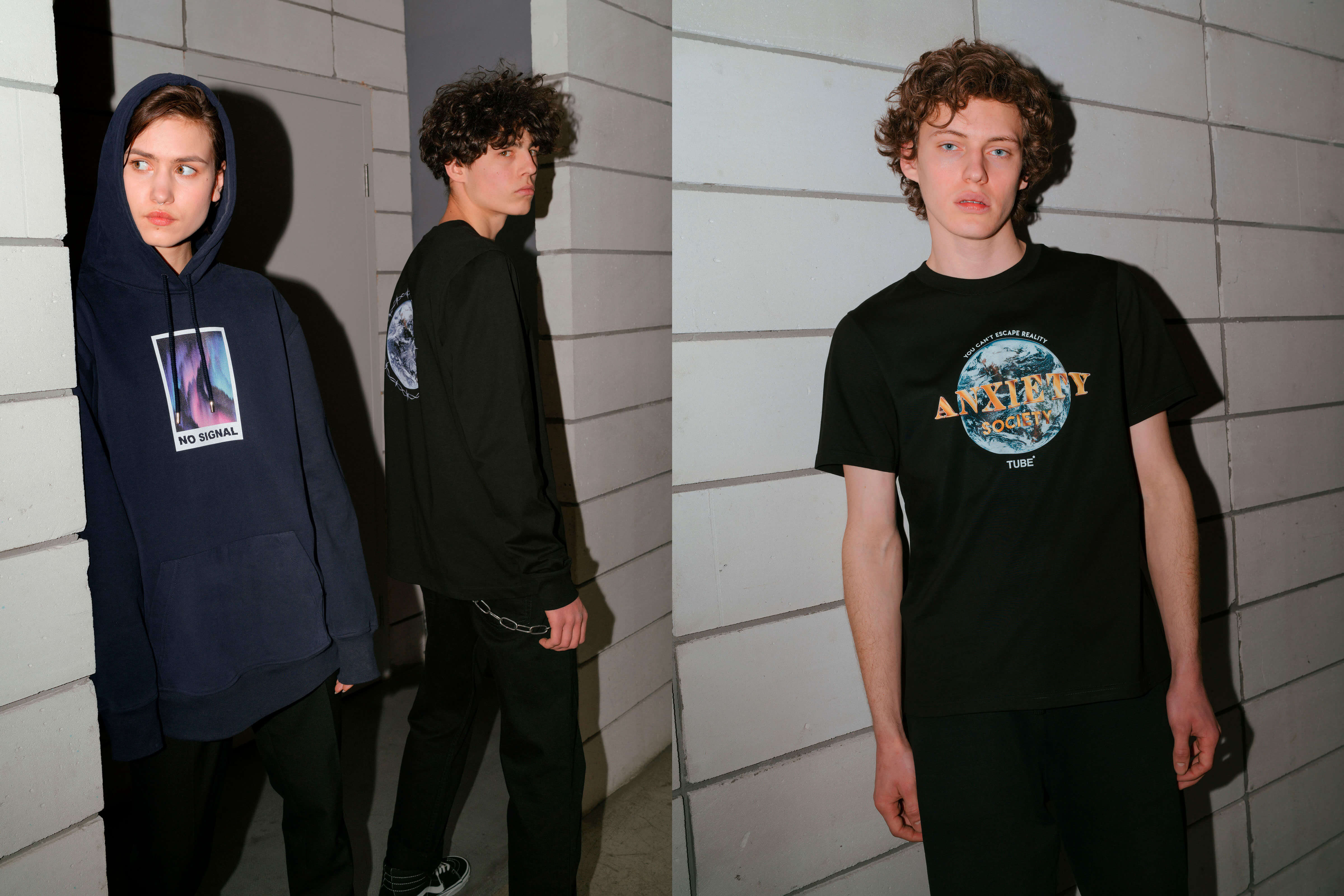 Все вещи выполнены в четырех цветах — черном, белом, синем и хаки и дополнены яркими тематическими принтами: планета, окутанная орбитой из колючей проволоки, изображения видеокамер, бюсты средневековых статуй и графические сетки. Коллекция уже доступна к предзаказу на сайте TUBE.