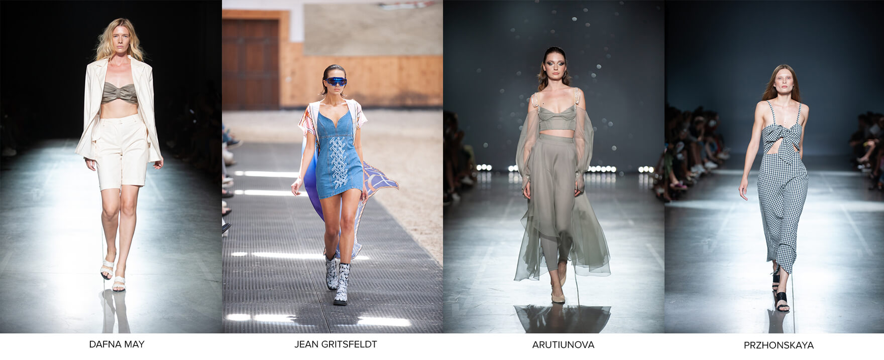 Вещи из денима — мини в стиле 80-х и просторные костюмы — показали Jean Gritsfeldt, Dafna May и Елена Пржонская, а еще можно дополнить джинсовый тренд топами и бюстье с бантовой перевязью на груди.
