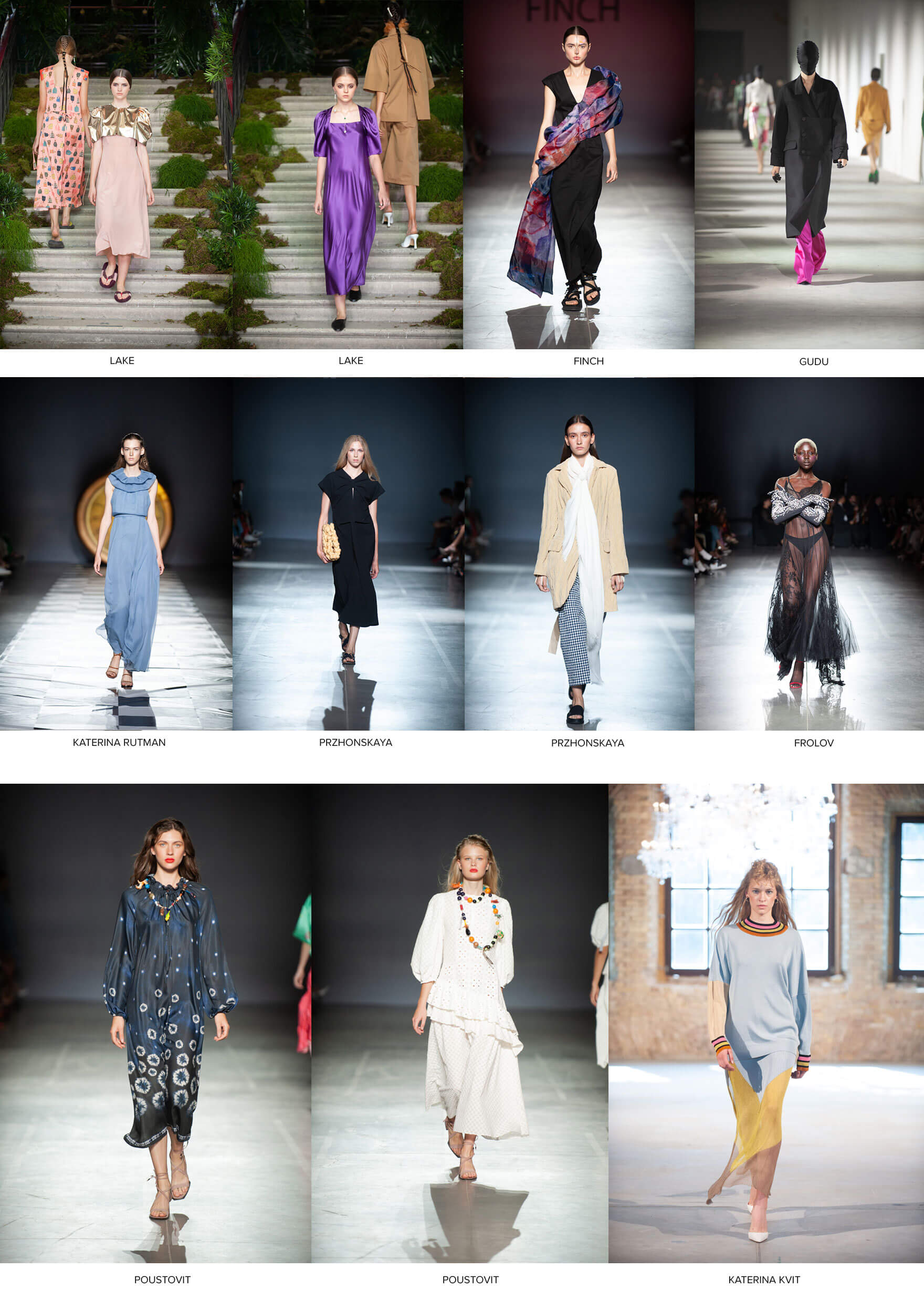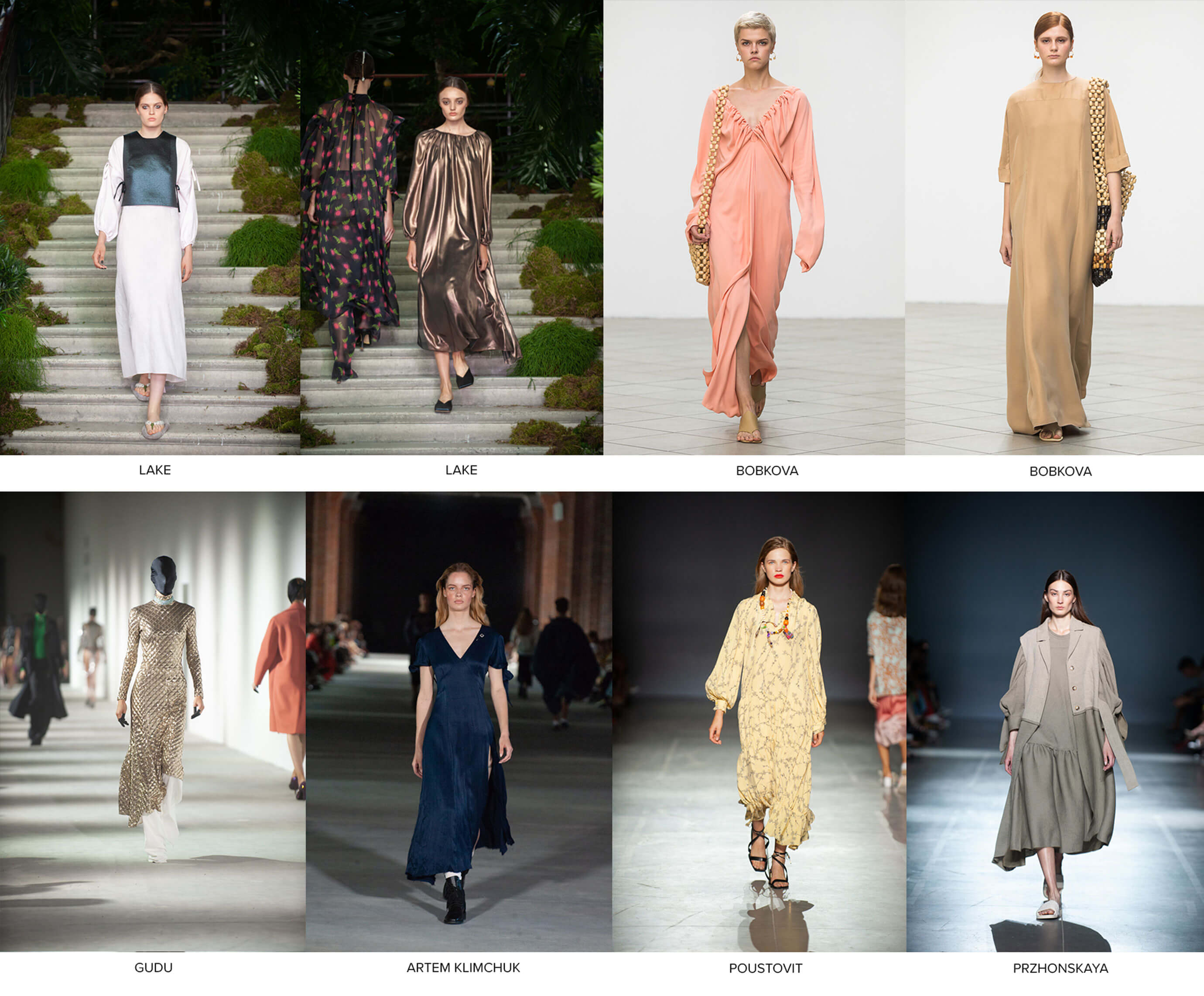 Вариации на тему заимствования элементов мужского гардероба, а порой и явной его трансформации в женский и наоборот, представили Кристина Бобкова, Finch, Przhonskaya, Poustovit, Dafna May и Елена Буренина: элегантные костюмы-двойки, свободного силуэта пиджаки, брюки и шорты-бермуды хочется надеть и отправиться навстречу приключениям. Для приключений романтического характера в коллекциях Артёма Климчука, Ивана Фролова, Arutiunova, Katerina Kvit можно найти полупрозрачные тренчи, блузы, джемперы и соблазнительные платья-дезабилье. А одна из самых интересных тенденций — модерные 20-е. Платья миди и макси свободных силуэтов, томная, драматическая роскошь и лёгкий налёт ретрофутуризма прослеживаются у Lake, Finch, Gudu, Katerina Rutman, Przhonskaya, Frolov. В коллекцию Poustovit и Katerina Kvit вошли повседневные вариации на тему богемных 20-х с отсылками к морскому побережью, атмосфере легкости и творческой свободы.