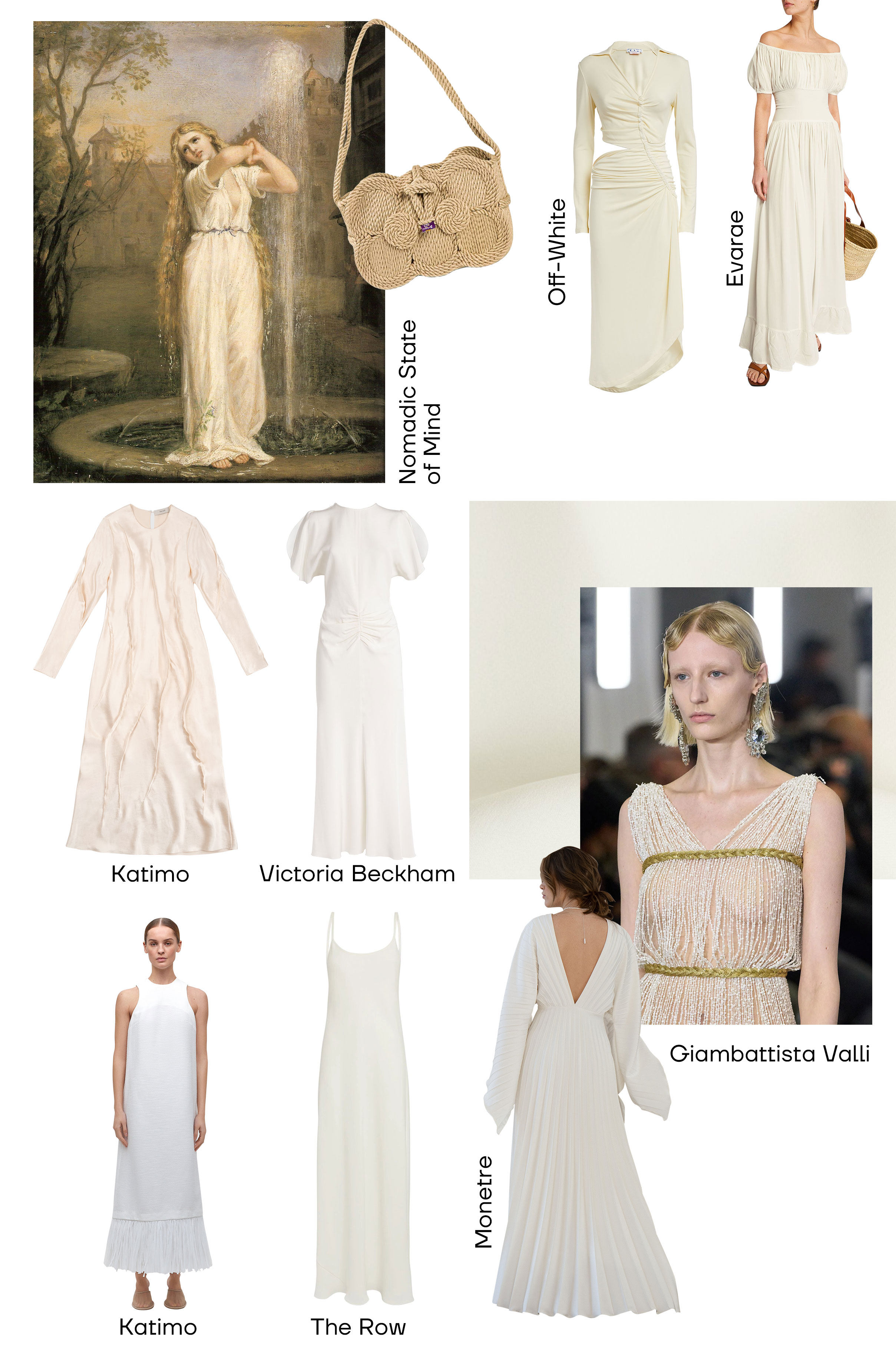 Сукня Soleil pleated dress like a shell, Monetre. Сукня, Katimo. Сукня, Off-White. Сукня, The Row. Сукня, Victoria Beckham. Джон Віл'ям Ватерхаус "Ундіна". Сукня Hestia, Evarae. Giambattista Valli Spring Summer 2023. Сумка, Nomadic State of Mind.