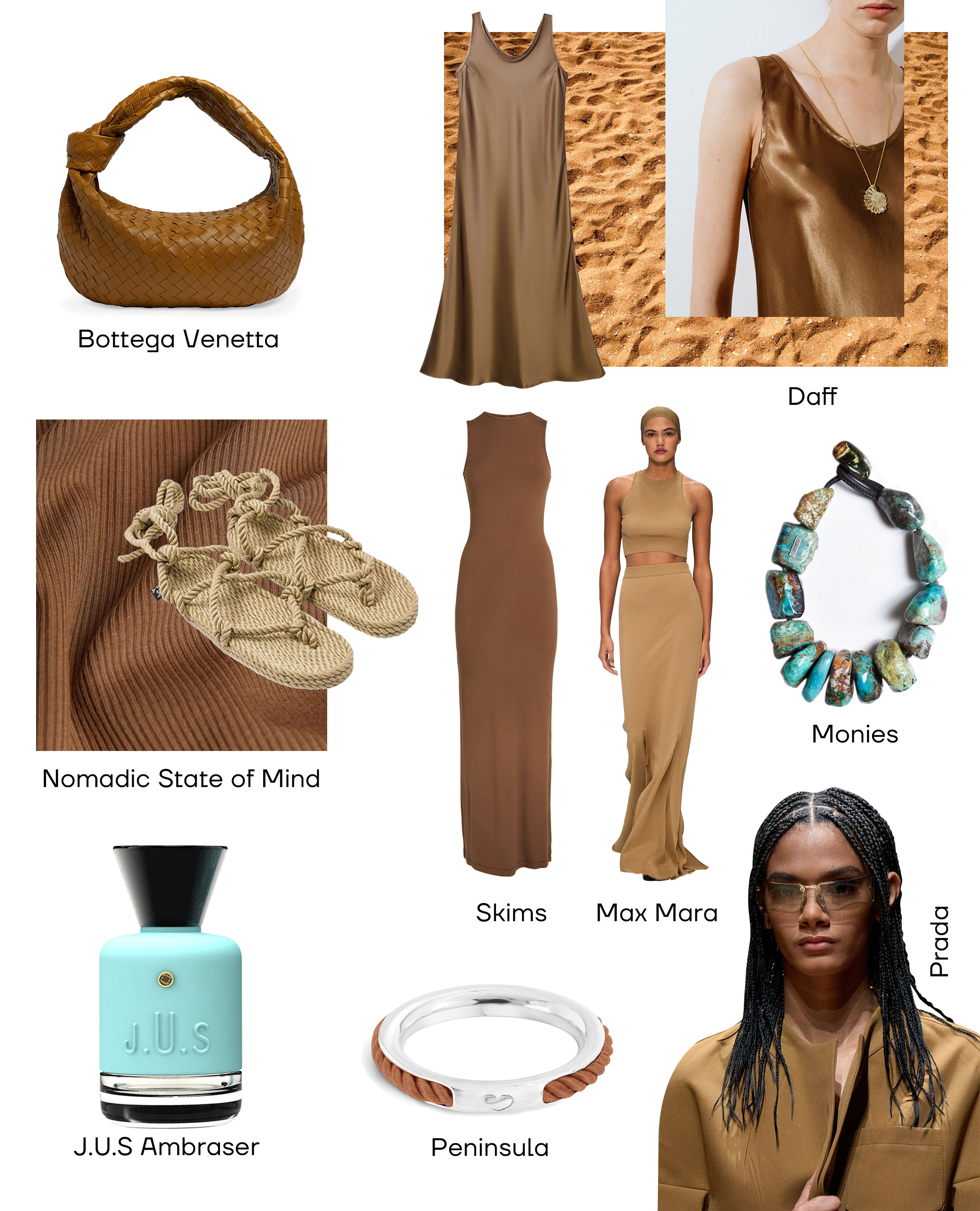 Max Mara Spring Summer 2023. Prada Spring Summer 2023. Сукня, Daff. Сумка, Bottega Venetta. Намисто, Monies. Сукня, Skims. Каблучка "Omega", Peninsula. Сандалії Romano Camel, Nomadic State of Mind