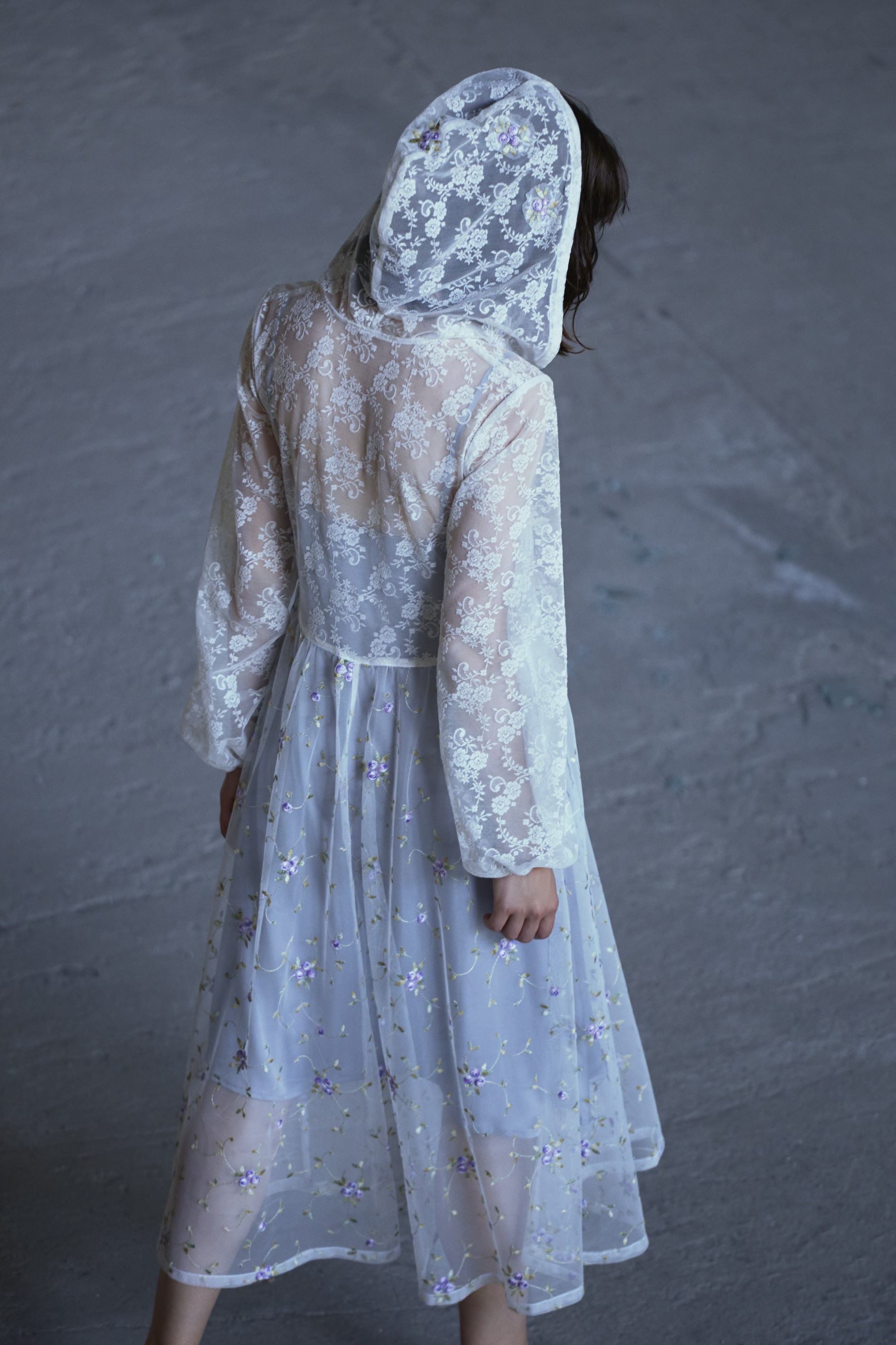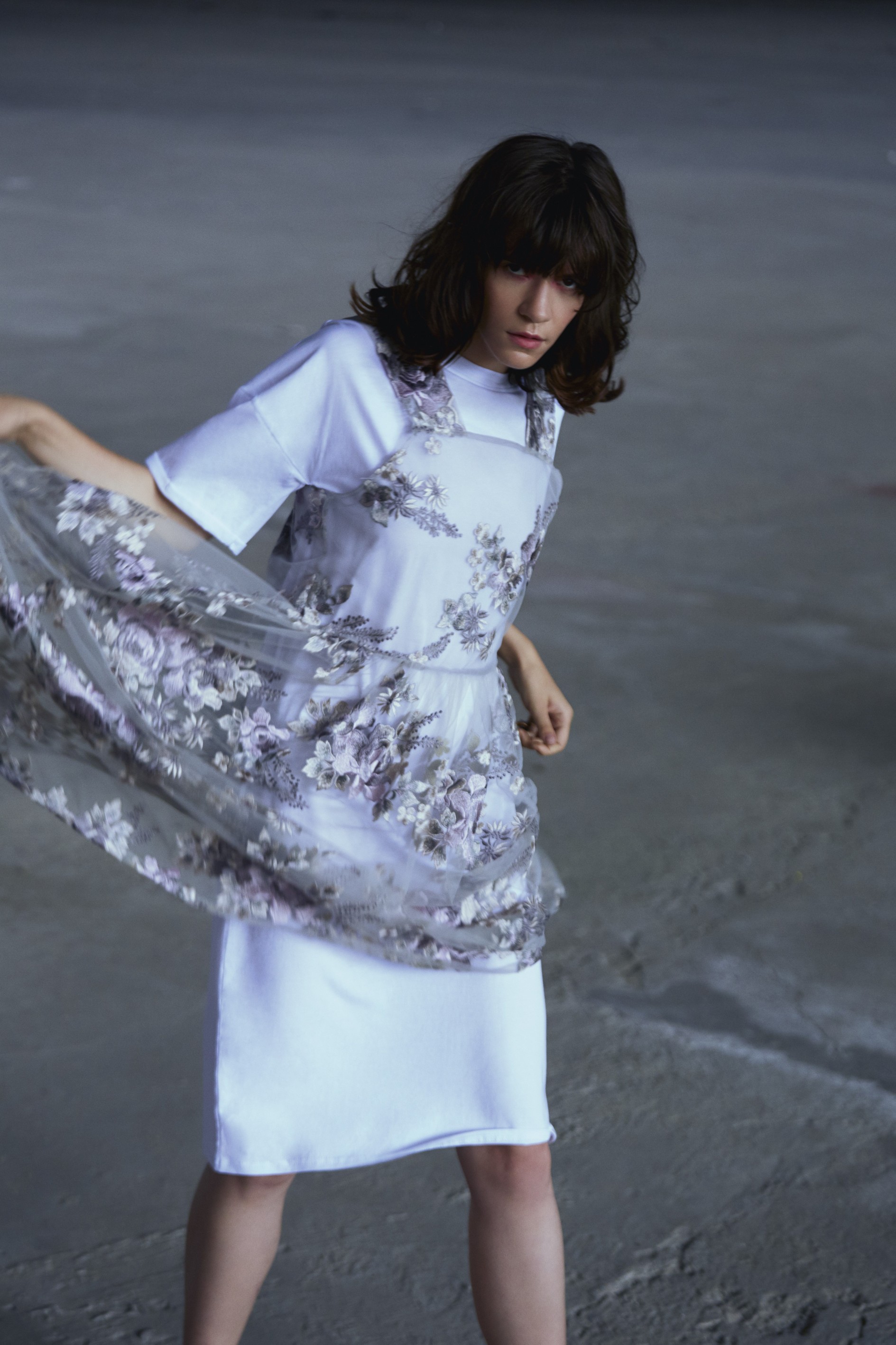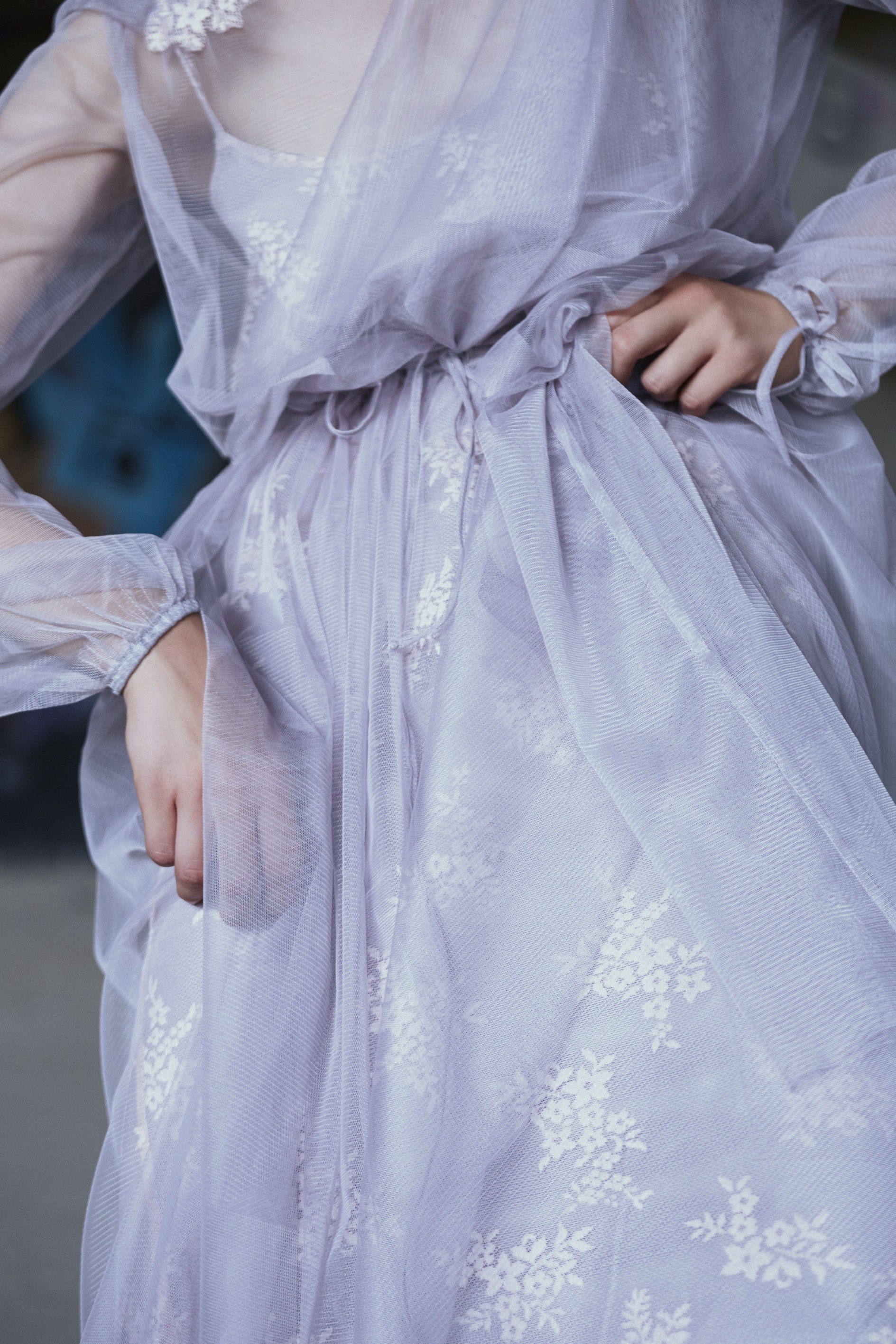 Главный изобразительный образ — цветочный орнамент, который разрастается по нежному кружеву и шифону. Дизайнер рассказывает, что для нее цветы олицетворяют женственность и загадочность каждой женщины.