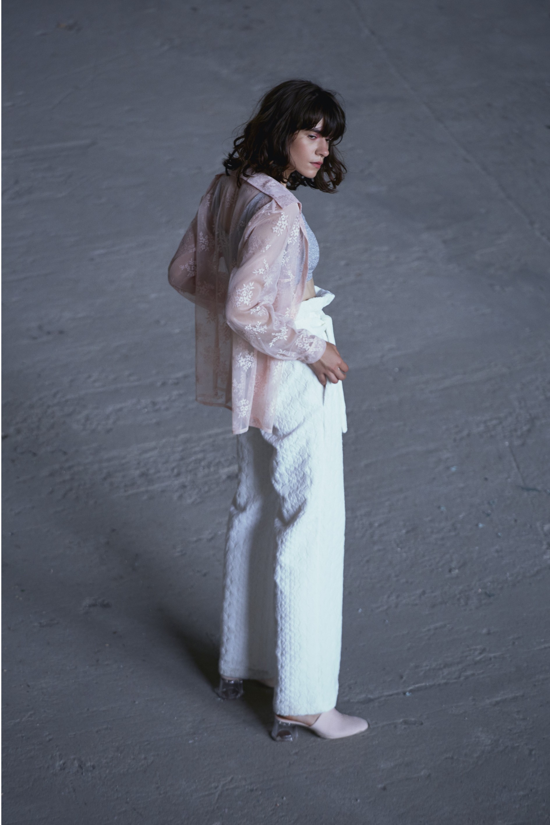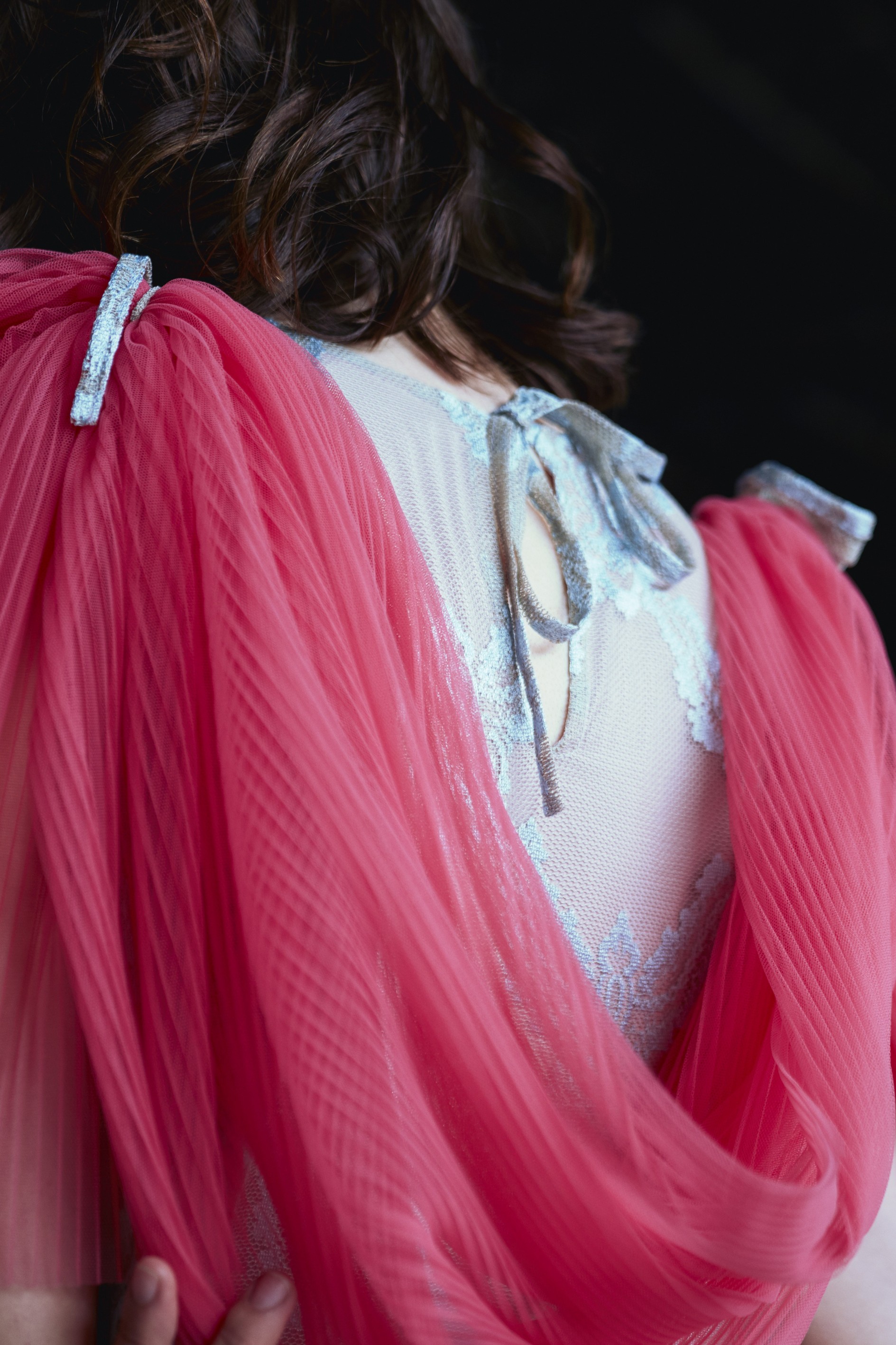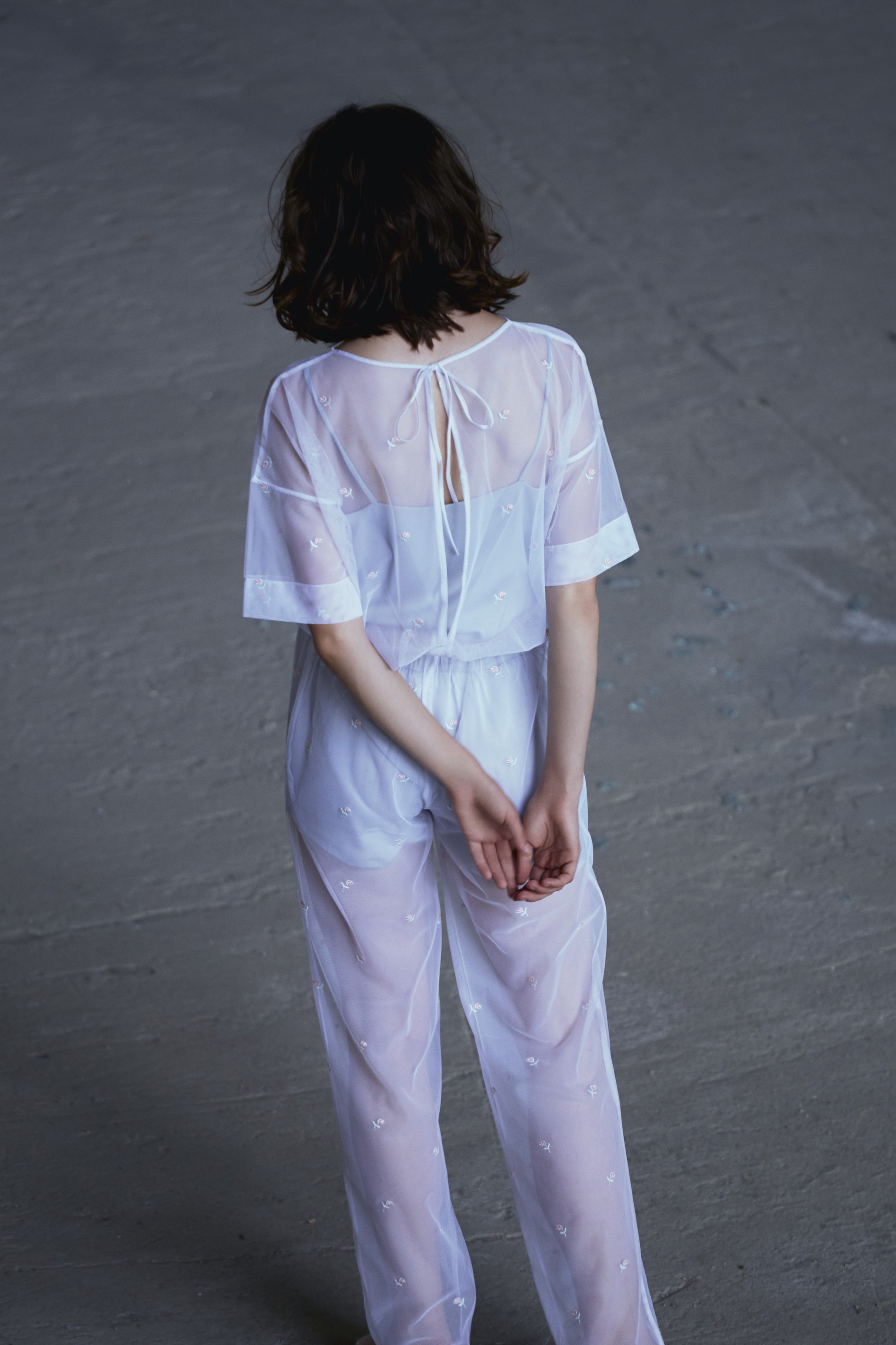 Главный изобразительный образ — цветочный орнамент, который разрастается по нежному кружеву и шифону. Дизайнер рассказывает, что для нее цветы олицетворяют женственность и загадочность каждой женщины.
